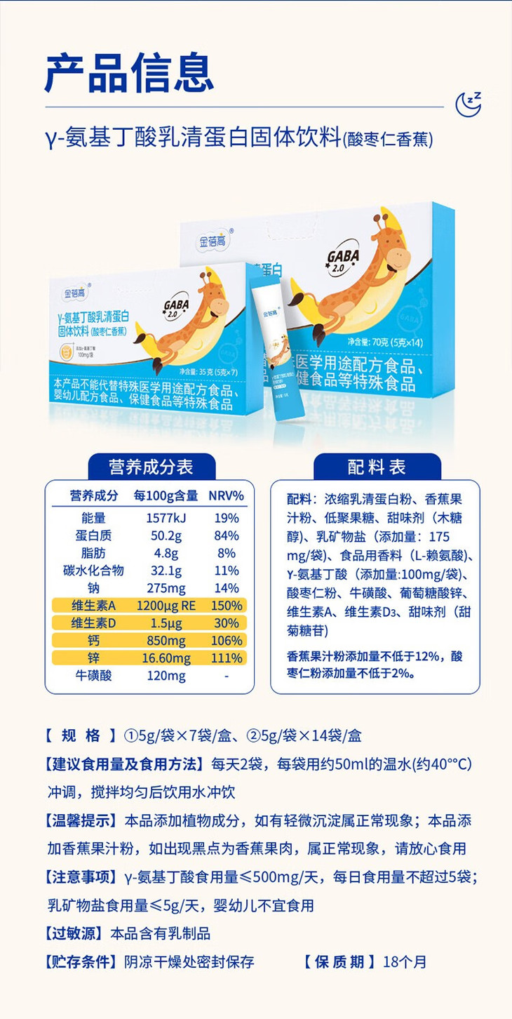 睡得好,长的高 【γ-氨基丁酸乳清蛋白固体饮料】酸枣仁香蕉味(70g(5g*14))/盒