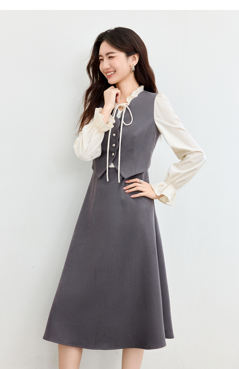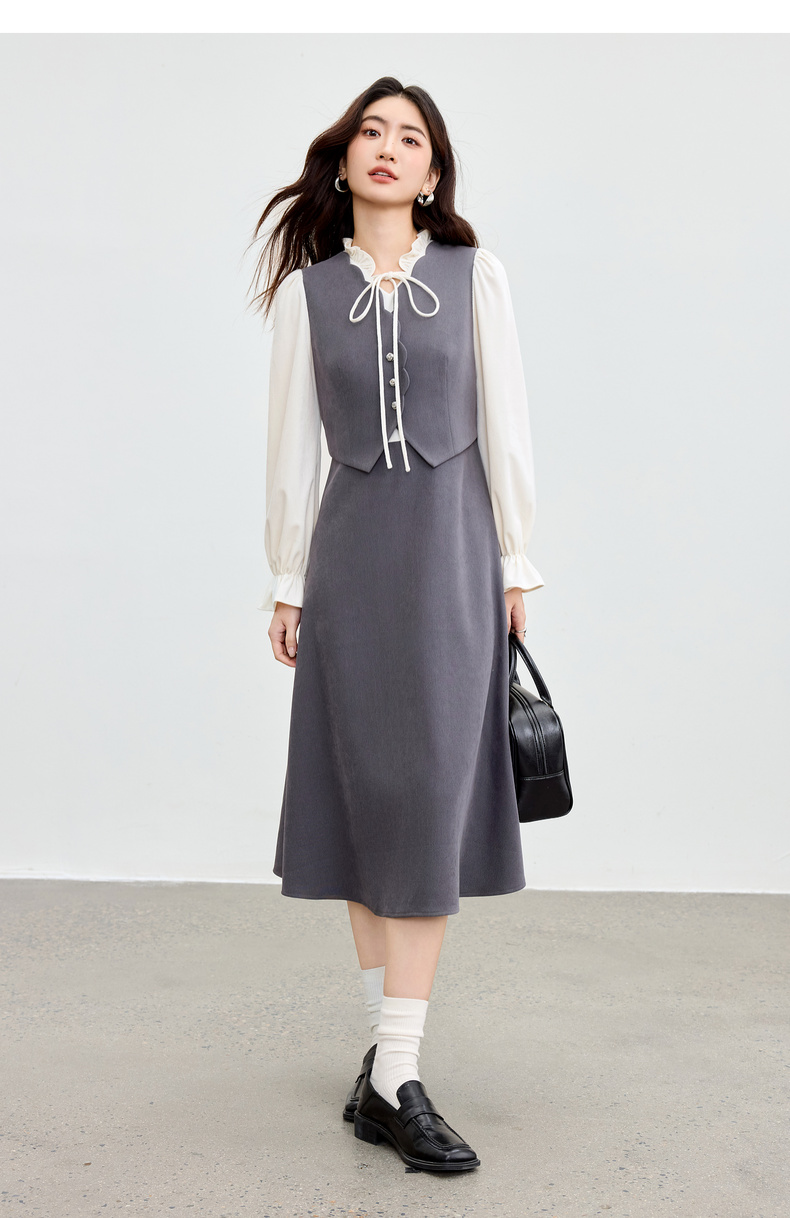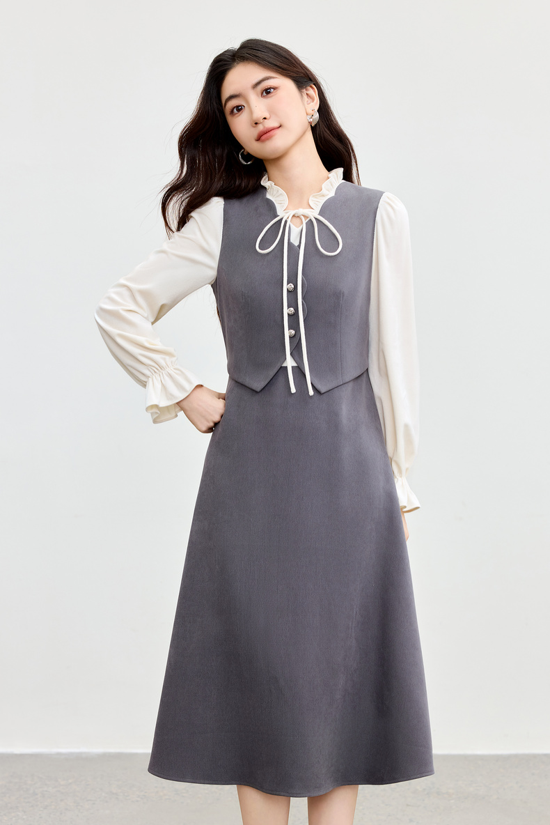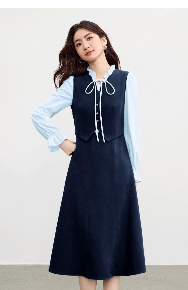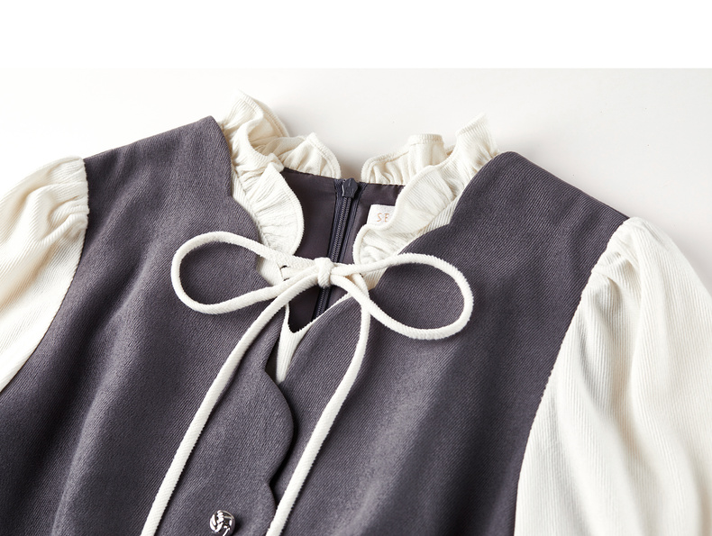 【内购】【拼接连衣裙】都市荷叶领系带泡泡袖上身马甲拼接X型收腰裙-153LA3120