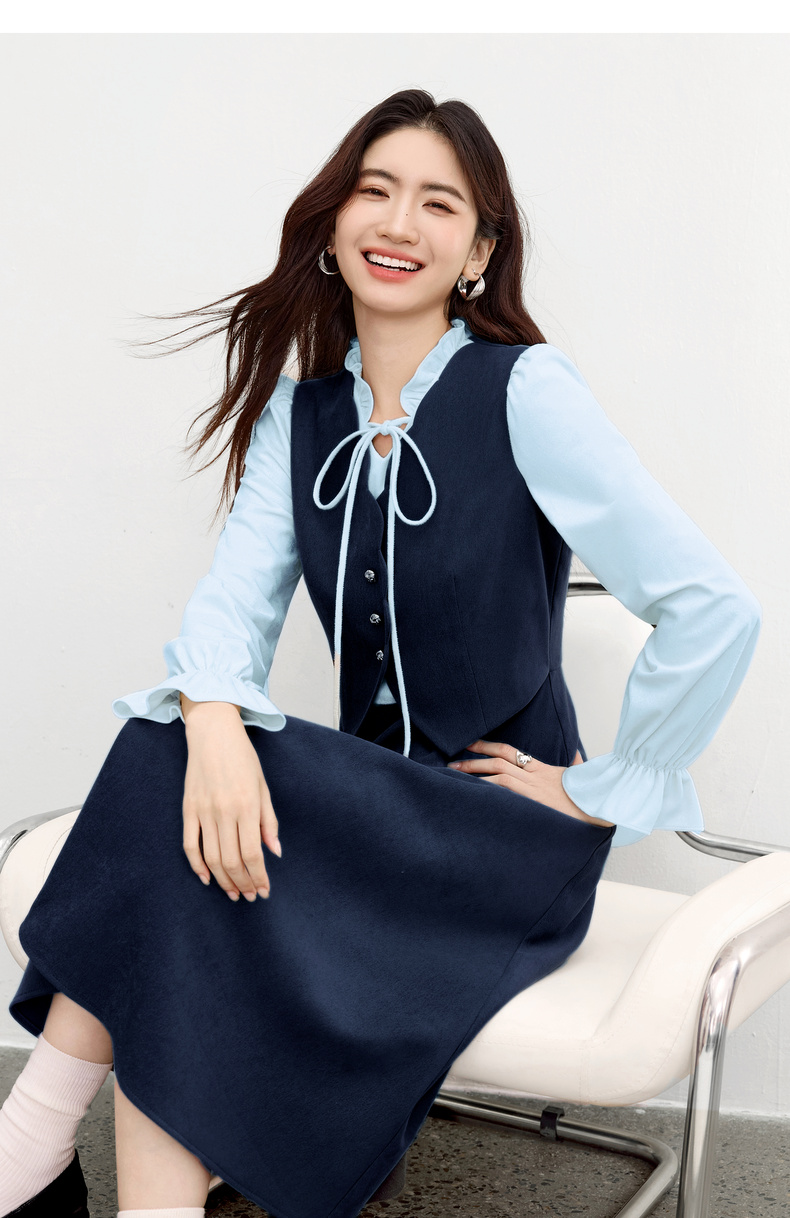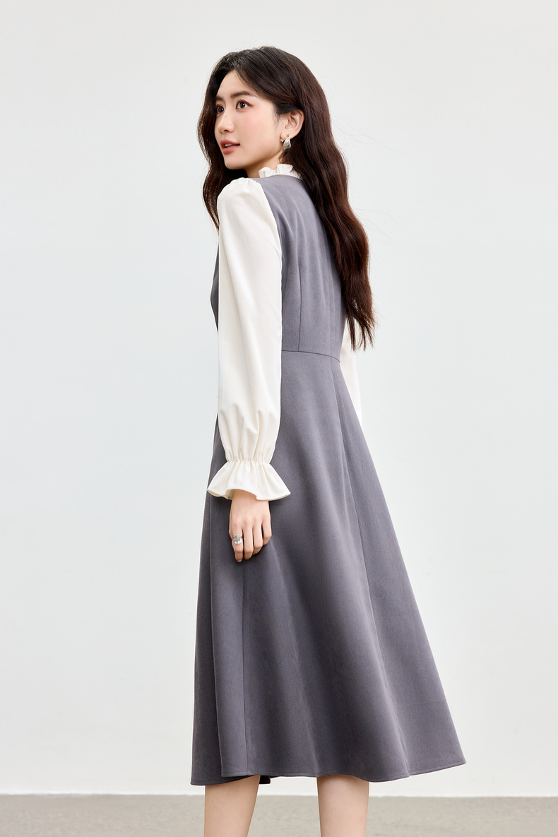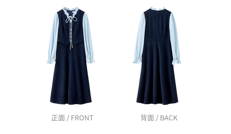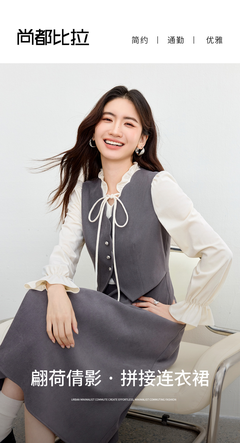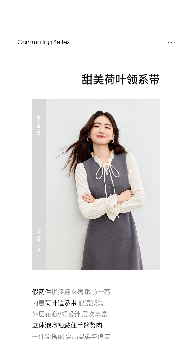 【内购】【拼接连衣裙】都市荷叶领系带泡泡袖上身马甲拼接X型收腰裙-153LA3120