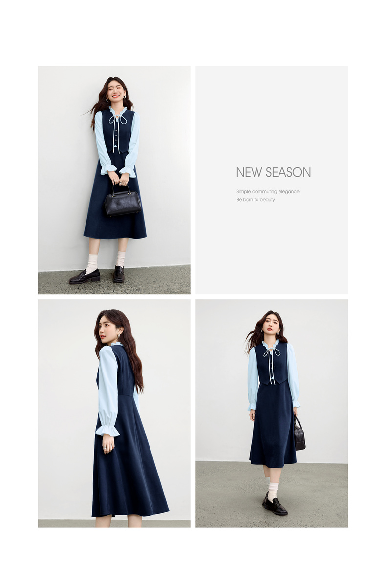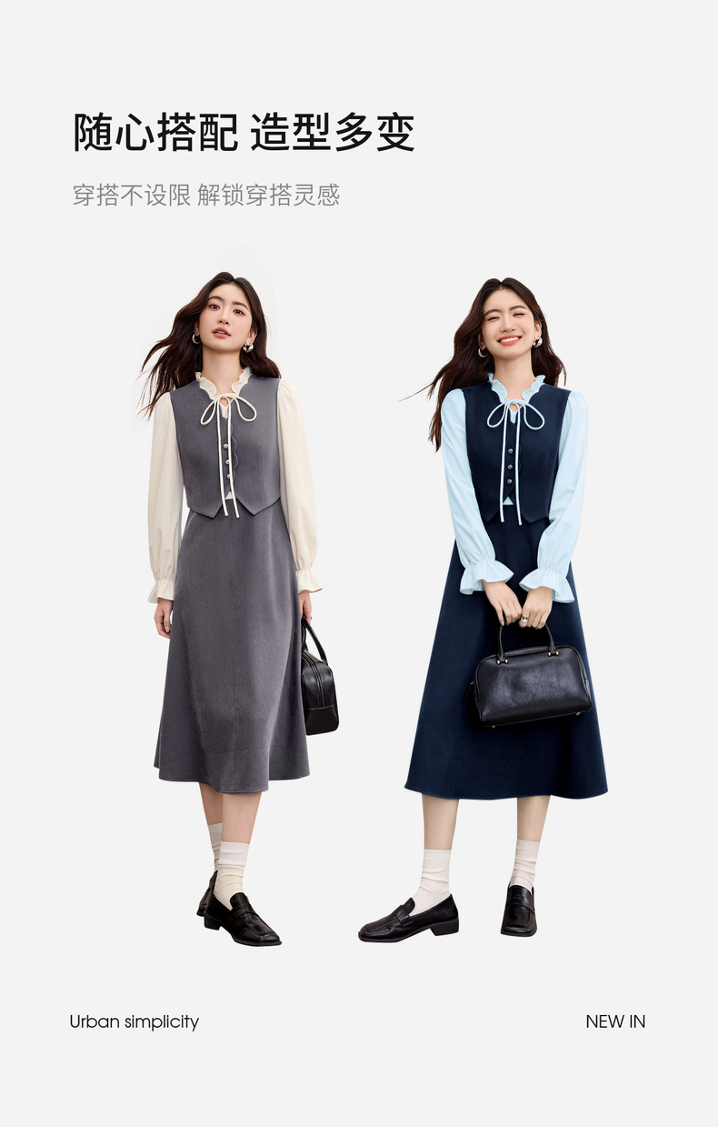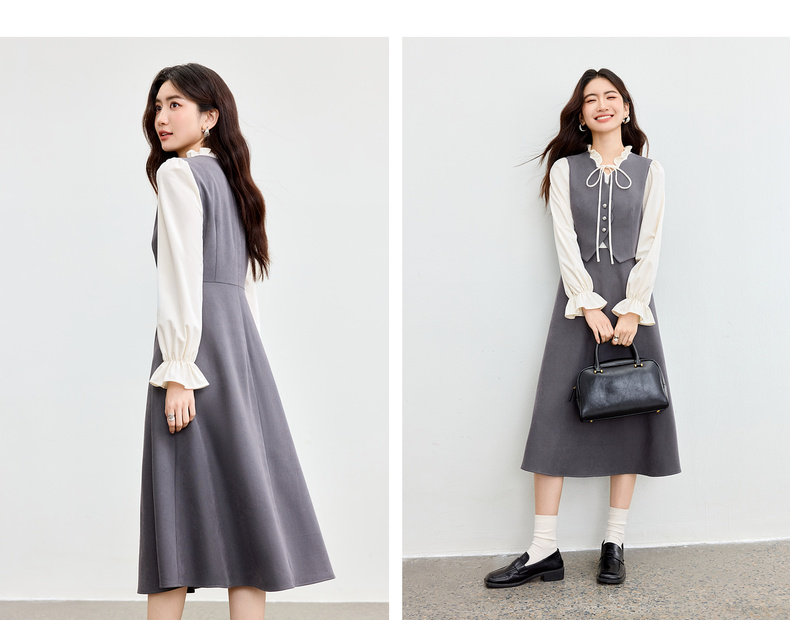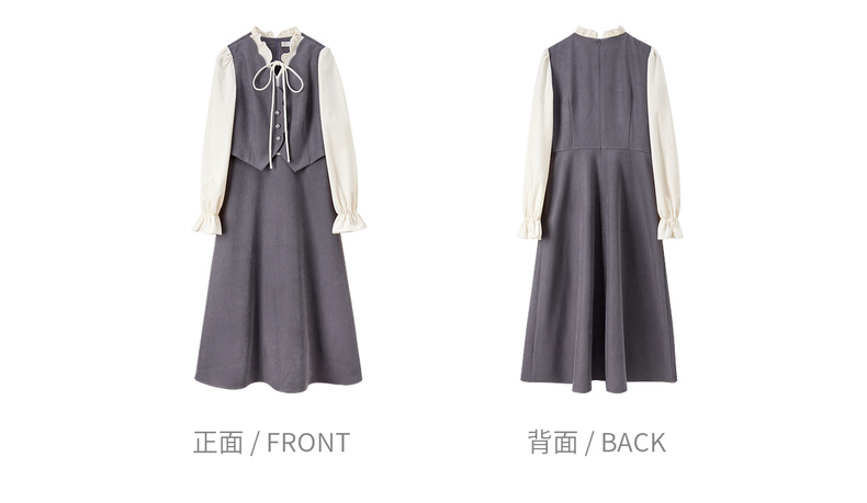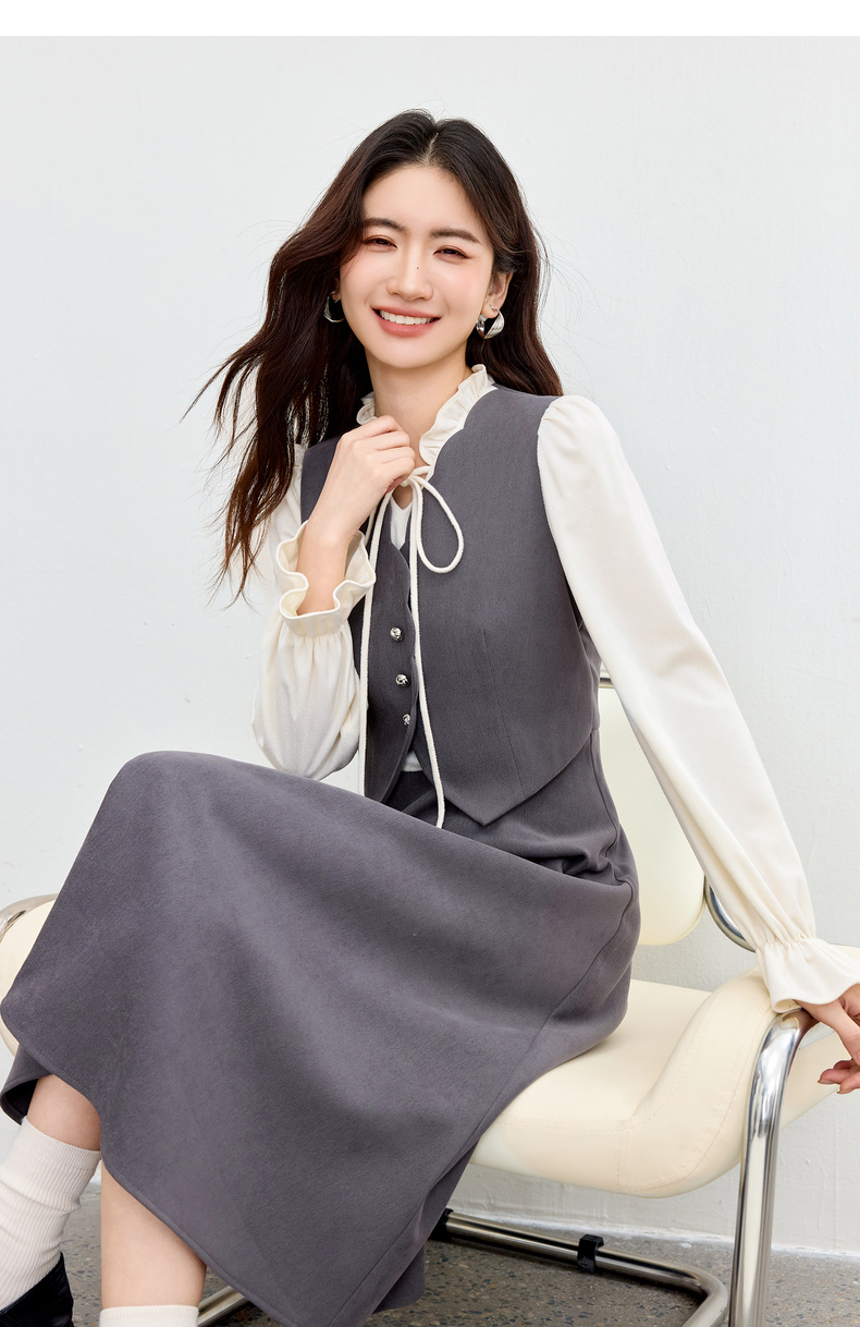 【内购】【拼接连衣裙】都市荷叶领系带泡泡袖上身马甲拼接X型收腰裙-153LA3120