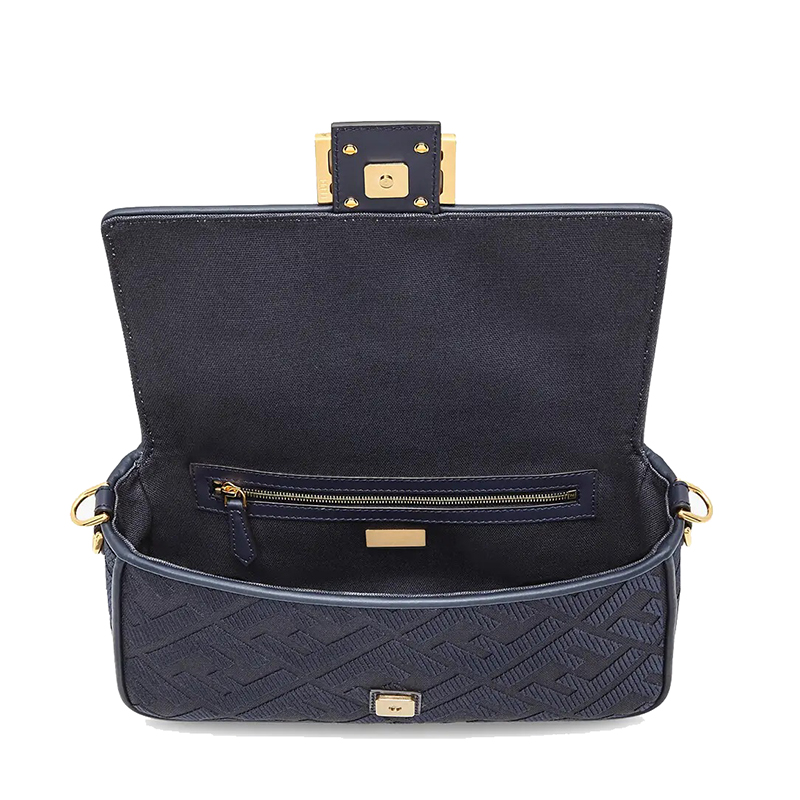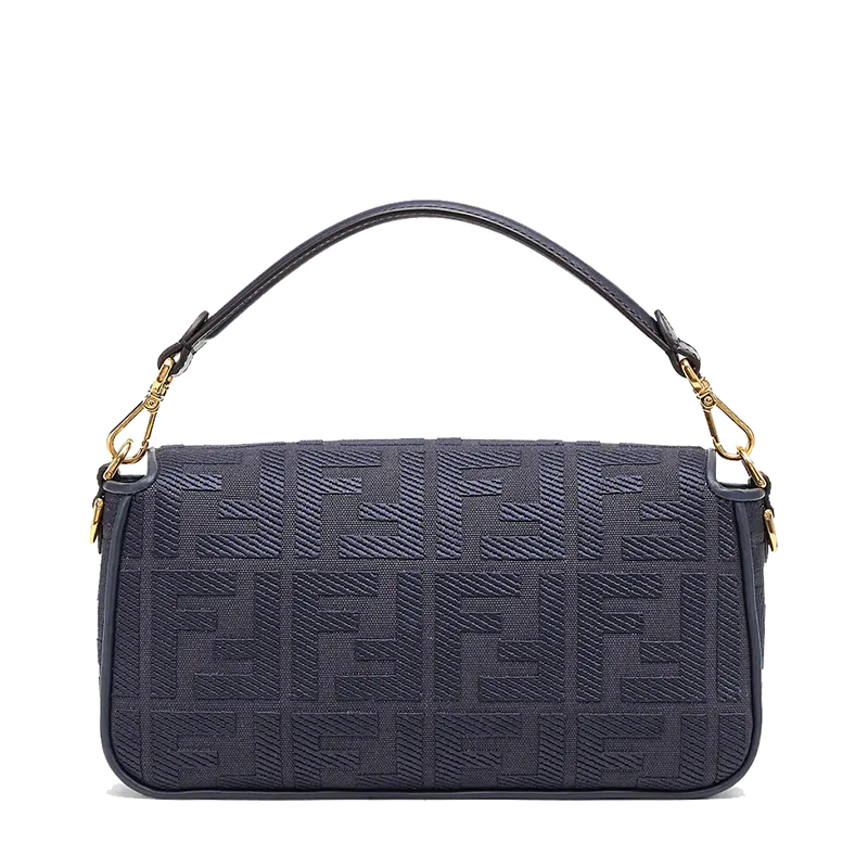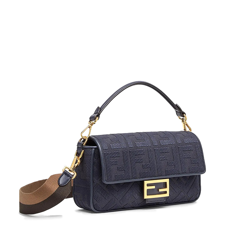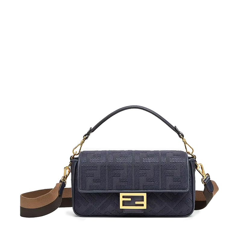 标志性的中号 Baguette 手袋,采用深蓝色帆布制成,饰有同色系刺绣 FF 图案,搭配皮革和 FF 搭扣。