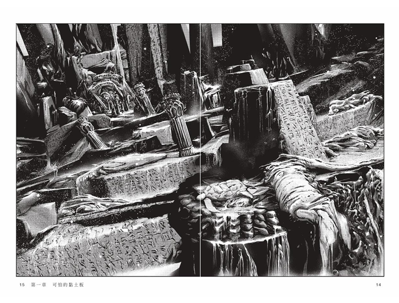上頭有從未見過的奇特文字,以及外型詭異的不知名生物的雕像。