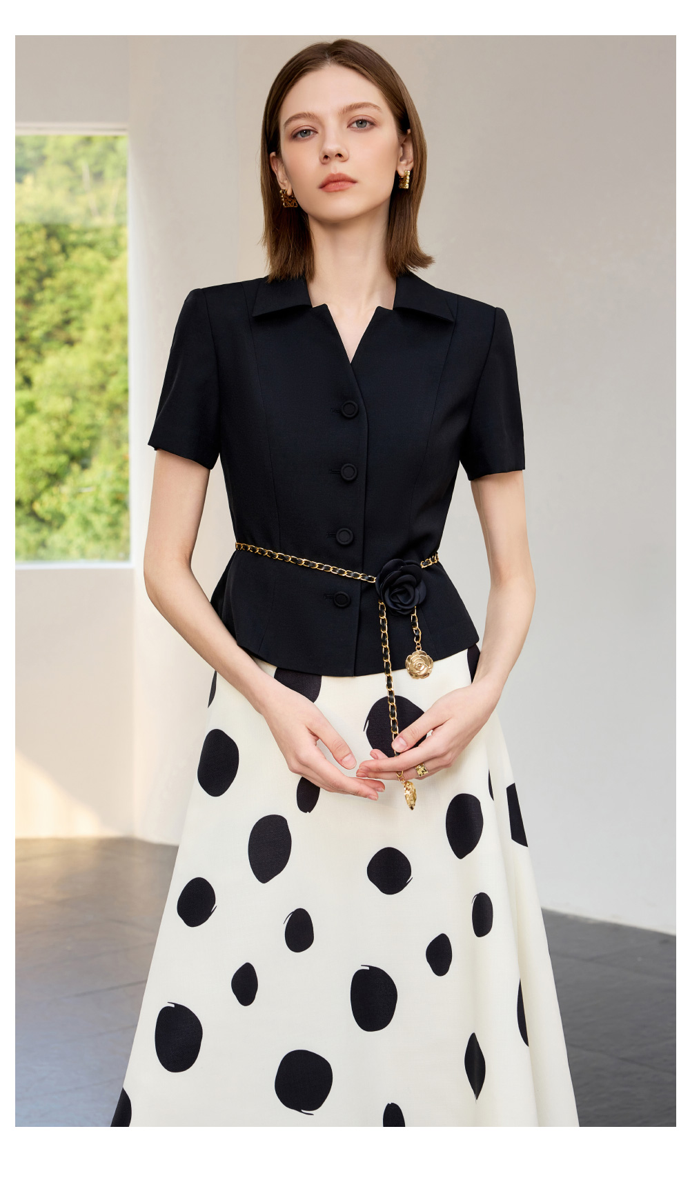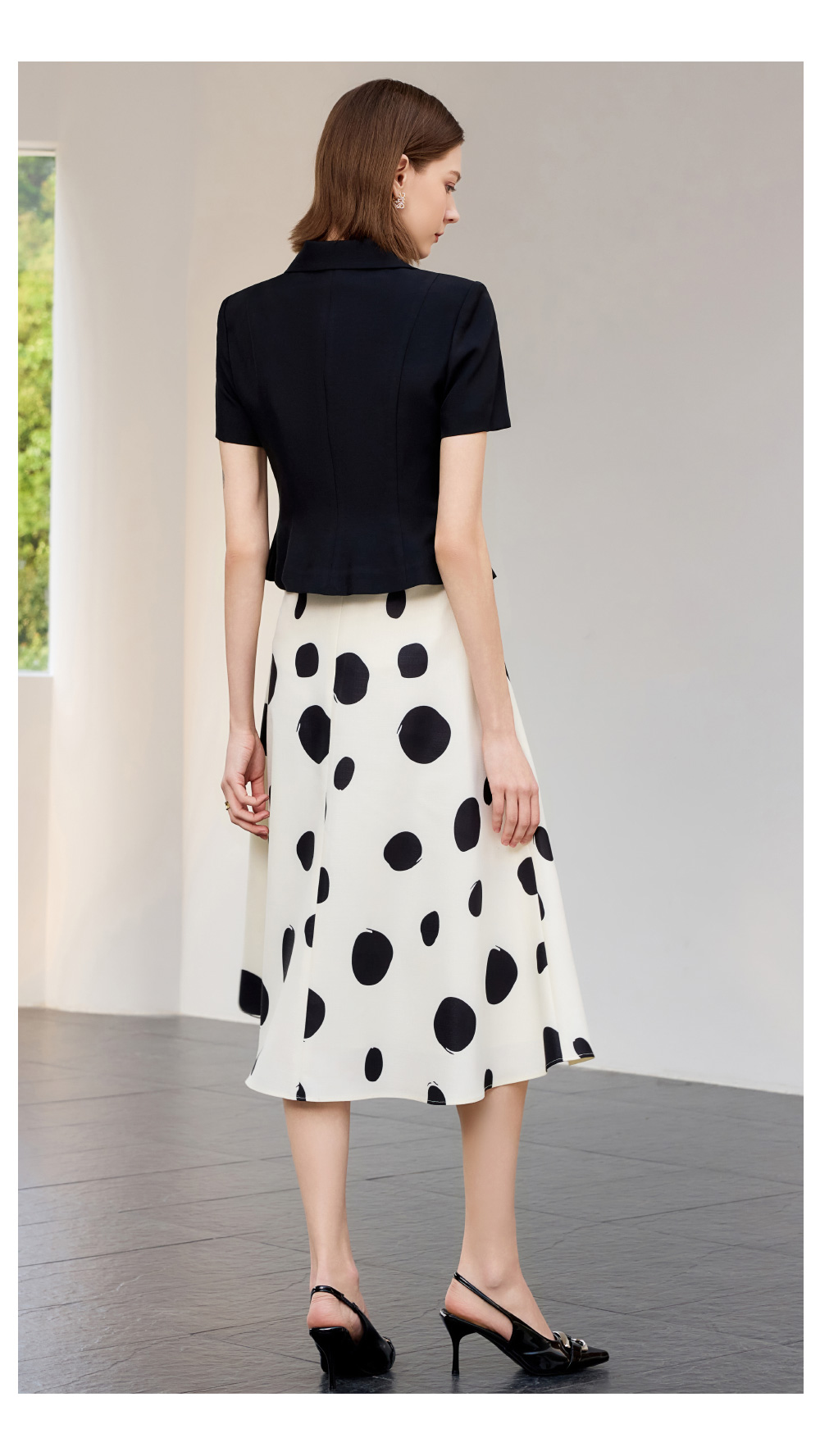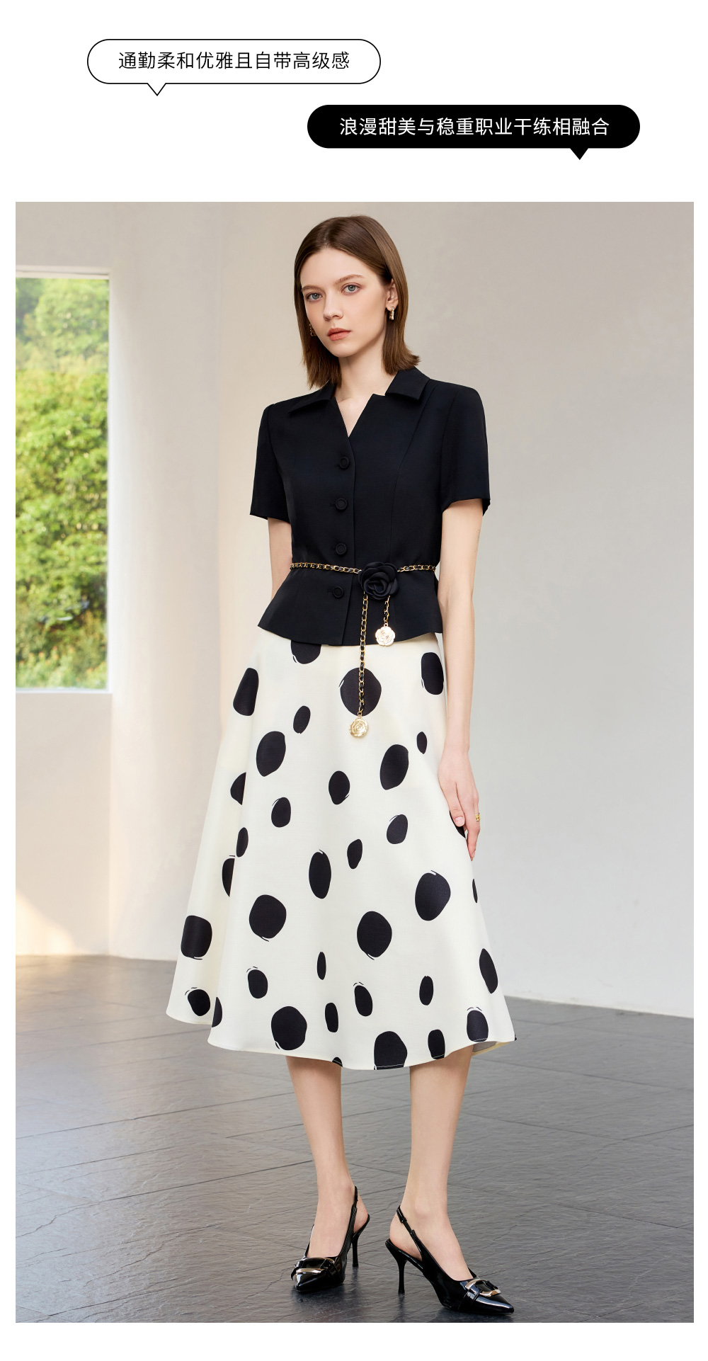 IWY/知性气质_黑色利落剪裁短袖西装女神范波点半身裙两件套CS2295