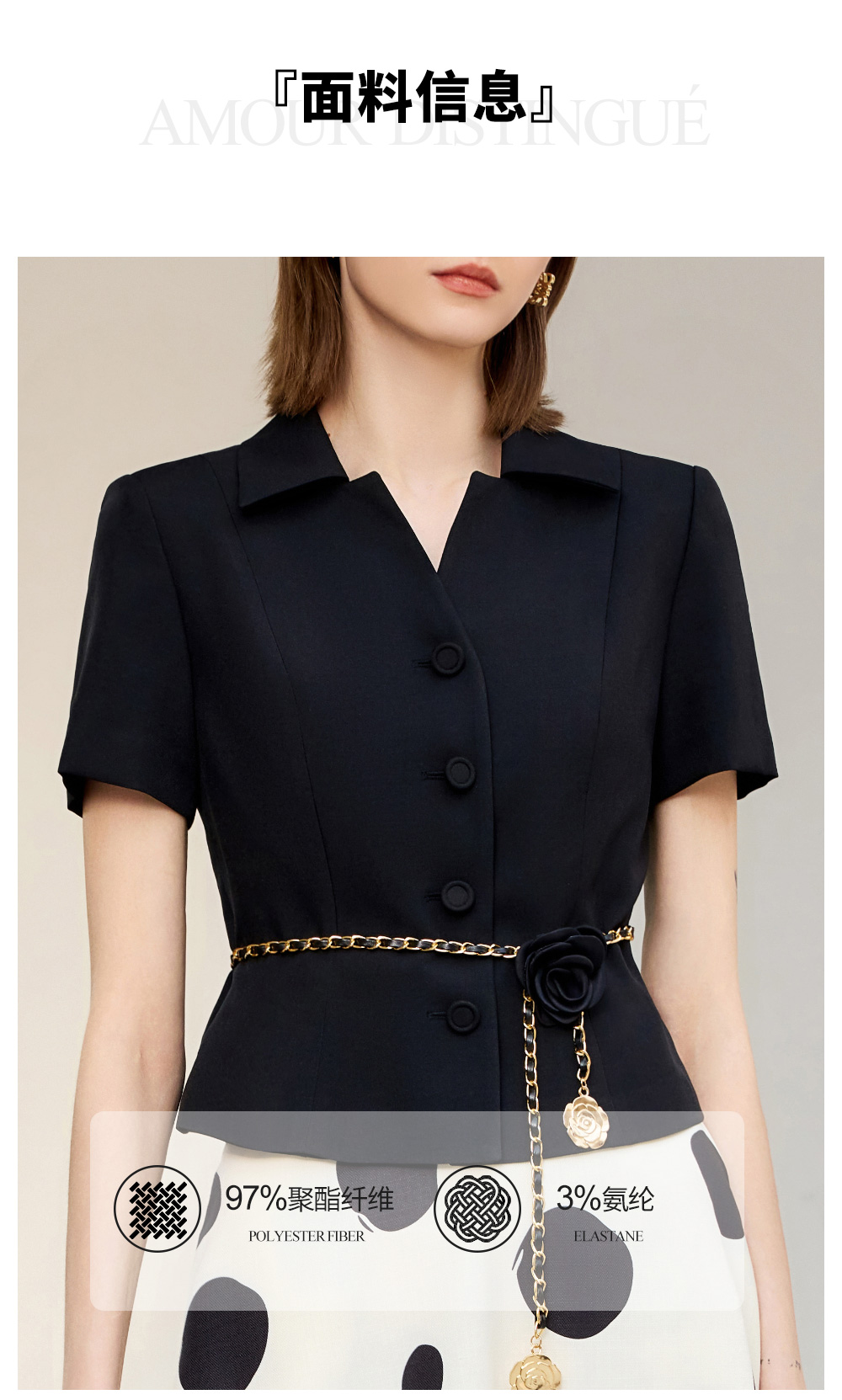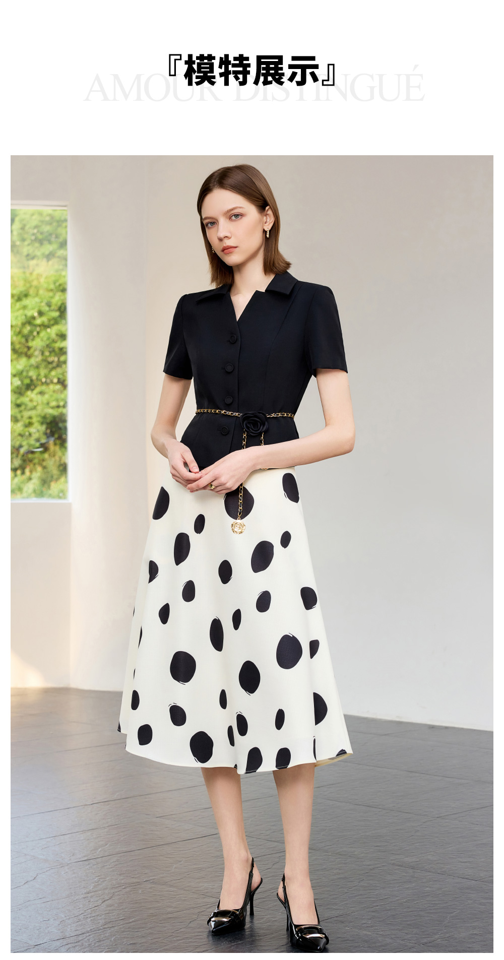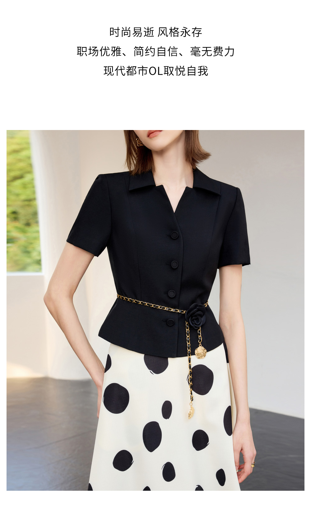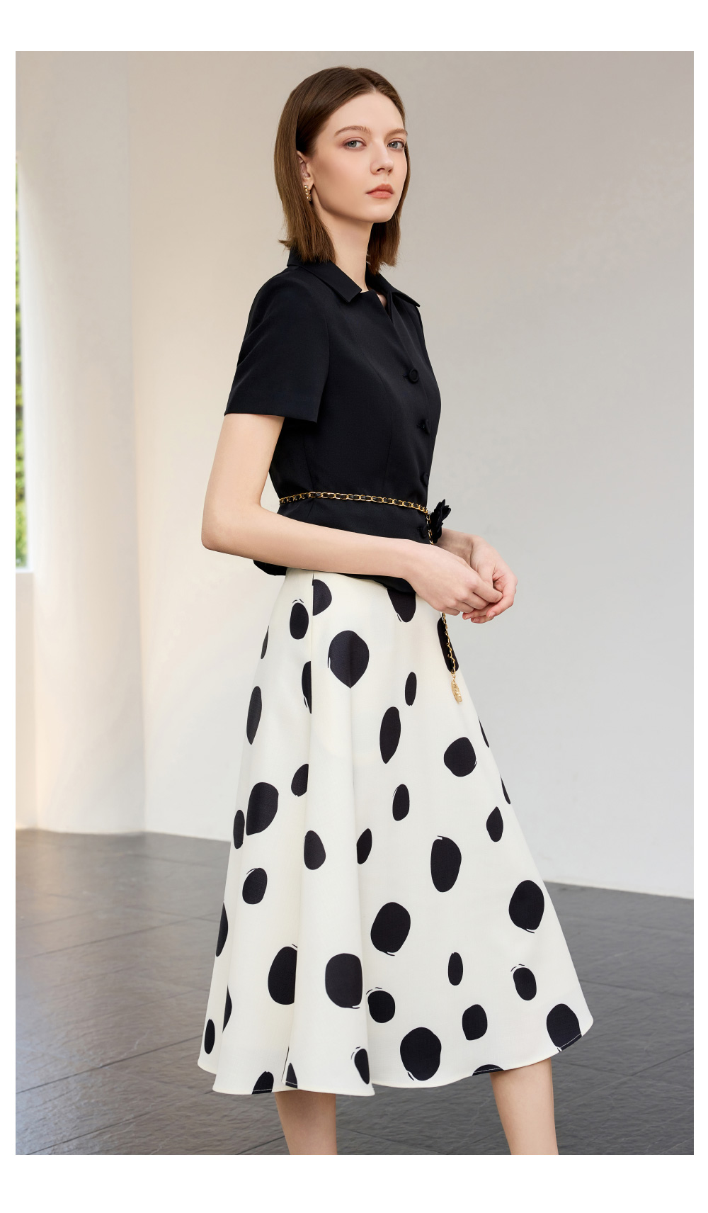 IWY/知性气质_黑色利落剪裁短袖西装女神范波点半身裙两件套CS2295
