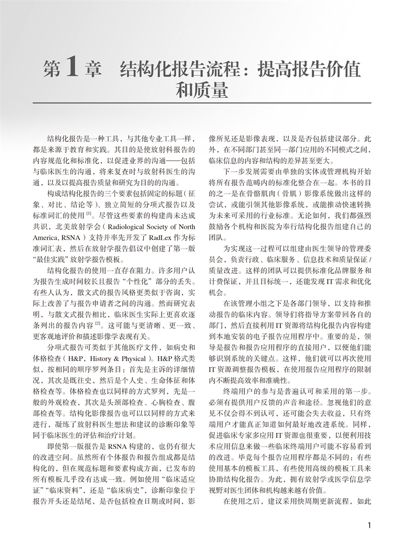 本书采用图文并茂的形式讲述了骨骼肌肉系统各种病变的MRI特征以及如何填写结构化报告。每一章着眼于一个特定的关节或主题,通过列表展示了各个部位的结构化报告模板,并对模板中的每一部分内容都展开了详尽的讲解,以便读者能更深入地理解正常解剖和疾病表现,从而更准确、实用地填写结构化报告。本书内容简洁、重点突出、方便学习,对于放射科、骨科、运动医学科等相关科室的医师、研究生、放射科技师及其他相关专业从业人员和爱好者来说,都是非常有价值的参考书。