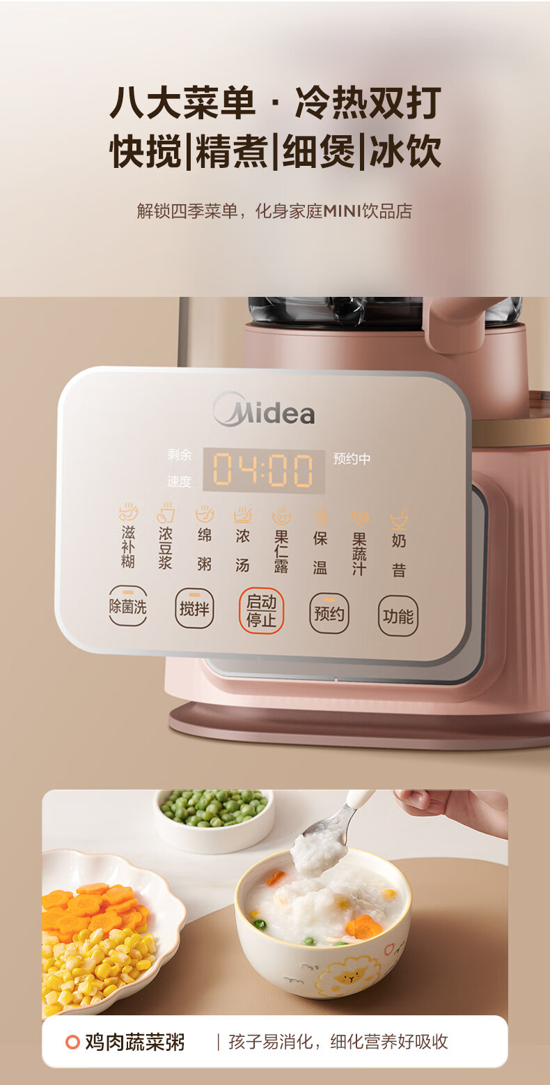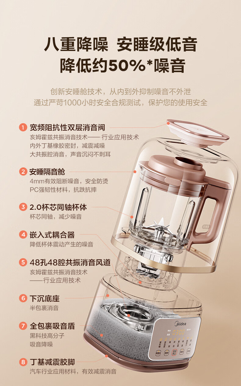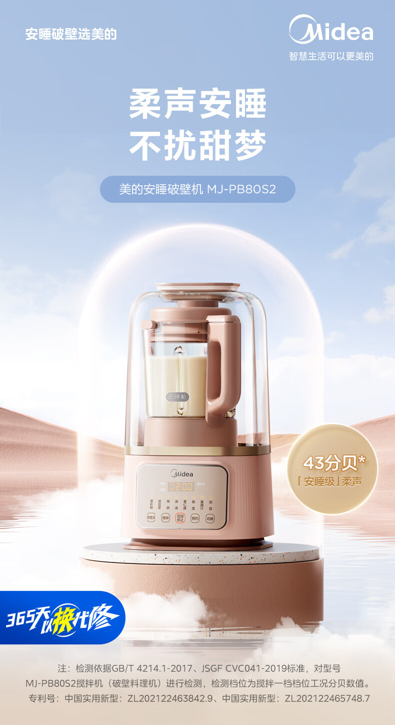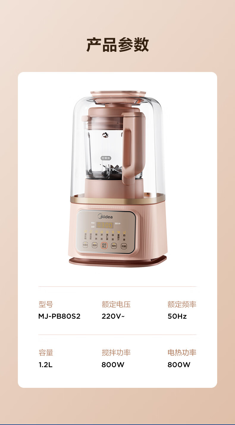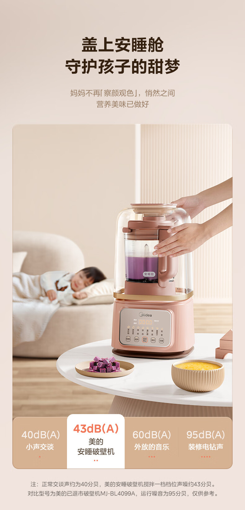 美的(Midea)低音破壁机安睡升级43dB降噪静柔音破壁豆浆机辅食料理榨汁机 MJ-PB80S2