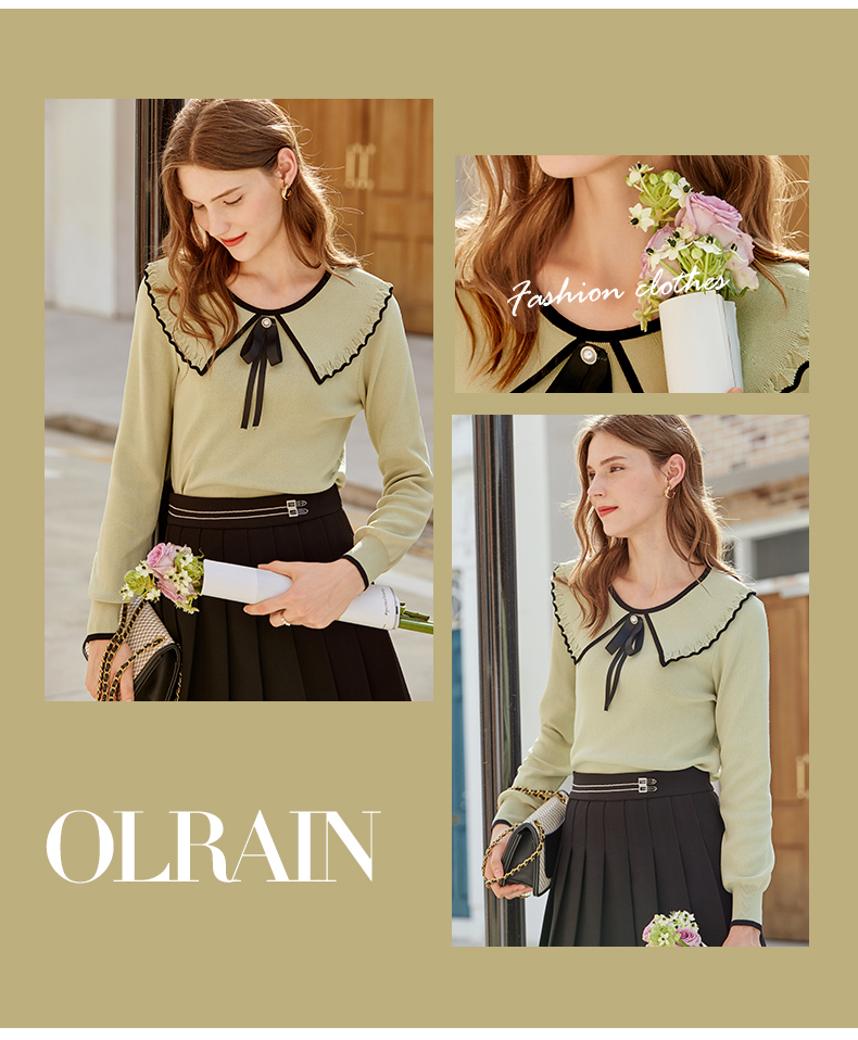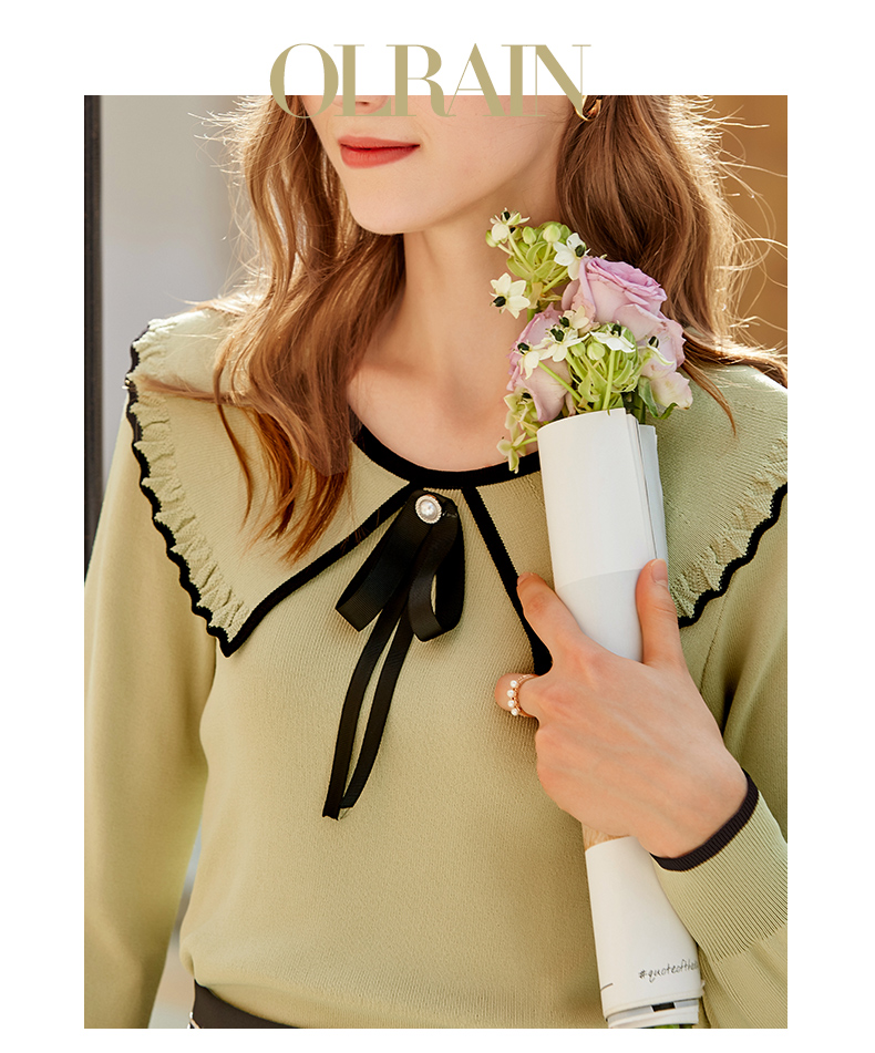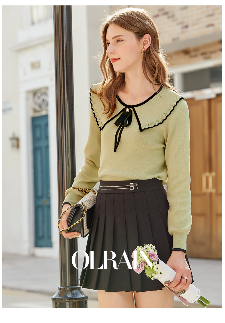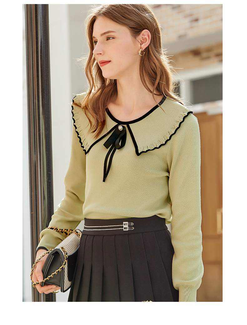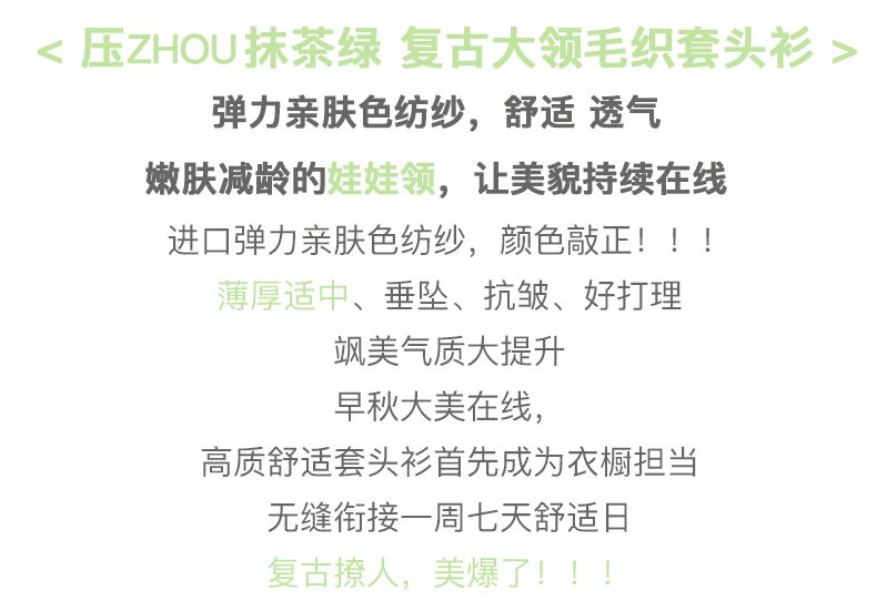 欧芮儿复古大翻领套头针织衫新款牛油果绿打底衫内搭上衣