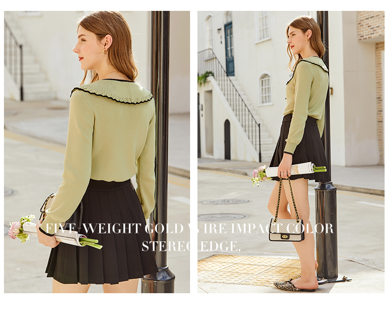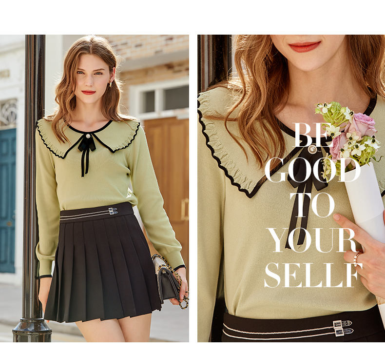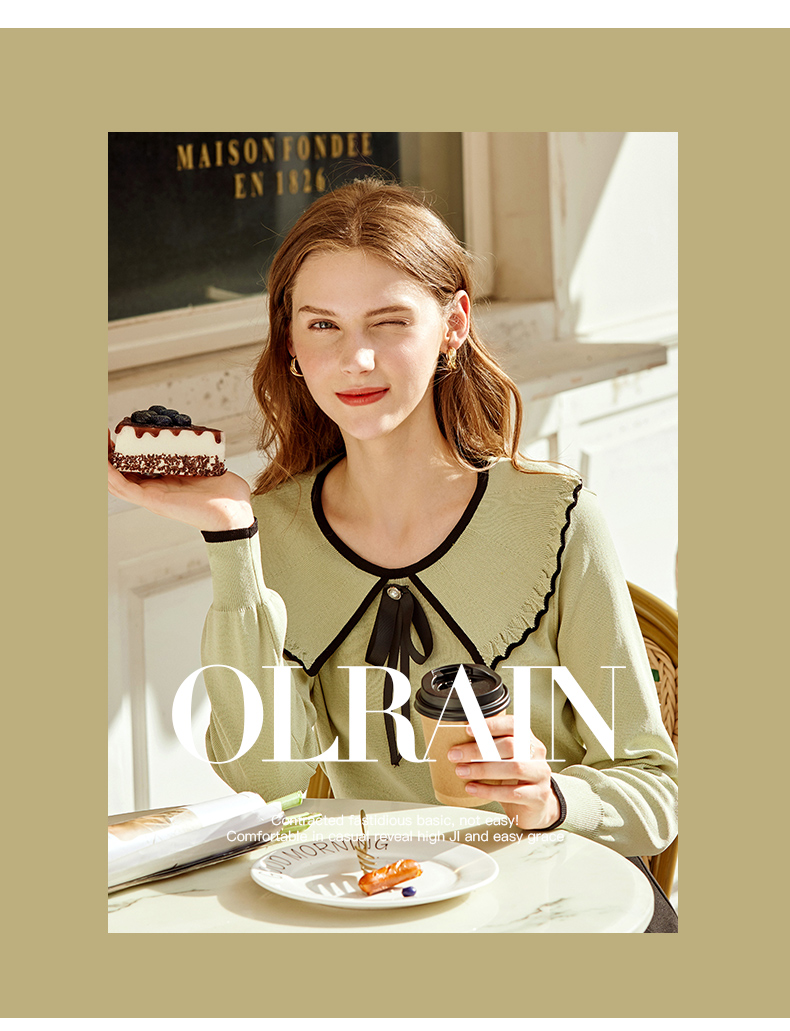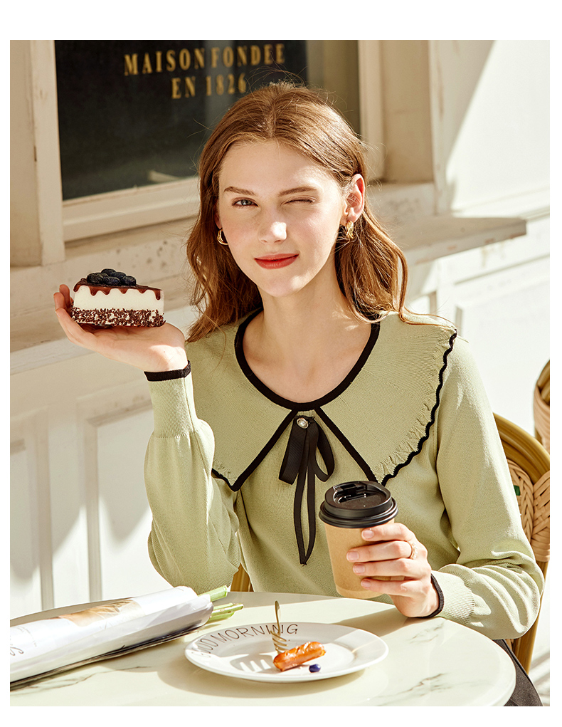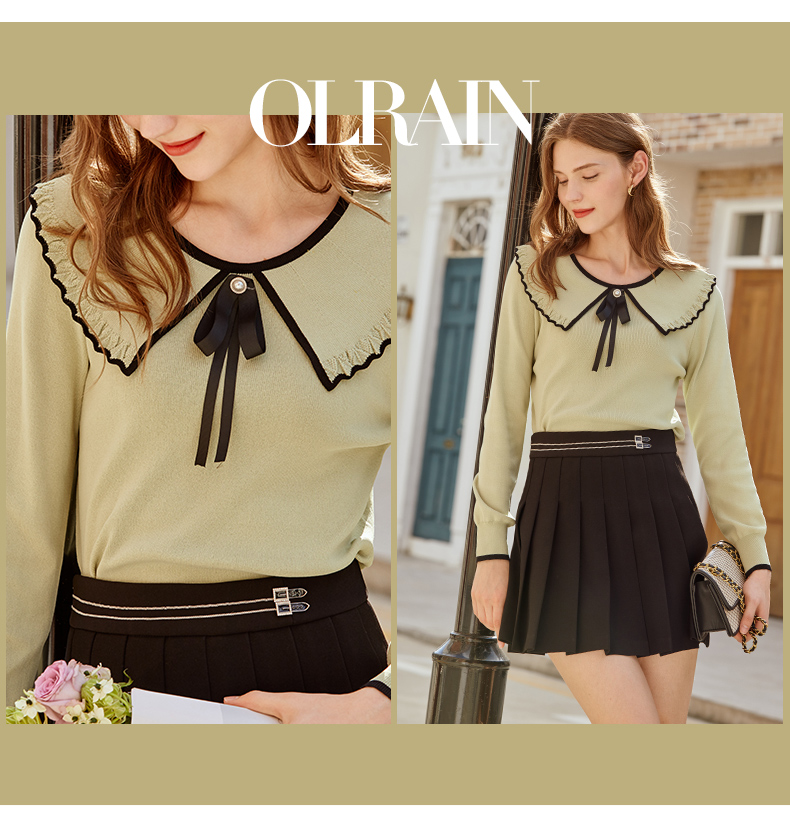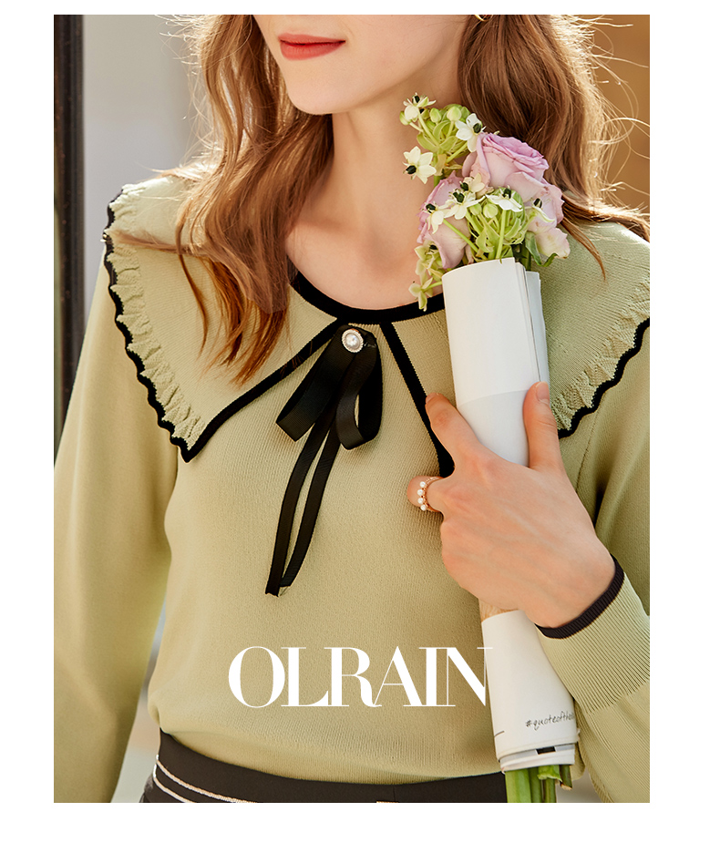 欧芮儿复古大翻领套头针织衫新款牛油果绿打底衫内搭上衣