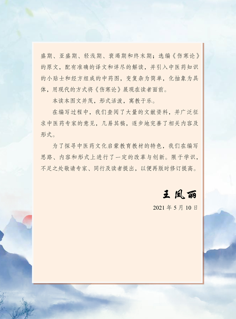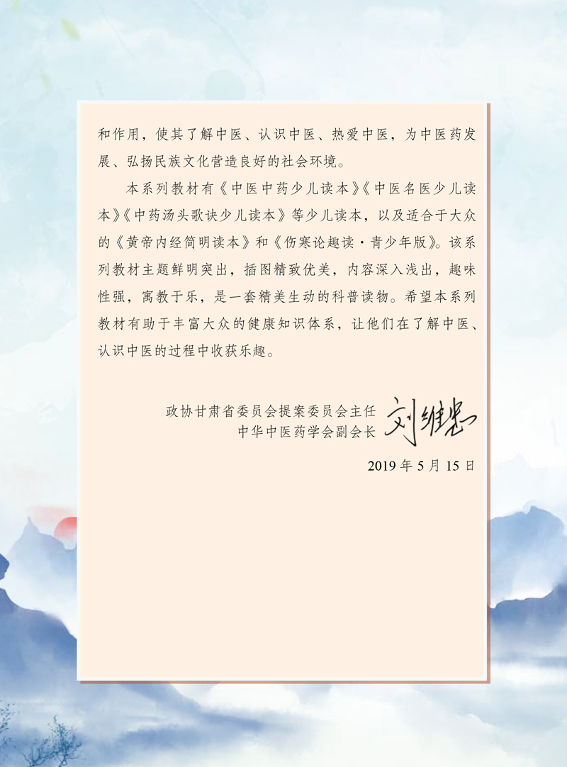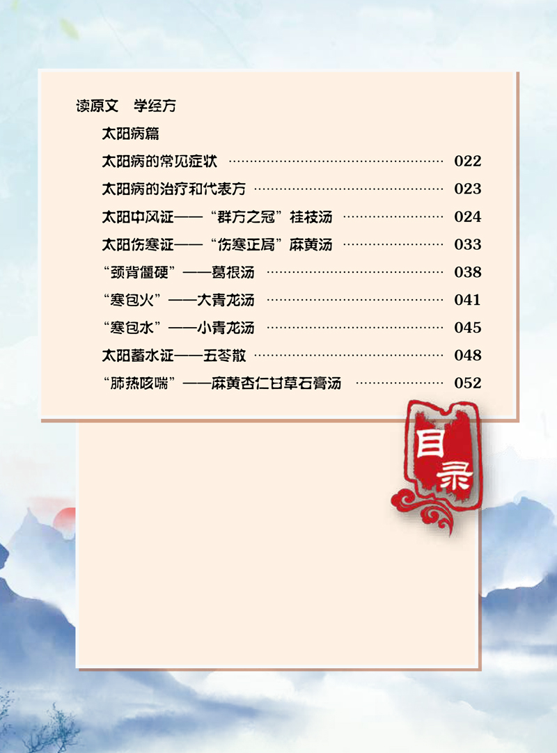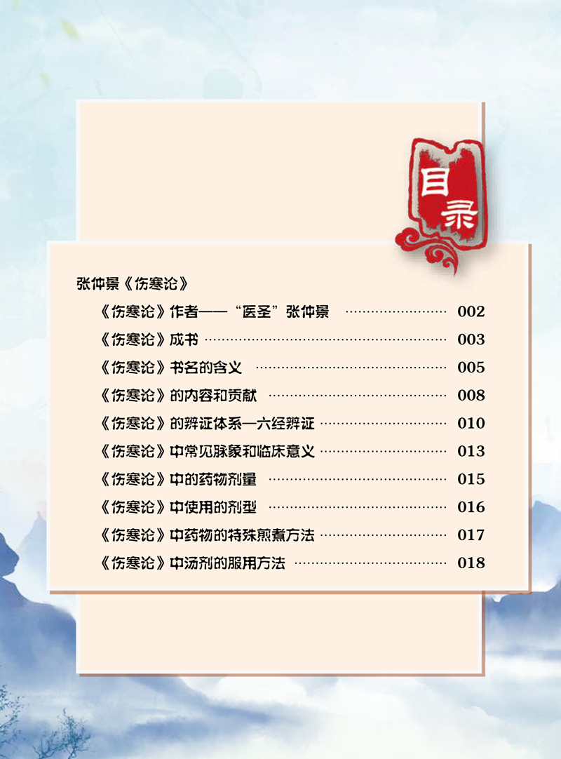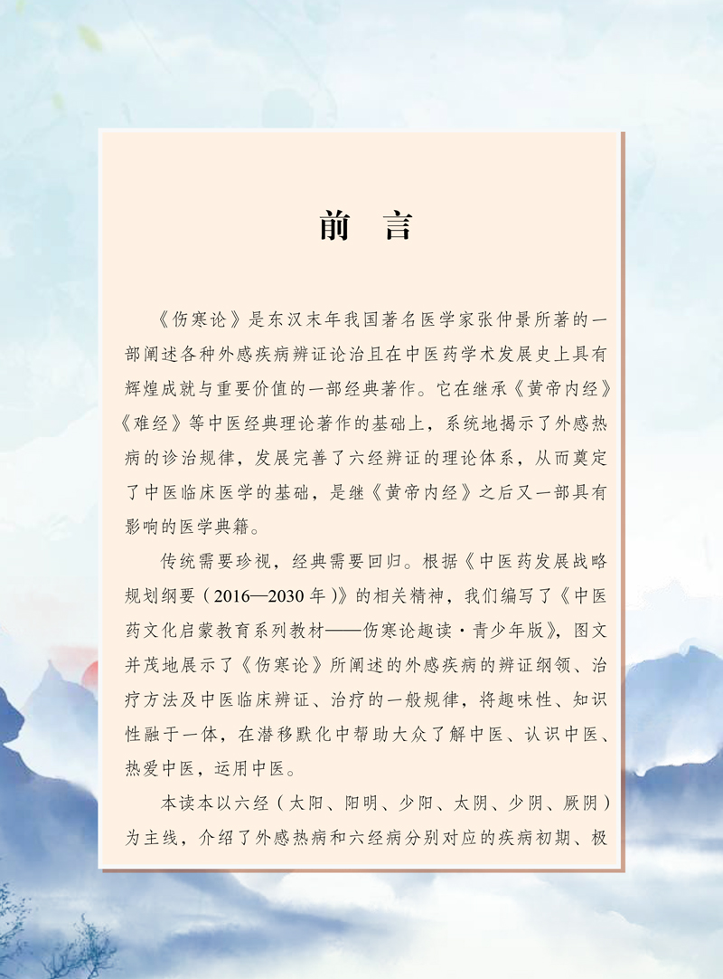 本读本以六经(太阳、阳明、少阳、太阴、少阴、厥阴)为主线,介绍了外感热病和六经病分别对应的疾病的初期、极盛期、亚盛期、轻浅期、衰竭期和终末期。以“大字”的方式选编了《伤寒论》的原文,配有准确的译文和详尽的解读,并引入了中医药知识的小贴士和《伤寒论》常用中药图,变复杂为简单,化抽象为具体,用现代的方式将《伤寒论》的古老智慧展现在中学生面前。