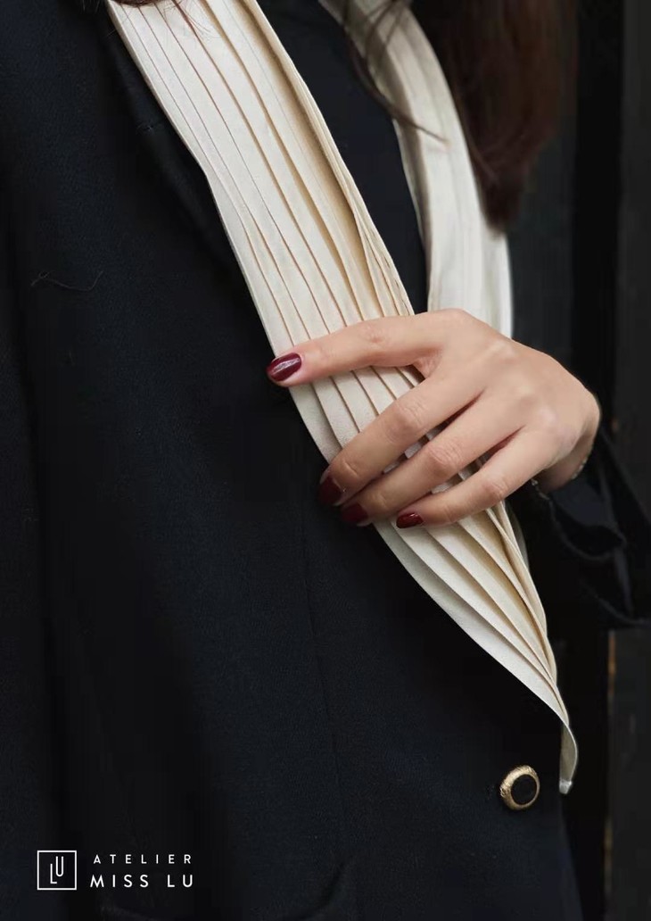 复古且带有珠光感的褶皱翻领,是这件设计最有趣的亮点,灵活生动且不繁琐,彷佛置身于极具宫廷感的歌剧院。