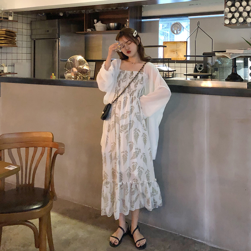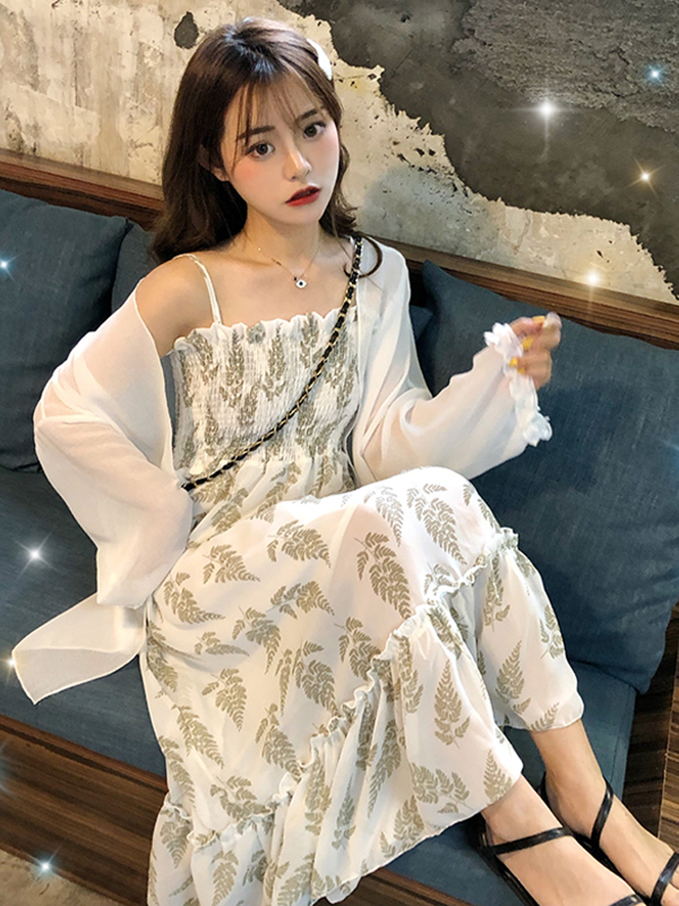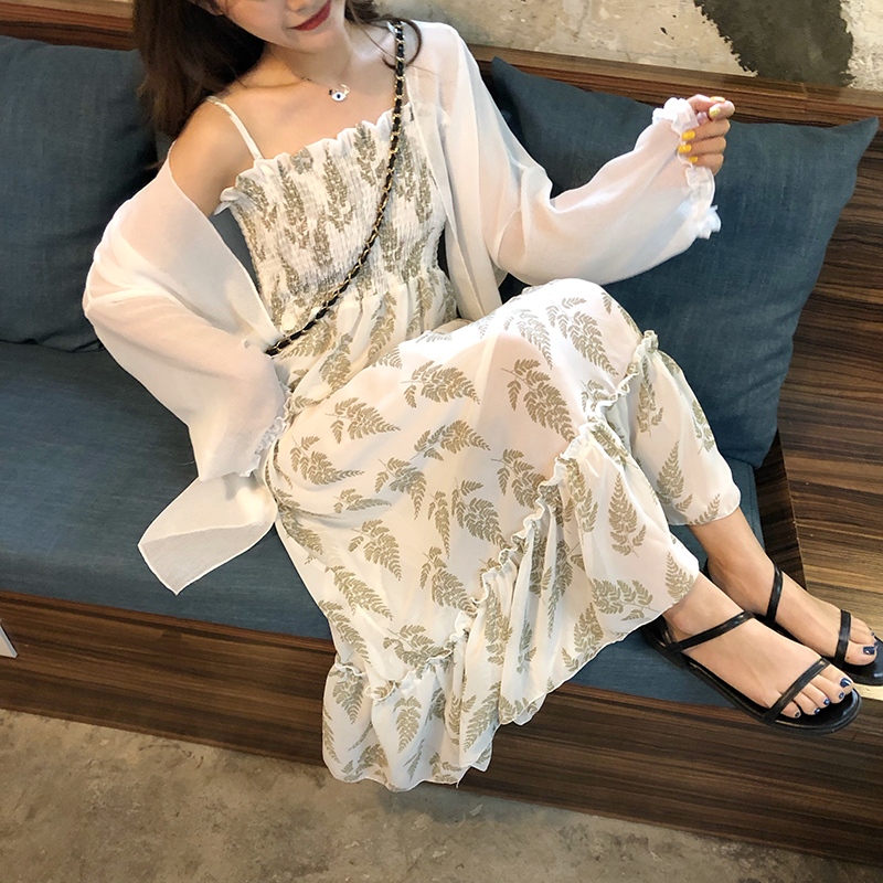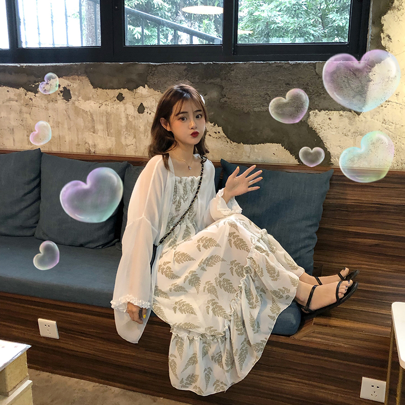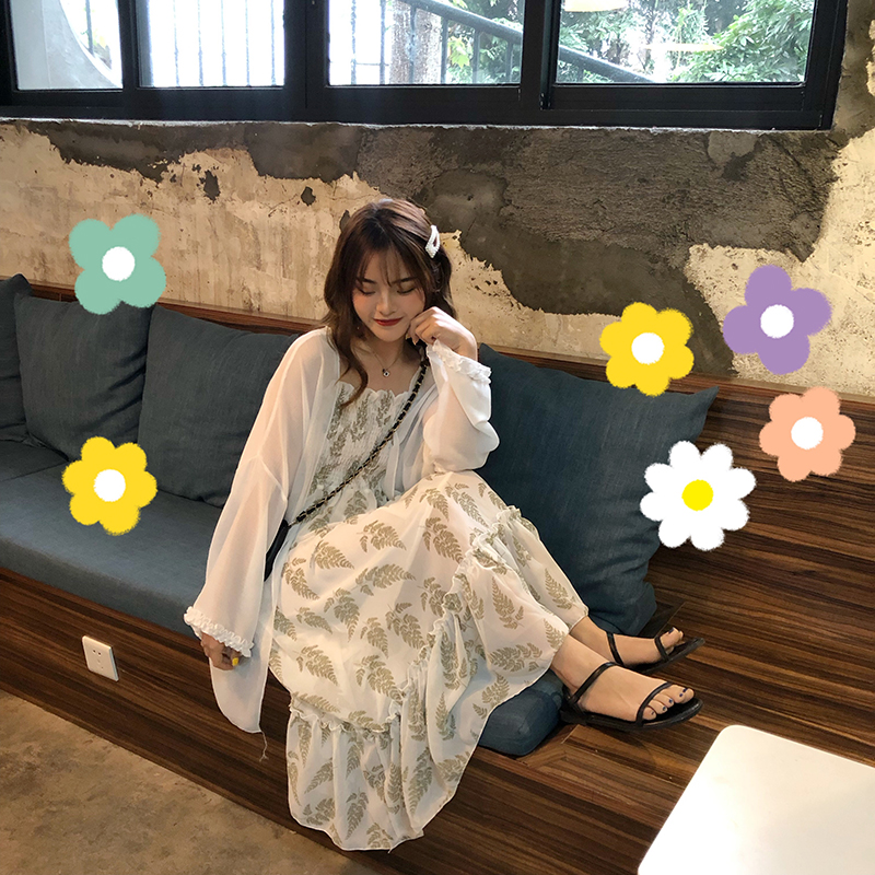 【防晒连衣裙】夏季新款防晒衣收腰显瘦碎花吊带裙超仙雪纺连衣裙学生气质仙女裙子防晒