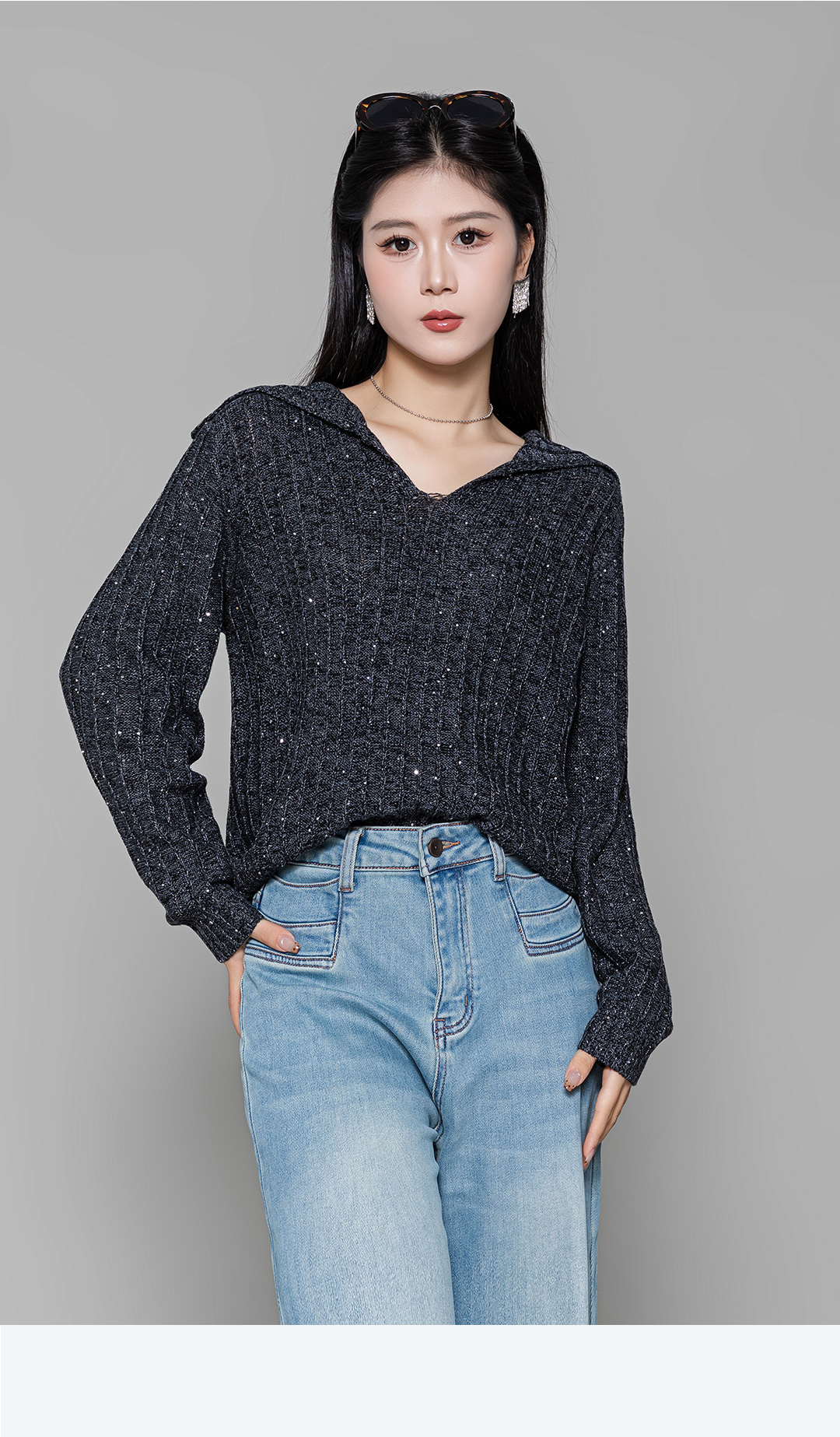 冬上新慵懒随性V领显瘦又吸睛黑色连帽毛衣1254041
