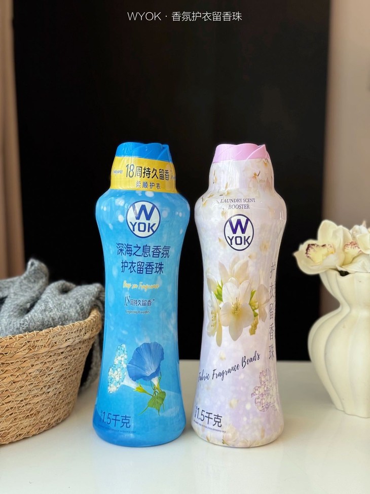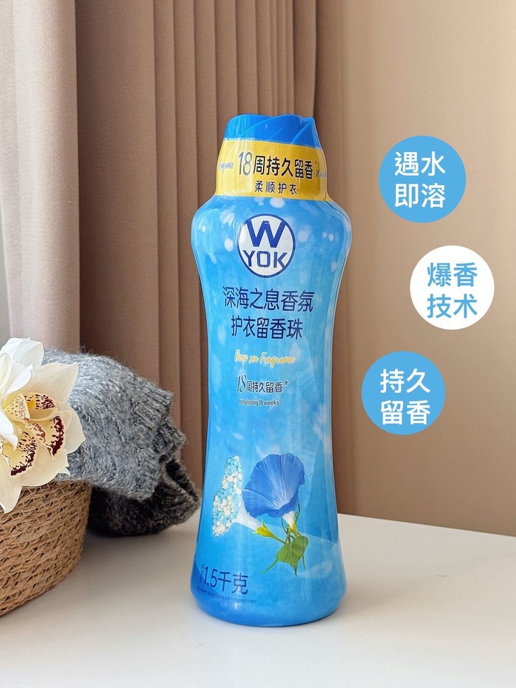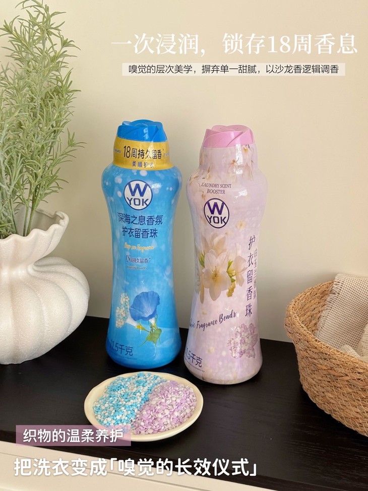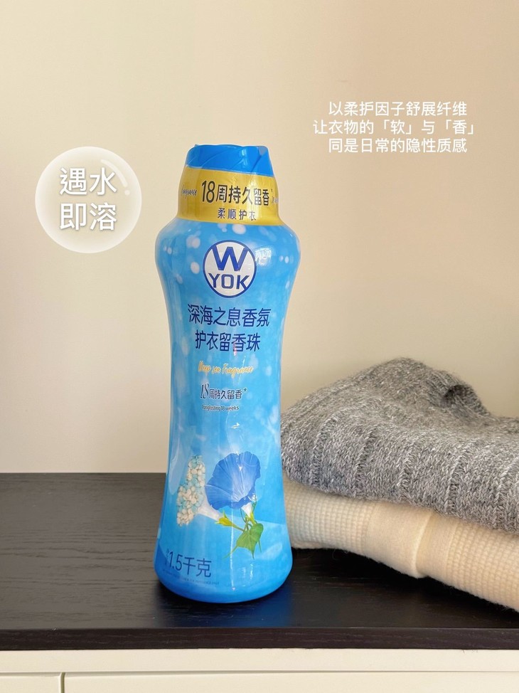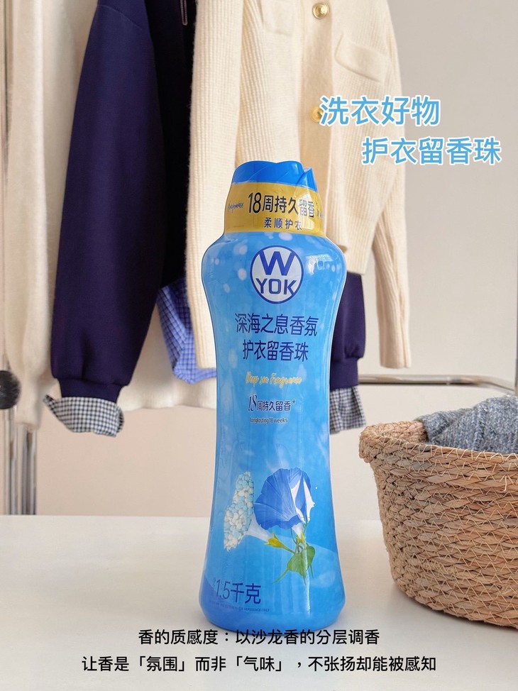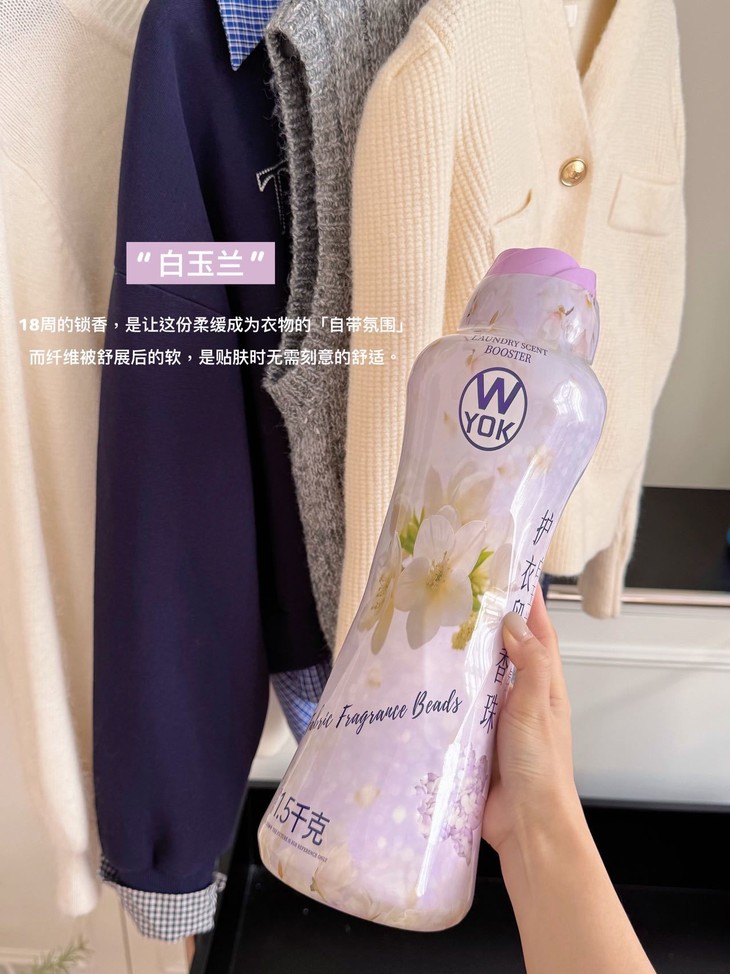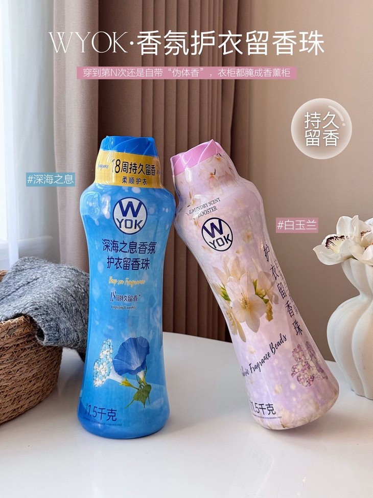 WYOK·香氛护衣留香珠 香型:白玉兰、深海之息 净含量:1.5kg 香,是织物的无形灵魂;柔,是日常的隐性精致 WYOK香氛护衣珠,以18周锁香科技为骨 以沙龙级调香为韵,让每一件衣物 都成为承载质感的移动香氛 长效锁香·质感长存:18周香息驻留, 非临时附着,而是织物自带的气息记忆 让精致跨越洗护周期,始终在线。