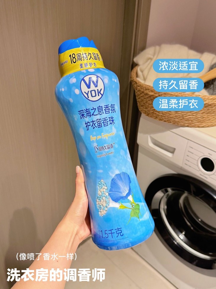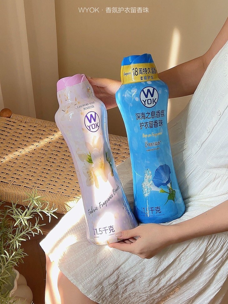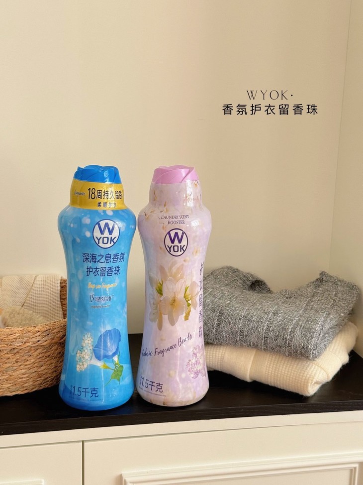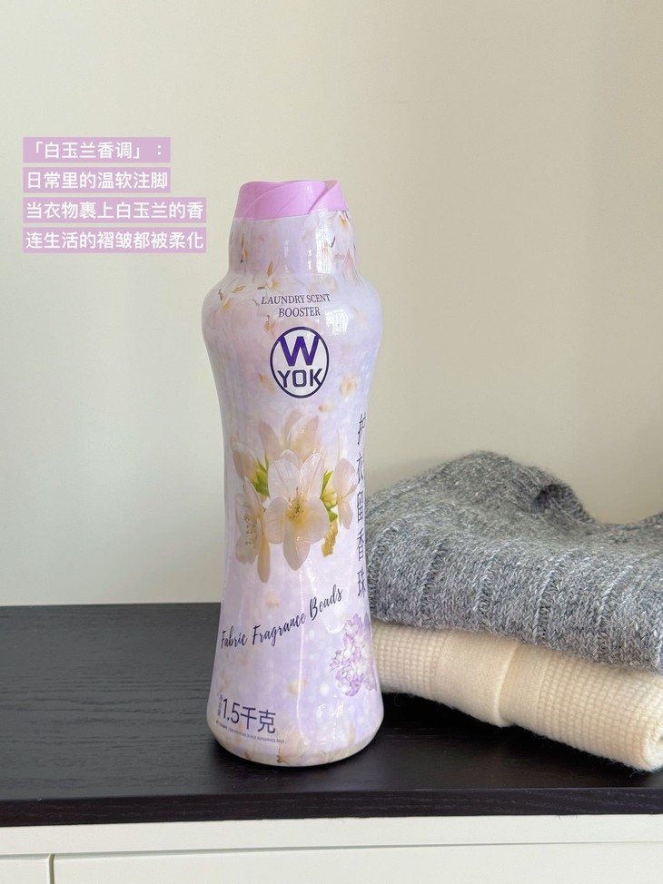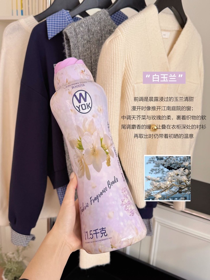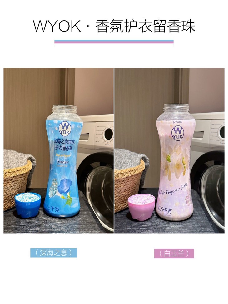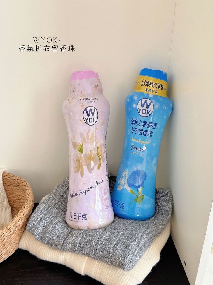 WYOK·香氛护衣留香珠 香型:白玉兰、深海之息 净含量:1.5kg 香,是织物的无形灵魂;柔,是日常的隐性精致 WYOK香氛护衣珠,以18周锁香科技为骨 以沙龙级调香为韵,让每一件衣物 都成为承载质感的移动香氛 长效锁香·质感长存:18周香息驻留, 非临时附着,而是织物自带的气息记忆 让精致跨越洗护周期,始终在线。