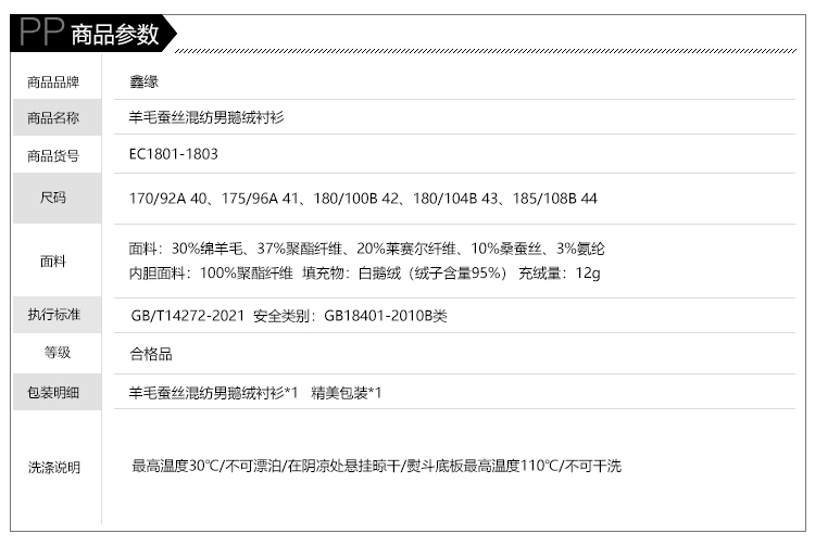 鑫缘 羊毛蚕丝混纺男鹅绒衬衫 EC1801-1803