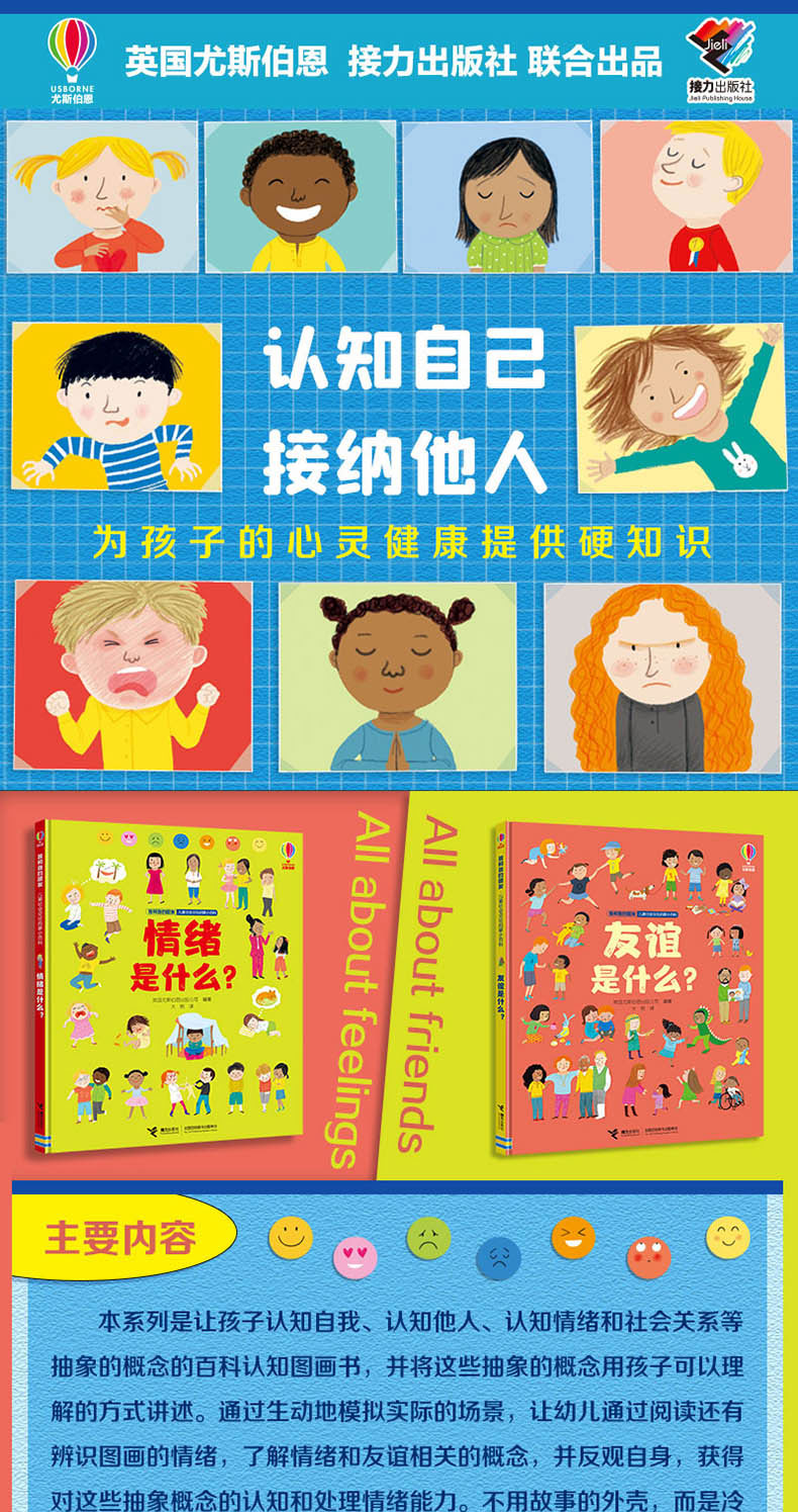 本系列是适合3—8岁儿童的绘本,让孩子认知自我、认知他人、认知情绪和社会关系等抽象的概念的百科认知图画书,并将这些抽象的概念以幼儿可以理解的方式演绎出来。从该年龄段幼儿的心理世界出发,“我”的世界包括自我的情感友谊——是幼儿最重要的两个情境,包含两本《情绪是什么?》《友谊是什么?》。通过生动地模拟实际的场景,让幼儿通过阅读还有辨识图画的情绪,了解友谊以及情绪相关的概念,并反观自身,获得对这些抽象概念的认知和处理情绪能力。对内容的演绎形式也有其独特性,作者是采用将相关知识和状况抽丝剥茧解释出来的方式,而非故事的外壳,向孩子讲述这些内容。从给人以冷静、理性的风格,更有助于该年龄段的儿童跳出故事,更理性地思考关于情绪和人际关系。在儿童阅读的图画内容结束后,还有给家长、老师等成年人看的“给成年人的建议”,让成年人对孩子的情绪和人际关系有更敏锐的觉察,并帮助孩子更好地度过情绪敏感期