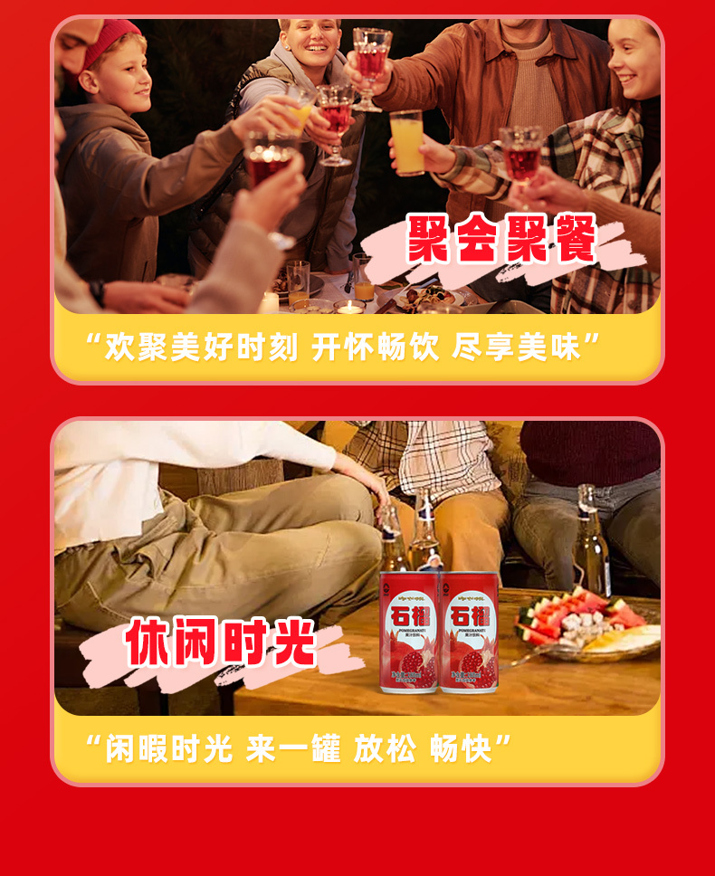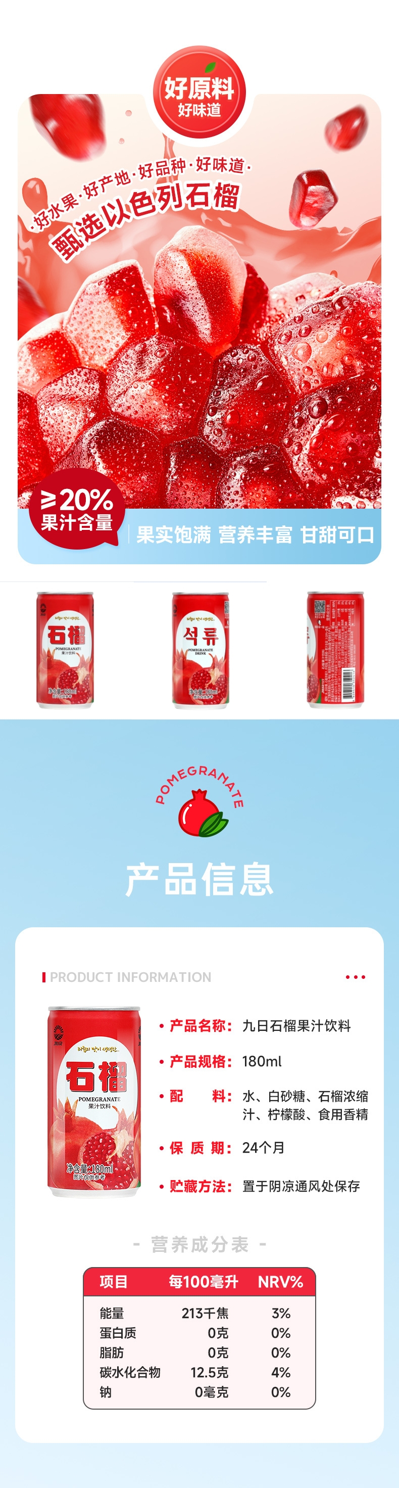 ✨石榴淡香,清甜口感,酸甜可口,色泽艳丽。果汁总含量>20%,0防腐剂、0色素。小巧罐型,方便携带。