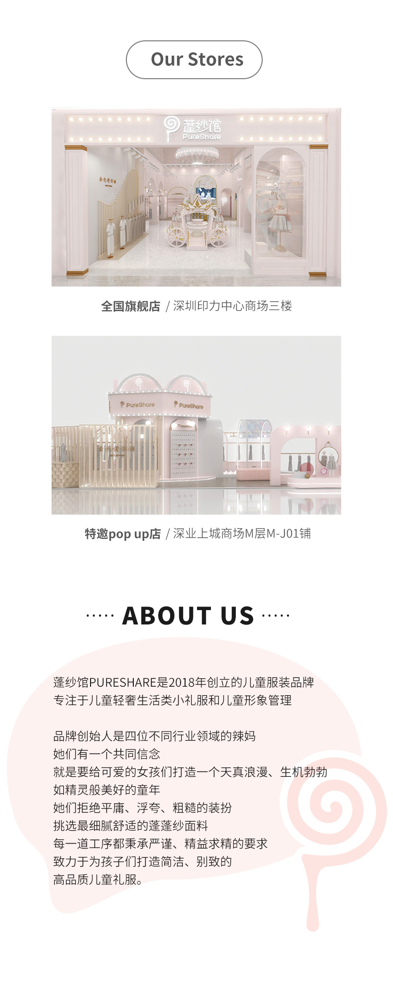 - PureShare蓬纱馆,2018年创立的儿童服装品牌,专注于儿童轻奢生活类小礼服,主张“让孩子做最独特的自己”的品牌理念,为孩子们提供时尚简洁、优雅而又不失童真的生活类礼服。