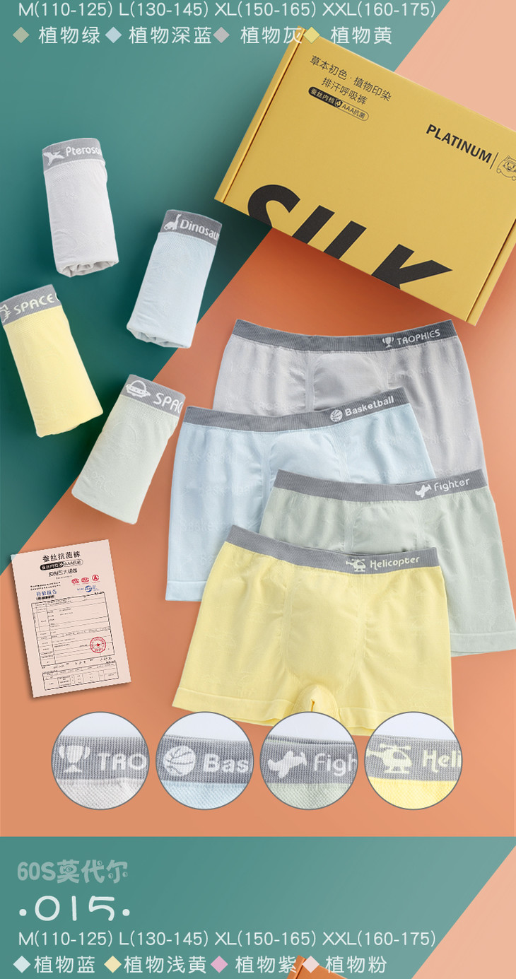 【蚕丝内裆,排汗呼吸裤】4条装儿童内裤3A级抗菌裸氨无缝平角裤中小学生内裤幼儿园宝宝男女孩青少年莫代尔无痕导湿透气四角裤