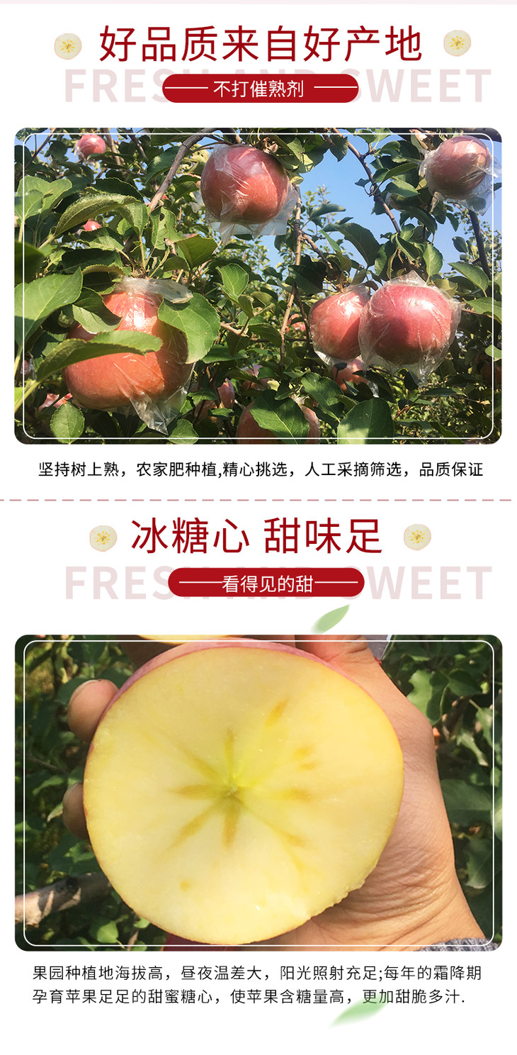 快递发货,可能会存在挤压现象,非常少有,如果外皮挤压,不影响食用,每个赔付0.5元;苹果在生长过程中也会存在黑心现象,如果不影响果肉,不做售后,如介意请慎拍!!!