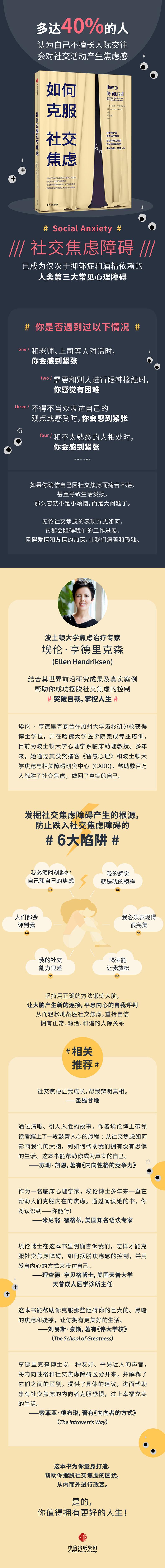 【美】埃伦·亨德里克森(Ellen Hendriksen) 曾在加州大学洛杉矶分校获得博士学位,并在哈佛大学医学院完成专业培训,目前为波士顿大学心理学系临床助理教授。多年来,她通过其获奖播客“精明的心理学家”和波士顿大学焦虑与相关障碍研究中心(CARD),帮助数百万人战胜了社交焦虑,做回了真实的自己。