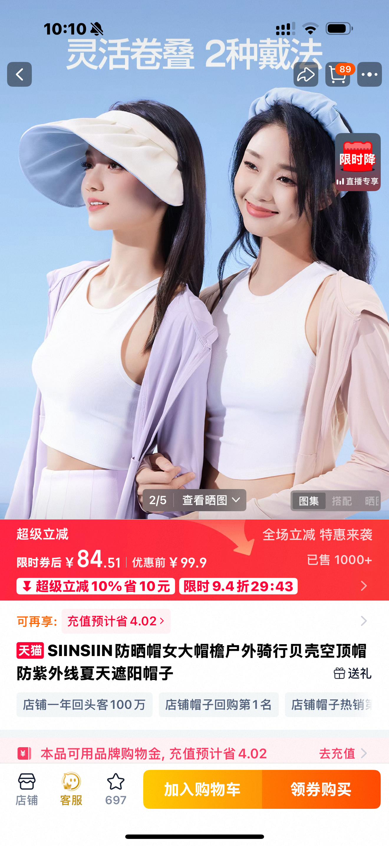 【siinsiin正品单】抵账回来的,大帽檐防晒帽,spf50+,可卷发箍,简包装发货