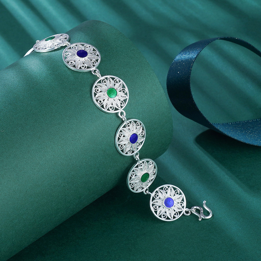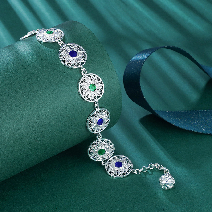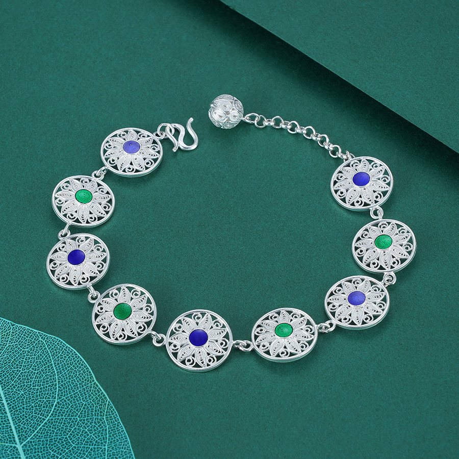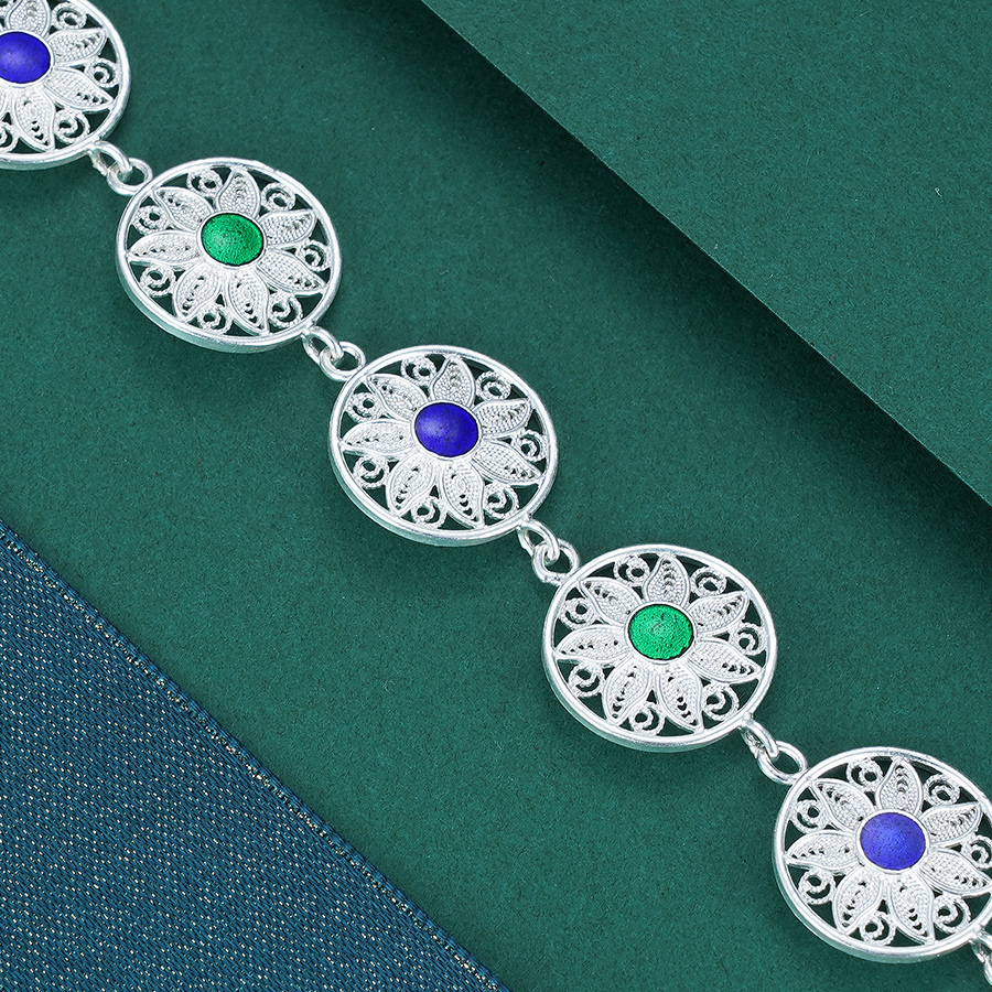 【寓意】:作品以“望日莲”为灵感设计,运用银花丝工艺勾勒造型,朵朵圆润花朵衔缀成链,宛如向阳生长的花序。寓意对幸福矢志不渝的追求。