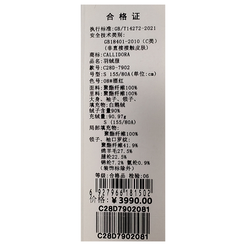 卡莉朵拉羽绒服C28D7902