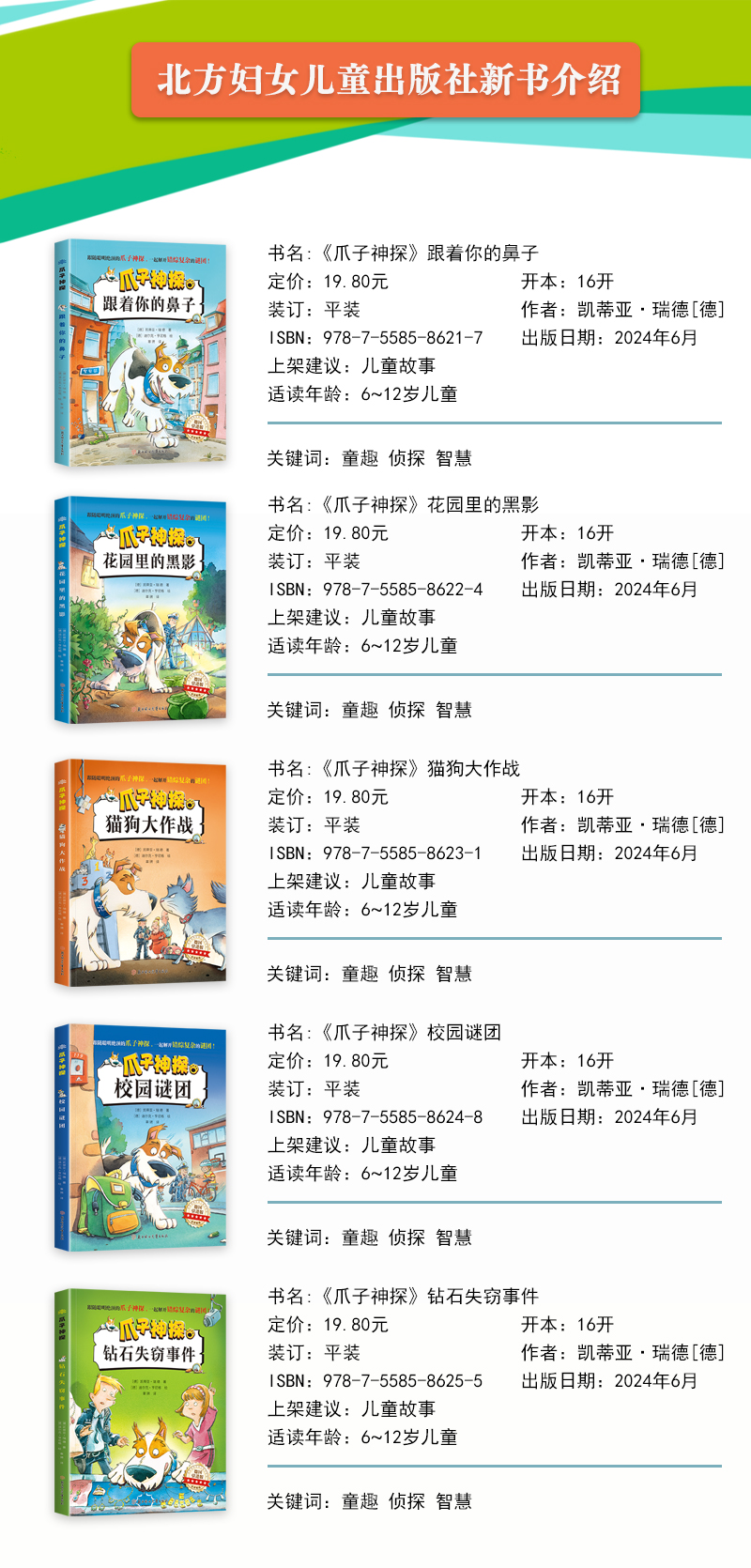 《爪子神探》以一只名叫佩珀、被人们称为爪子神探的狗狗为主角,讲述了佩珀和警察一起执行任务的过程中发生的一系列惊心动魄的故事。本套包括《跟着你的鼻子》《钻石失窃事件》《校园谜团》《猫狗大作战》《花园里的黑影》5本,孩子们可以通过阅读本书培养逻辑推理能力。每本1个破案故事,均借助孩子熟悉的生活场景及事件展开案件,故事节奏紧凑,有悬疑色彩但不血腥。篇幅适中,孩子可以享受一口气读完的阅读体验,人物形象鲜明,特点突出,推理逻辑严谨,有助于促进孩子独立思考。本书还配有彩色插图,画风夸张幽默。此外,全书标注拼音,便于孩子自主阅读;特别设计特效字,增强阅读的趣味;精心编写案件的思维导图,梳理案件细节,提升逻辑思维能力;本书附有探案笔记,孩子可以边阅读边将思考的内容记录下来。