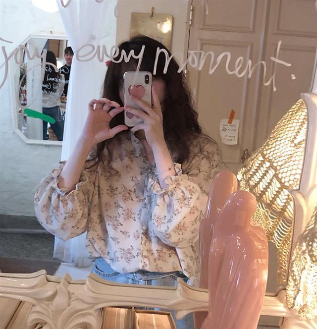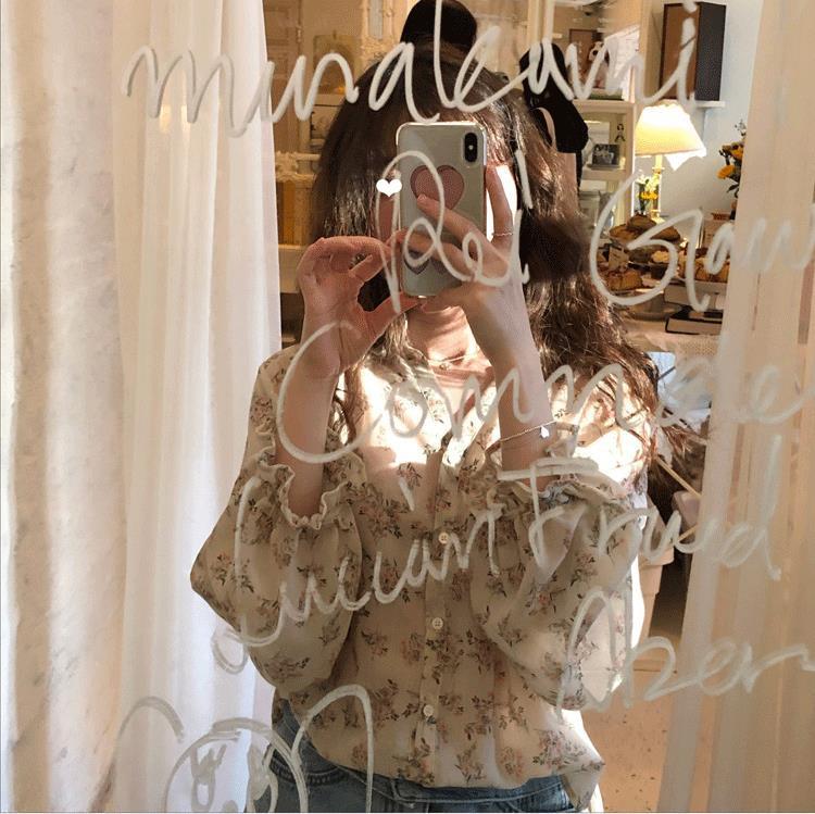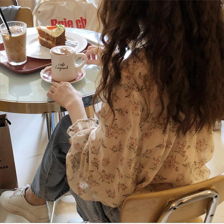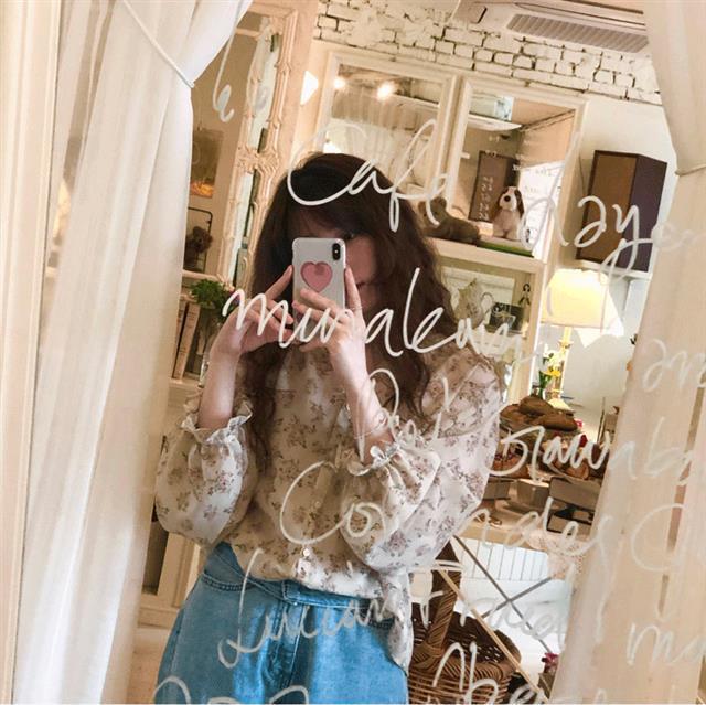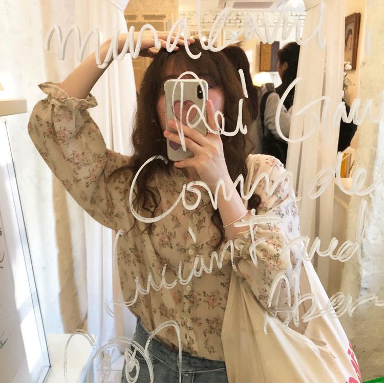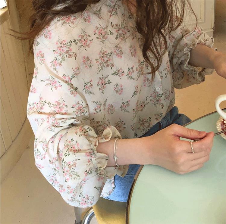 春夏季新款甜美小清新喇叭袖领雪纺上衣小衫洋气碎花衬衫女