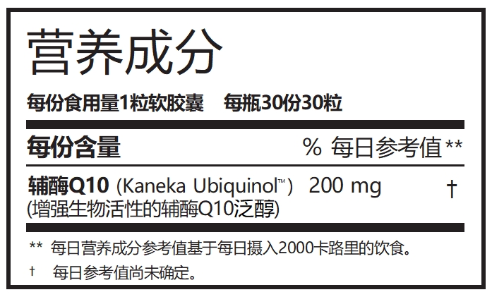 Ubiquinol Super 200™ 含200毫克还原型辅酶Q10(泛醇),采用还原形式的辅酶Q10制备。