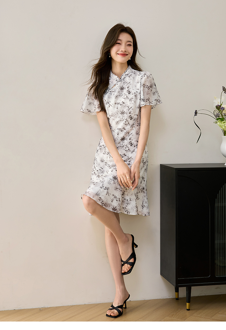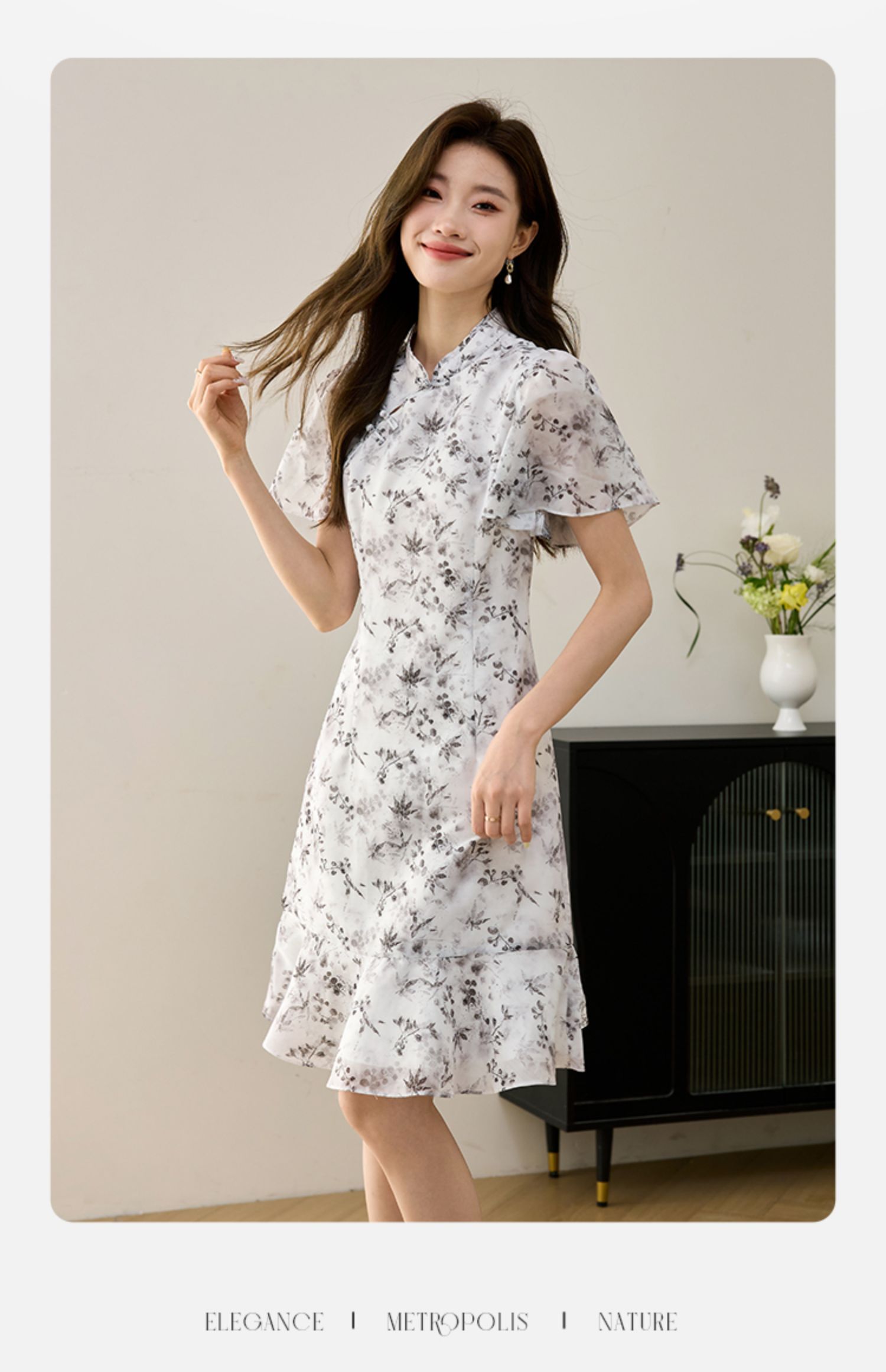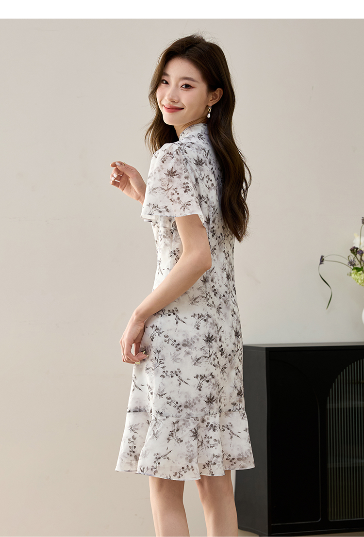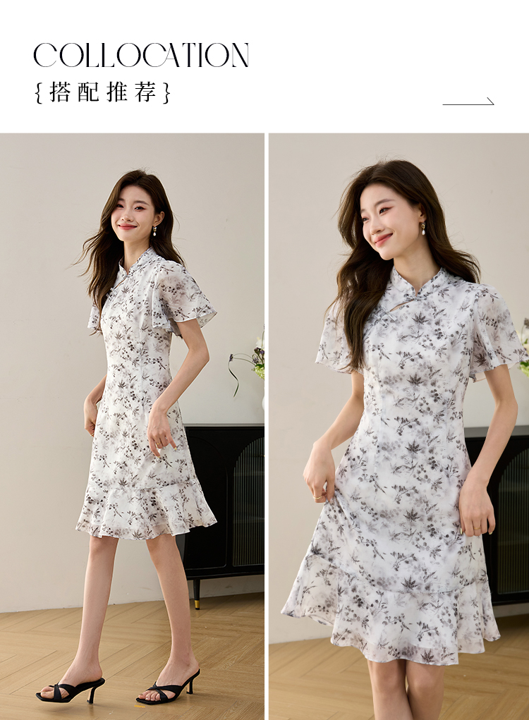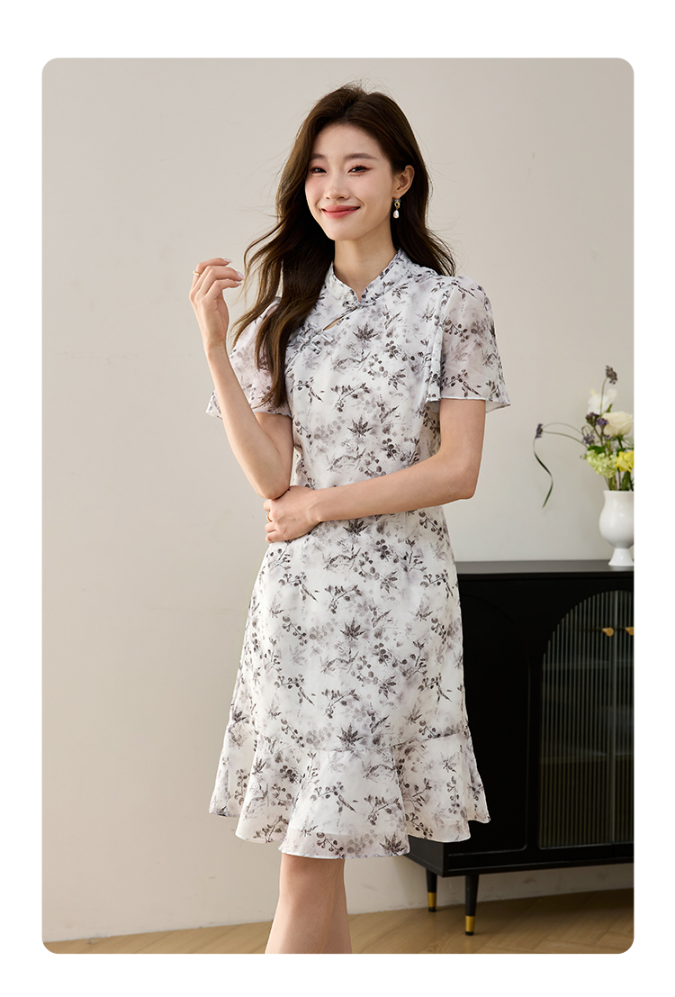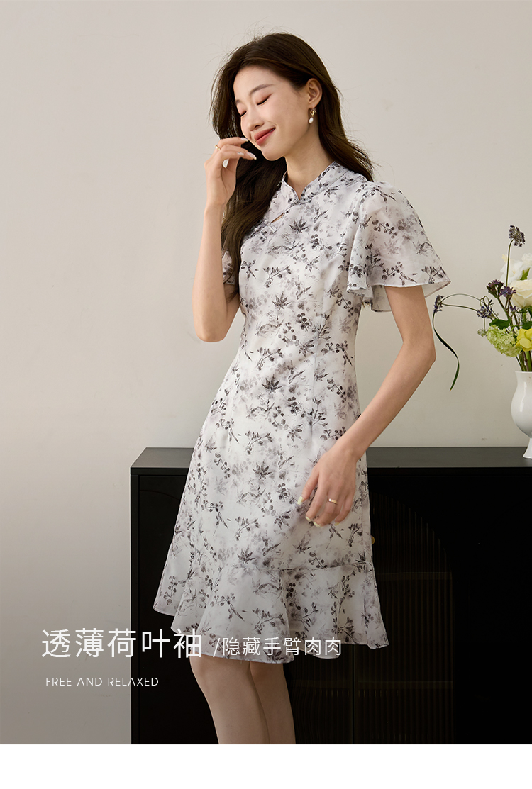 【专属特价】熙世界新中式雪纺旗袍连衣裙2025夏新款国风水墨碎花荷叶边裙子