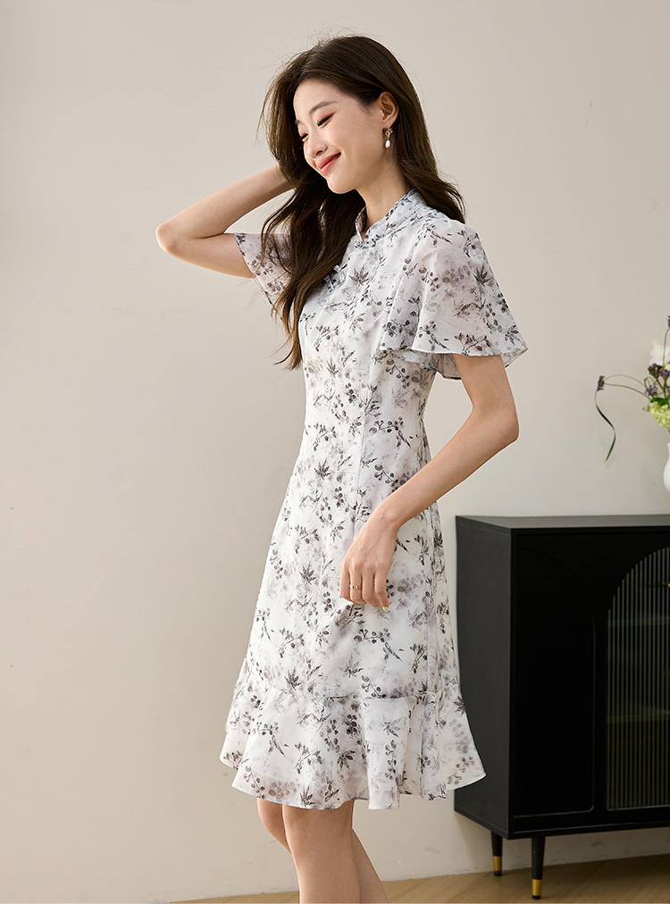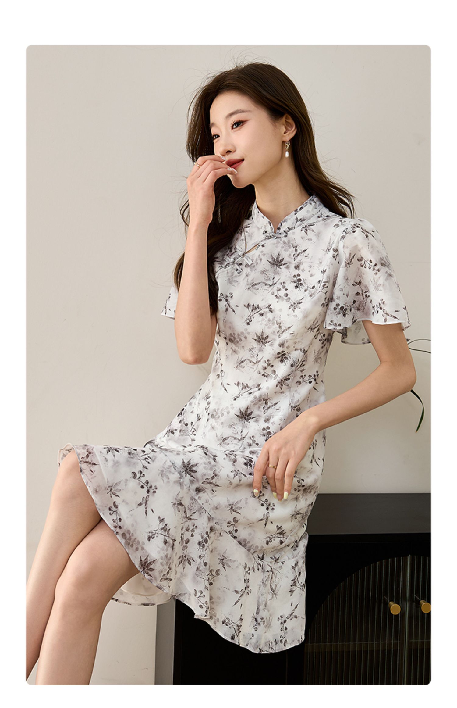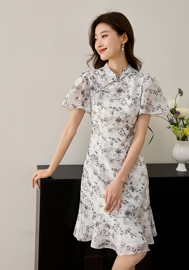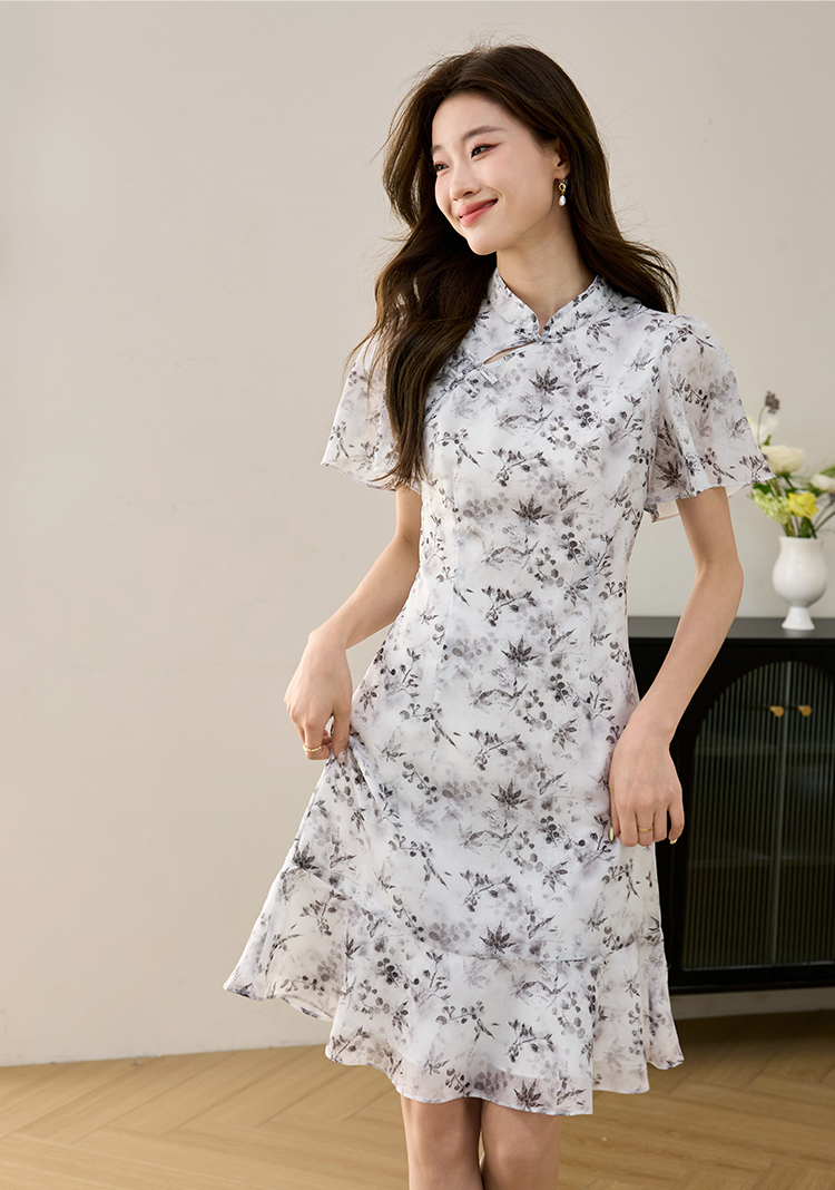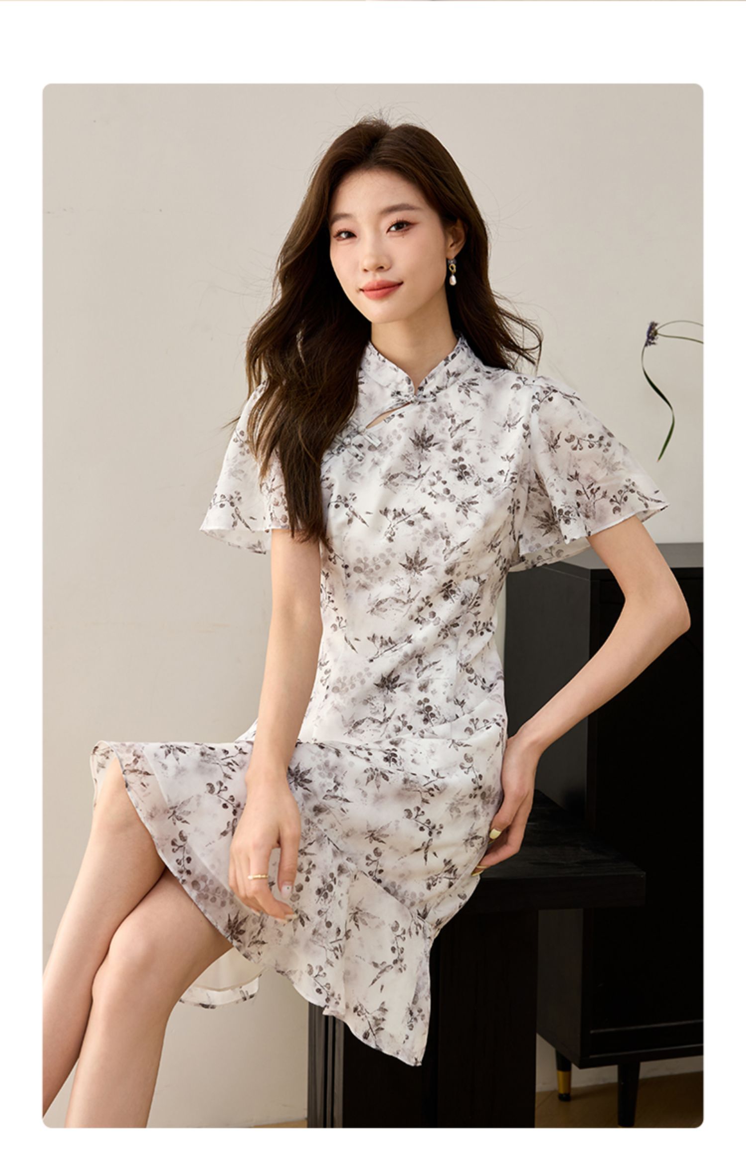 【专属特价】熙世界新中式雪纺旗袍连衣裙2025夏新款国风水墨碎花荷叶边裙子
