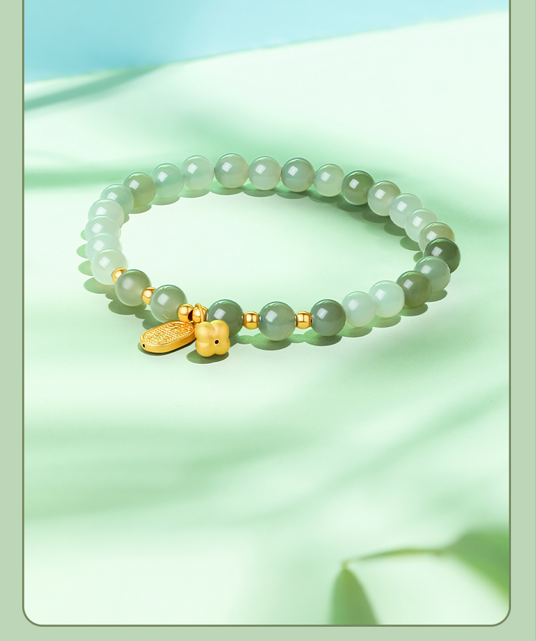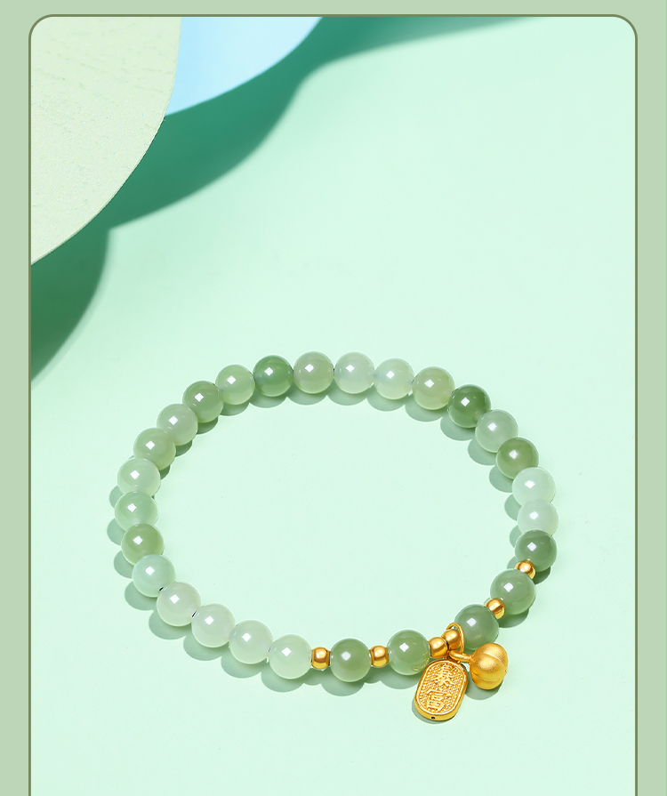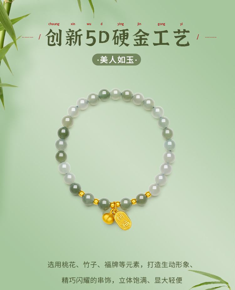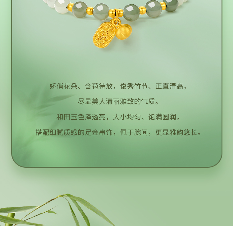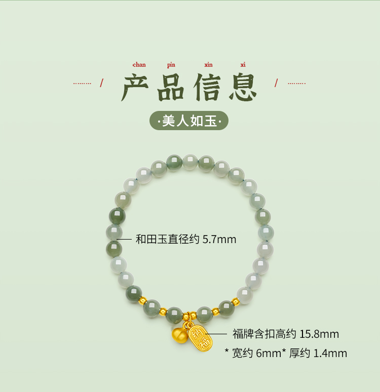 周六福金镶玉暴富字金牌手串女士黄金和田青玉手链送礼物官方正品
