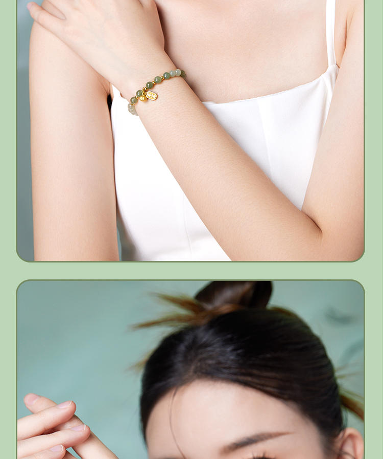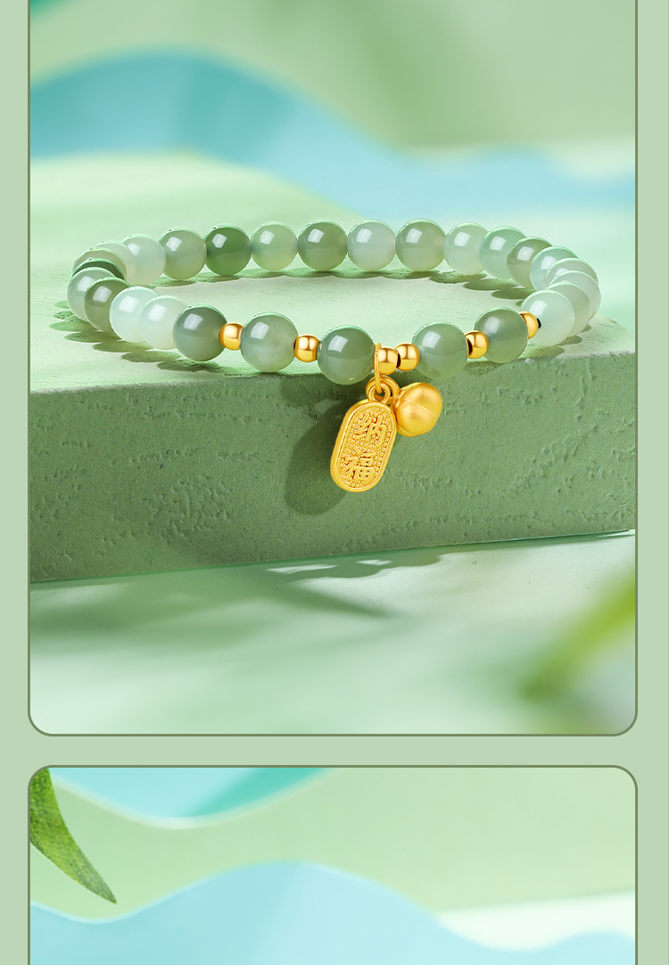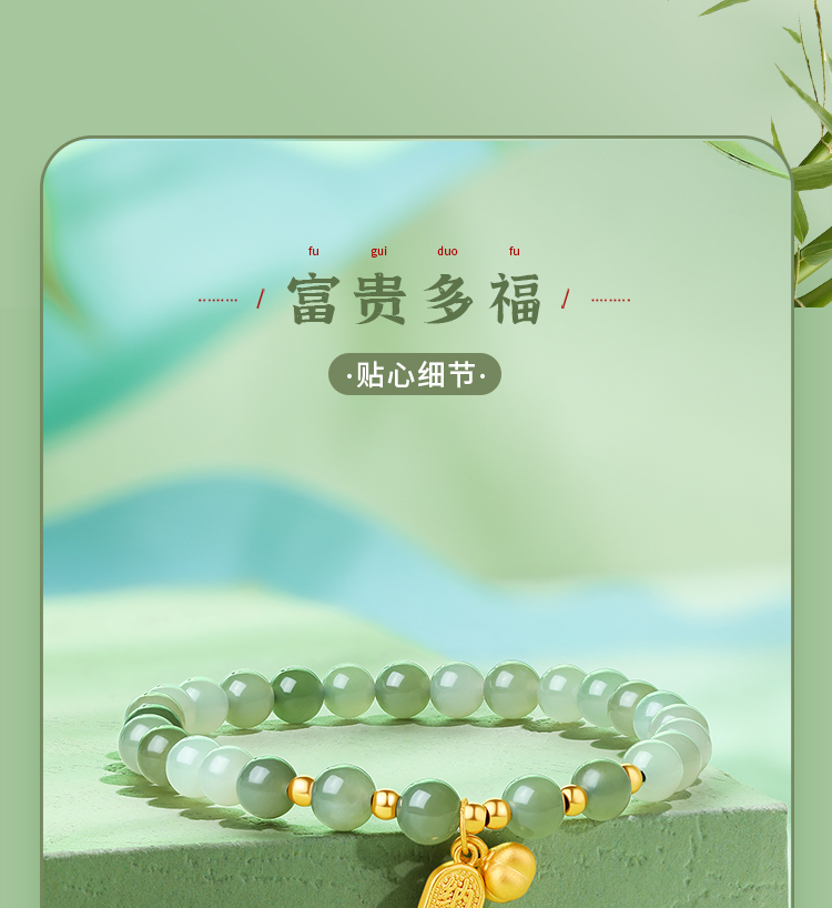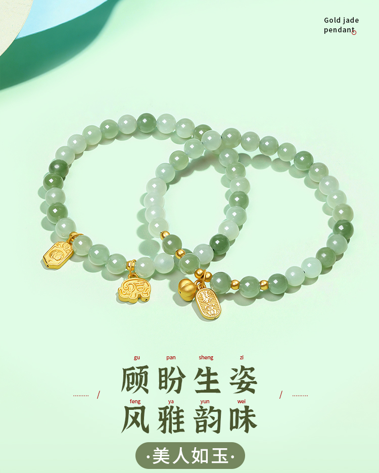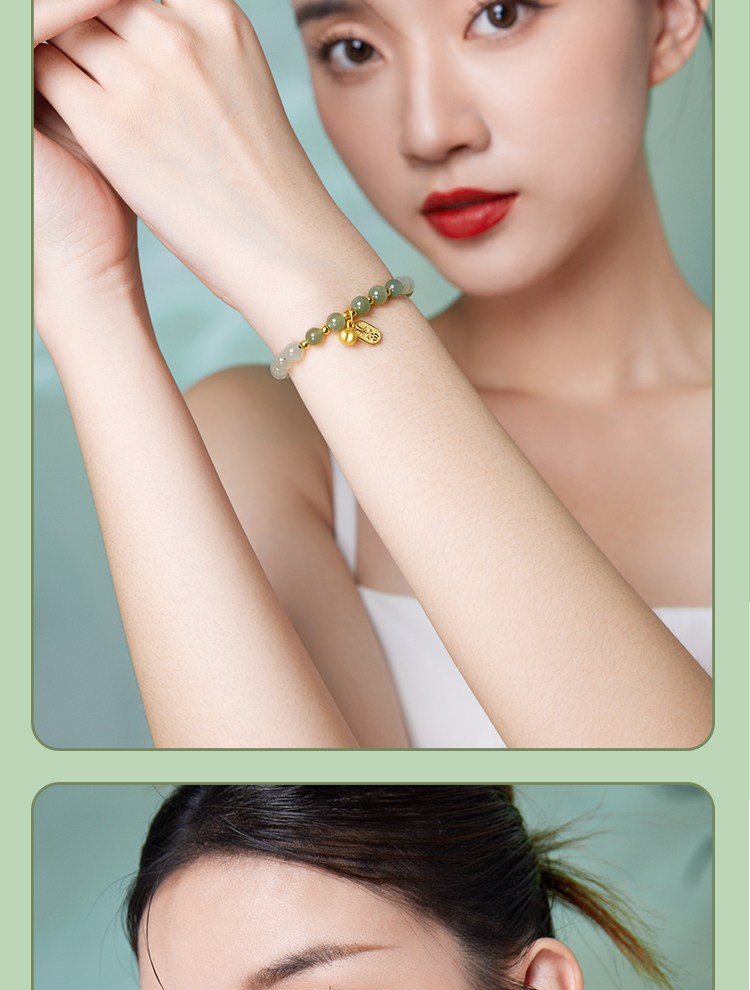 周六福金镶玉暴富字金牌手串女士黄金和田青玉手链送礼物官方正品