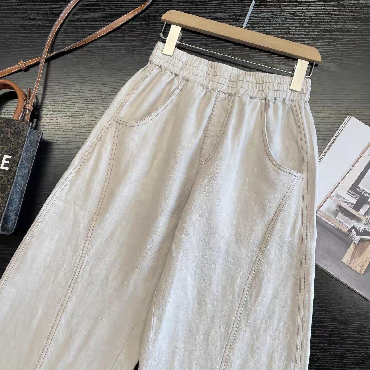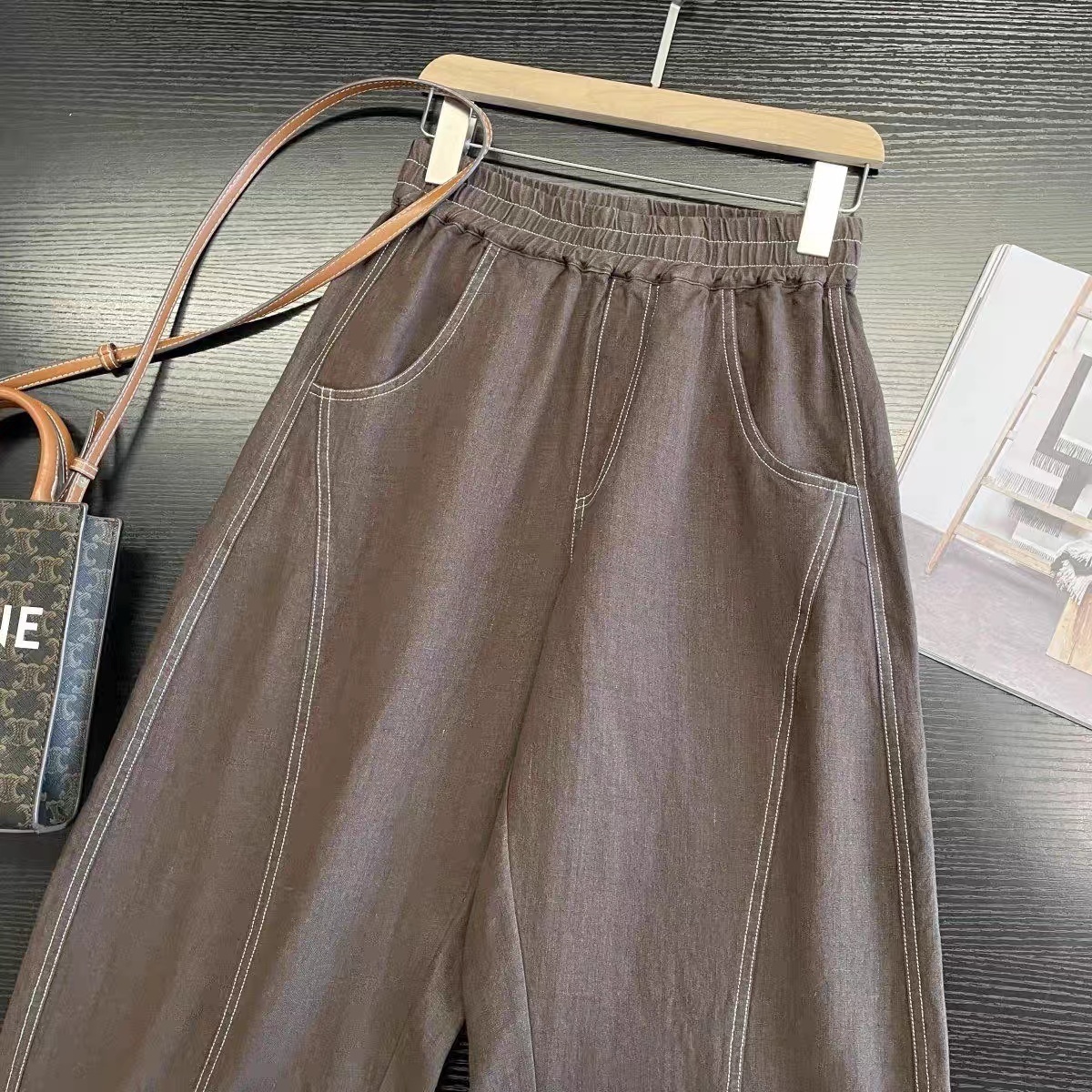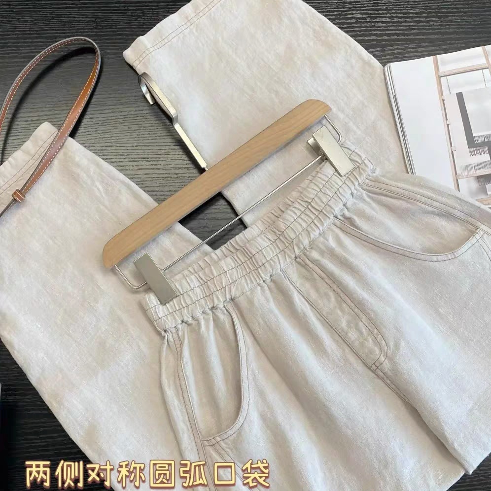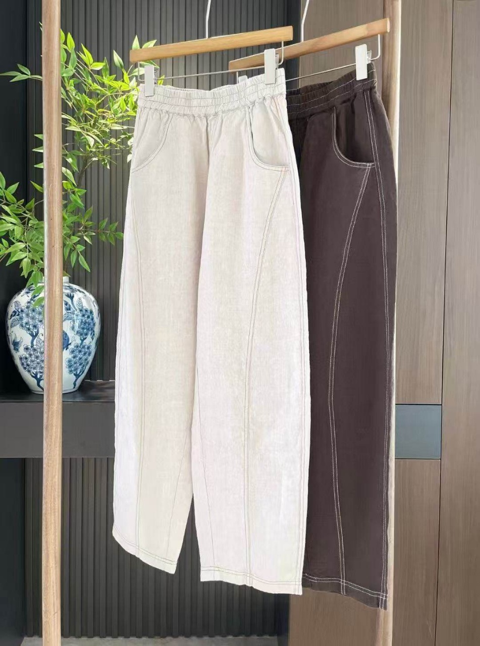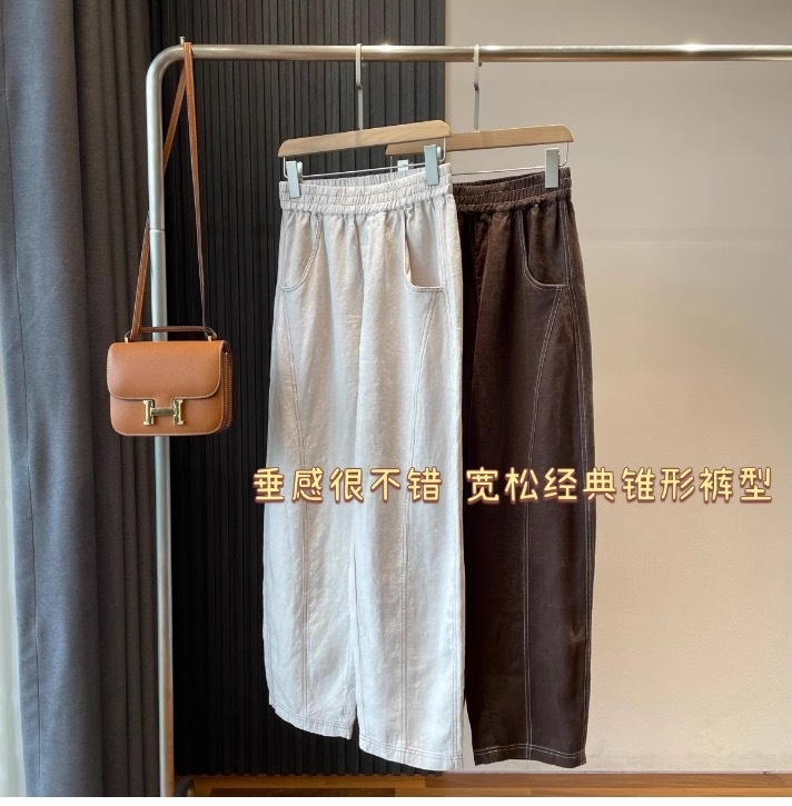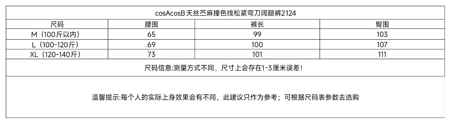 爆款3-7天发货!cosAcosB天丝苎麻撞色线松紧弯刀阔腿裤2124