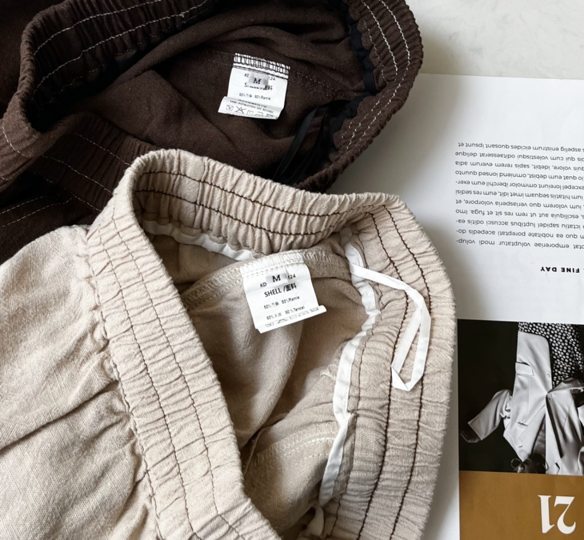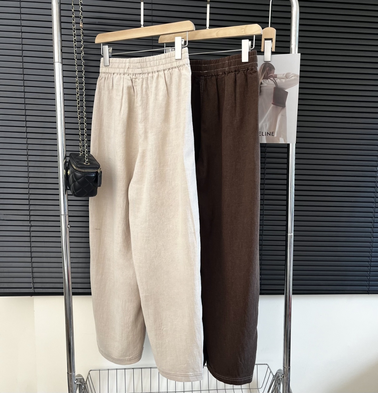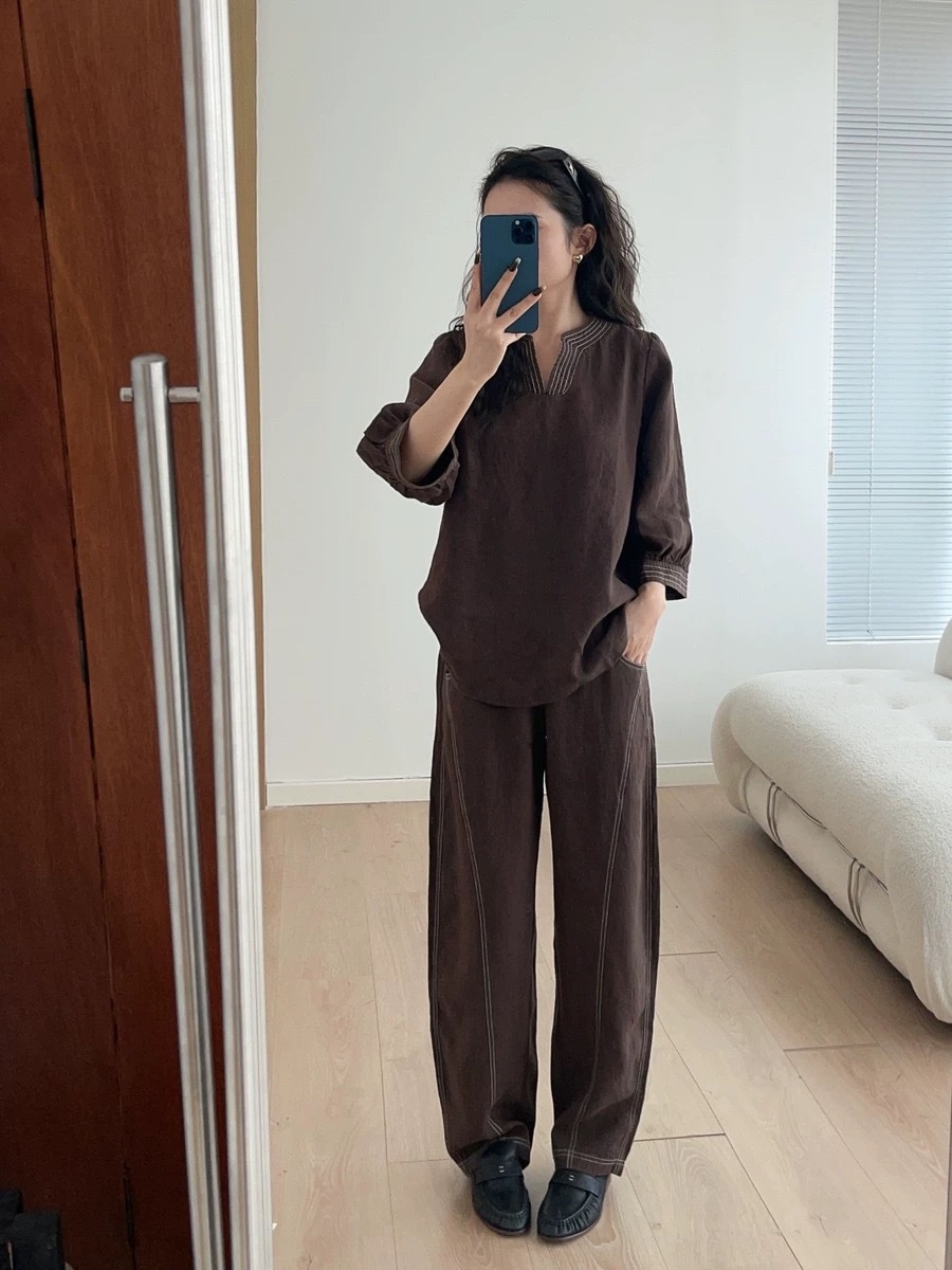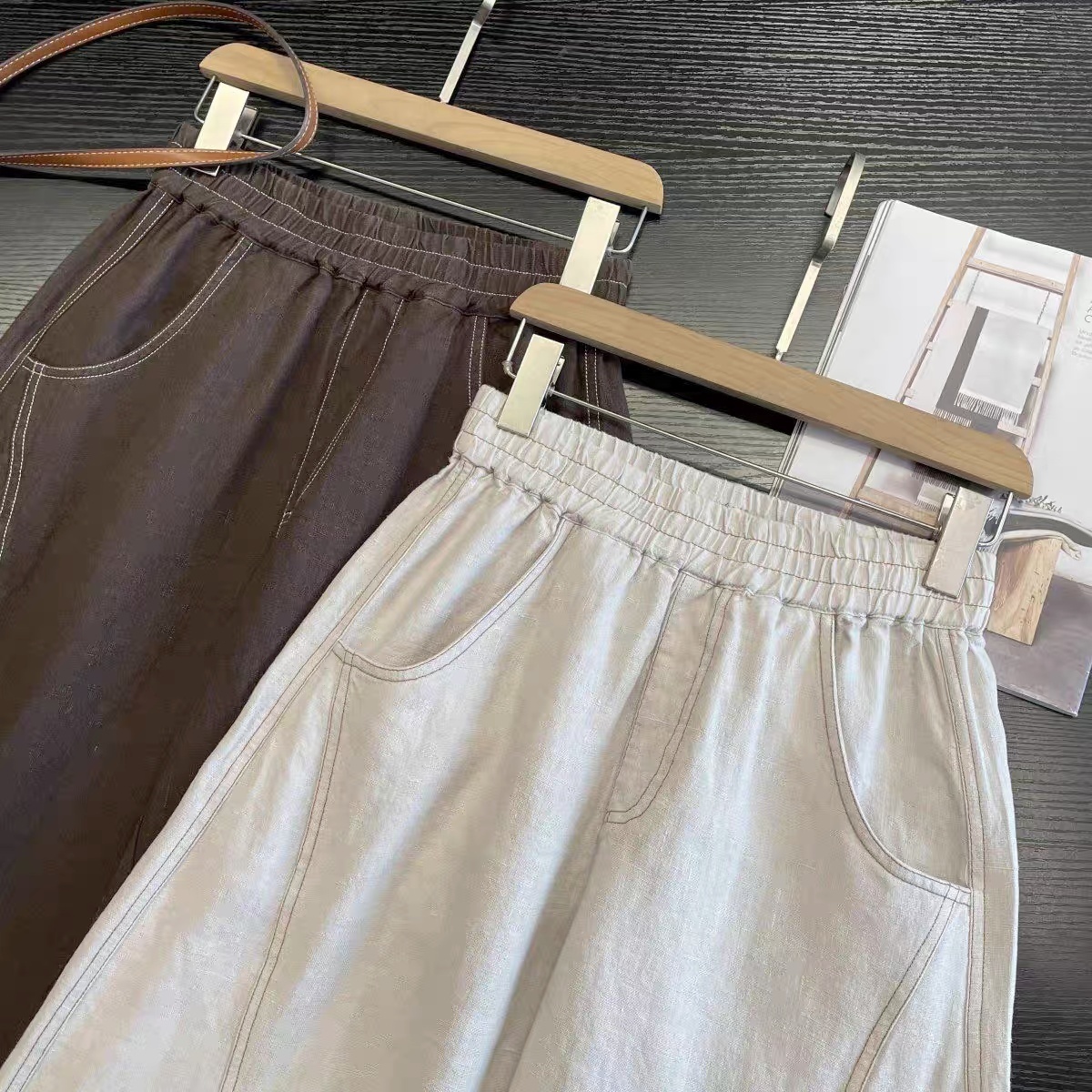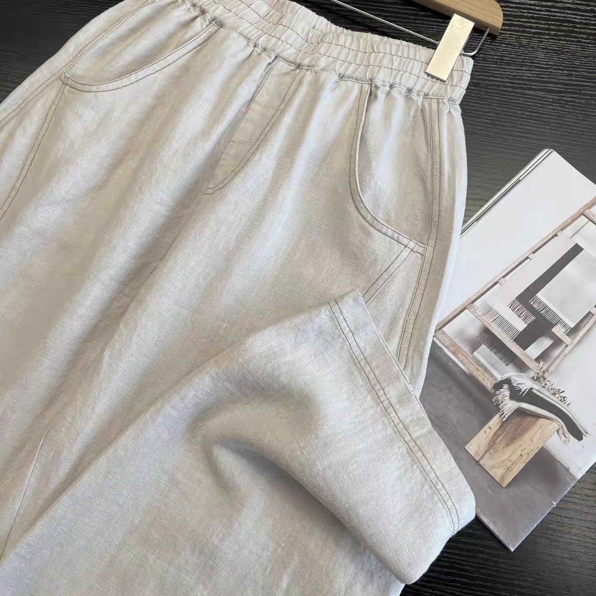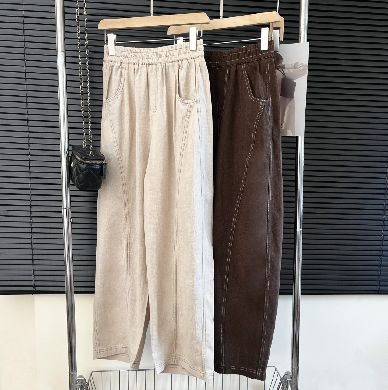 爆款3-7天发货!cosAcosB天丝苎麻撞色线松紧弯刀阔腿裤2124