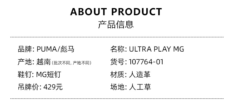 SFS 彪马Puma 正品ULTRA PLAY入门级MG短钉人草足球鞋男107764-01