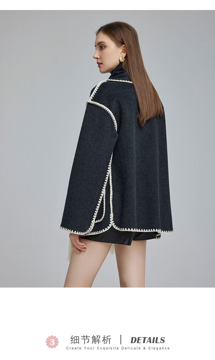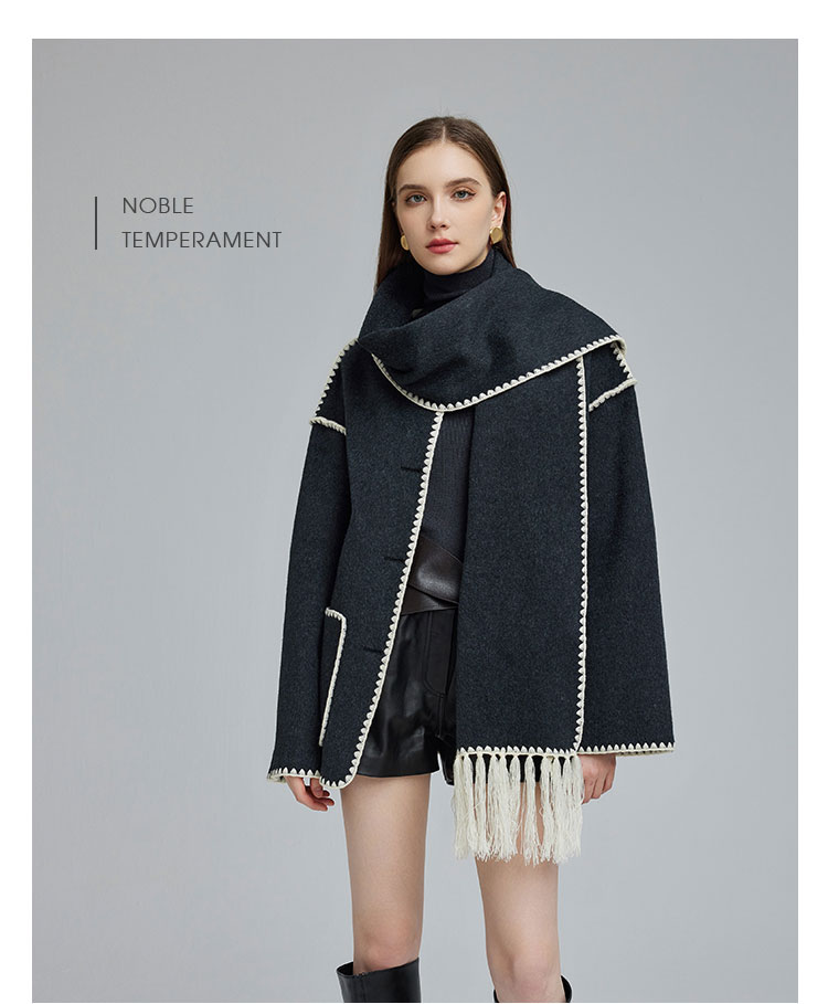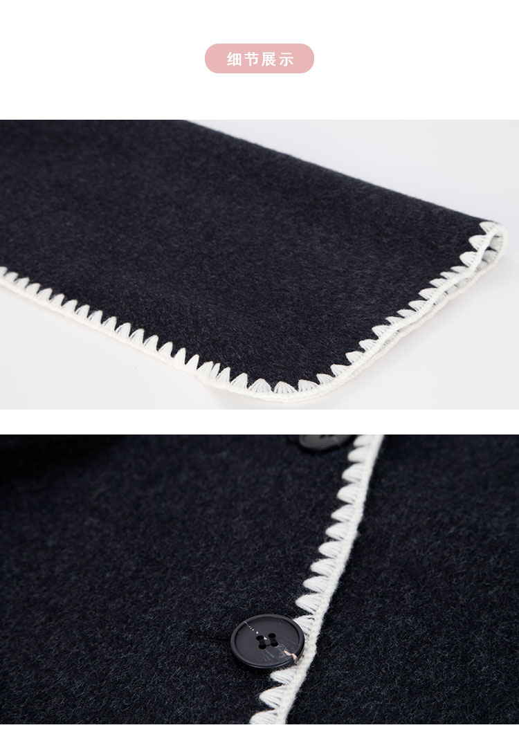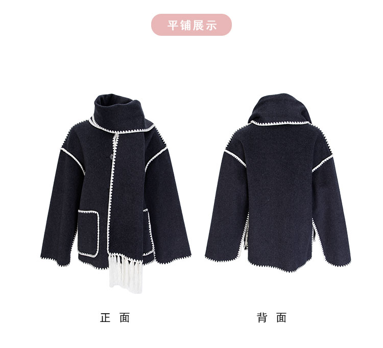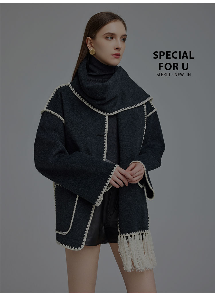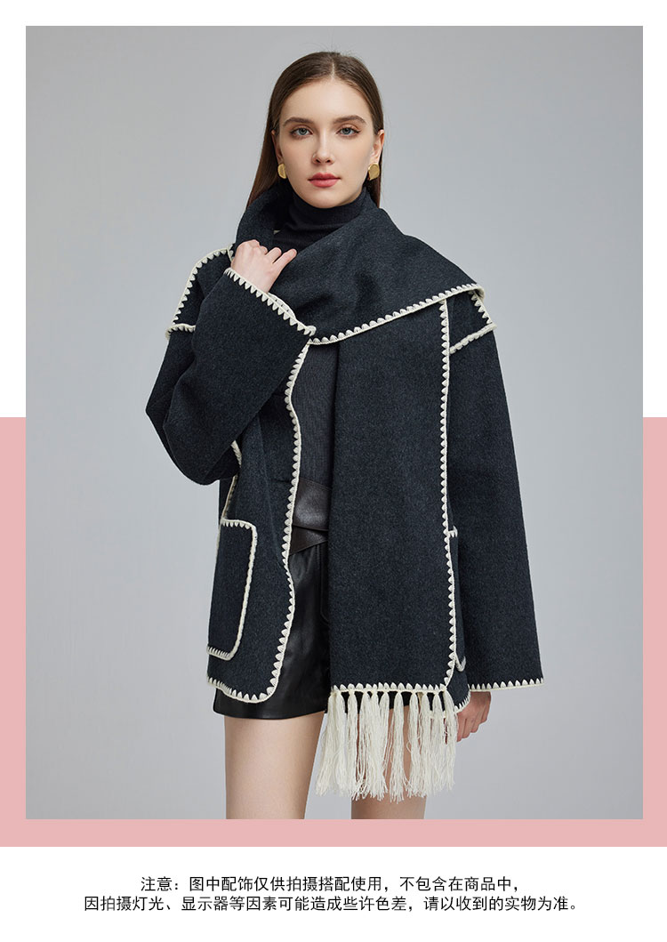 NH937斯尔丽2023冬上新围巾款手工立体绣边撞色宽松显瘦既视感双面大衣