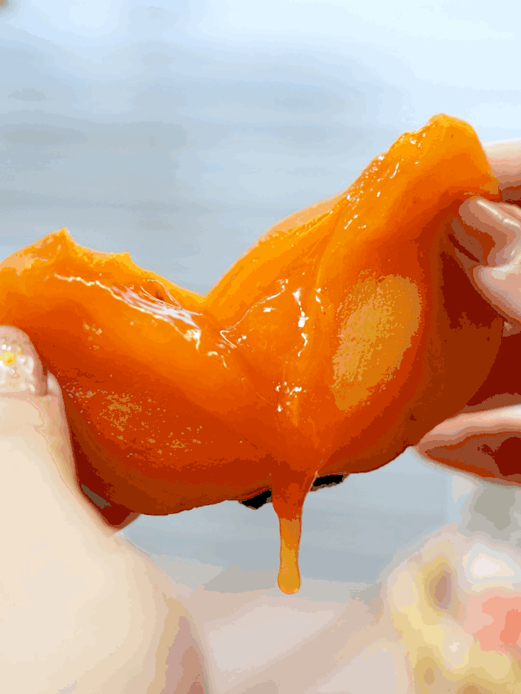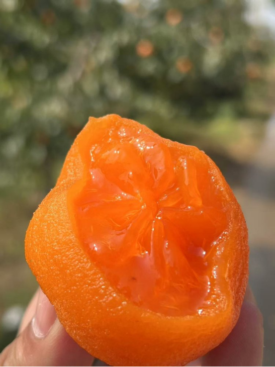 没有一个柿子脑袋会拒绝流心冰柿!🤩 它的口感特别神奇 介于新鲜柿子和传统柿饼之间 空口吃果肉均匀又流心,莹润软糯有蜜香~ 真的比其他柿子好吃太多了! 真就是一整个爆浆的状态啊! 口感就像冰淇淋一样,软软糯糯香甜可口 爱吃甜食的姐妹们真的拒绝不了一点!!!