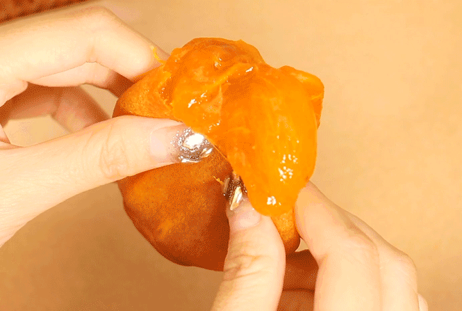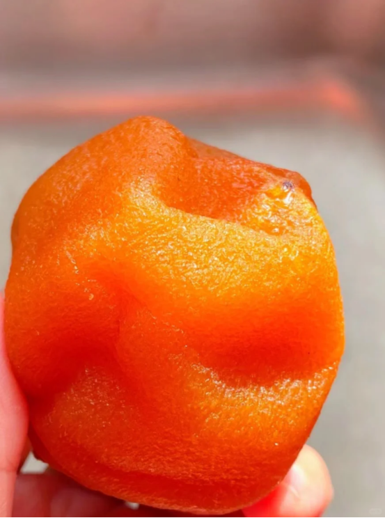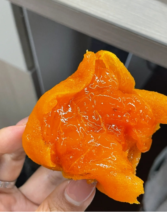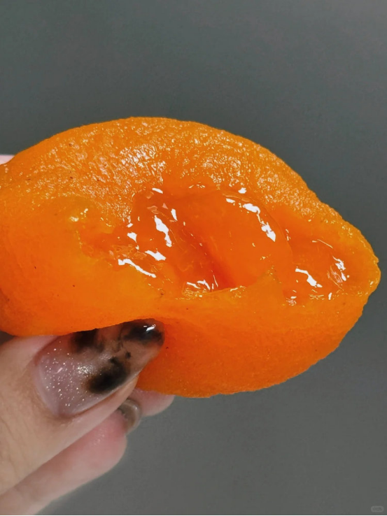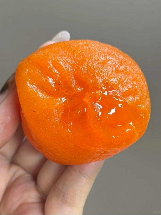 拿它跟小时候吃的传统柿饼做个直观对比🆚 含水量约50%左右❗️ 仍保留着讨喜的橘色果肉,流心质地十分诱人🥰