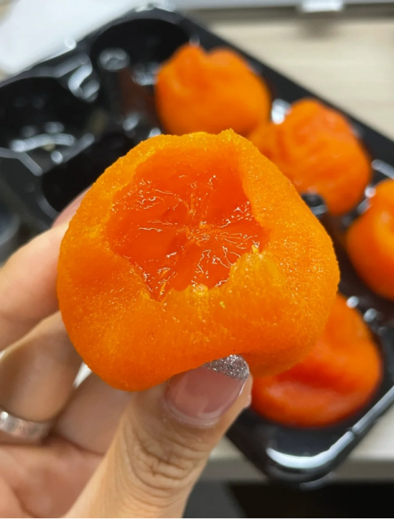✔️配料表干净!不额外加糖或添加剂 它是天然采摘后经过低温烘烤得到的产物 虽甜蜜,却不会过分甜腻,一家老幼都可以吃 从冰箱取出解冻半小时后😆 撕开柔韧的表皮,细腻绵密的流心顷刻间涌出