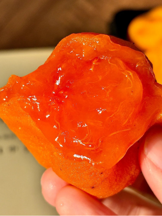 💥相较于吃到的其他冰柿 这一款介于鲜柿与柿饼之间而更偏向鲜柿 内芯的果浆几乎完整的保留了 鲜柿的水润甜美和浓郁柿子香🤩 一咬开,蛋黄般的冰糖流心像蜂蜜一样缓缓流出🍯 轻咬一口,甜蜜直接透过喉咙,直击心底 同时,它还保有柿子的丰富营养👏🏻 含有大量的维生素、胡萝卜素、人体所需的各种微量元素等 真的很强烈推荐大家都尝尝!