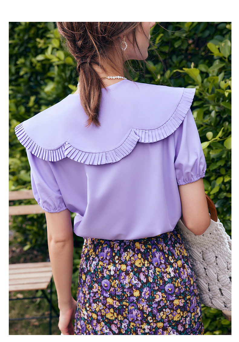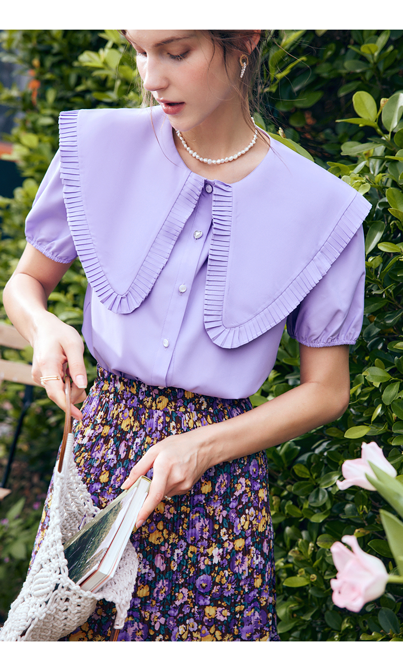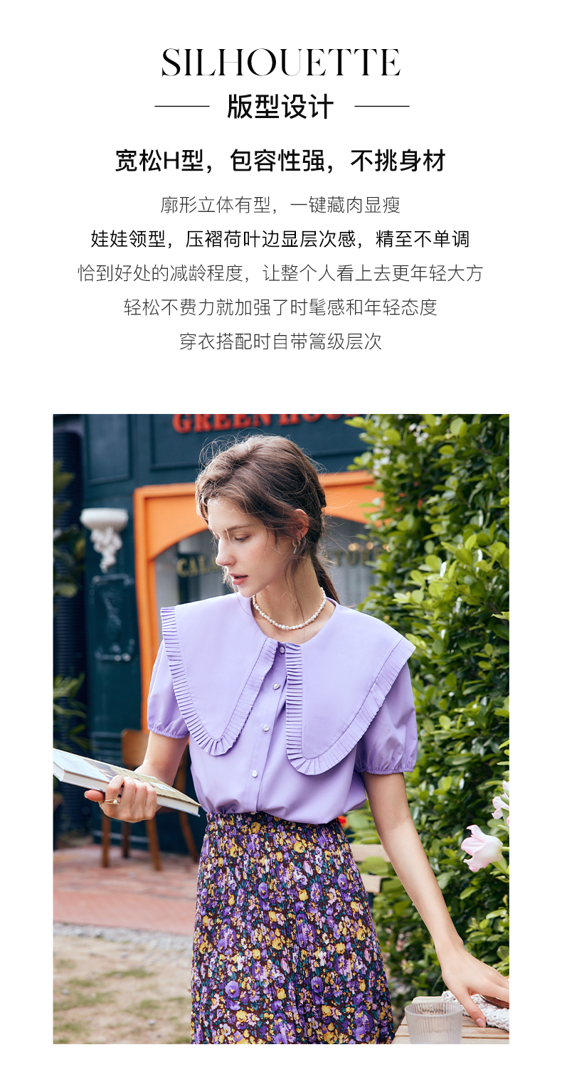 欧芮儿OLrain法式娃娃领紫色衬衫女夏季2022新款宽松泡泡袖衬衣