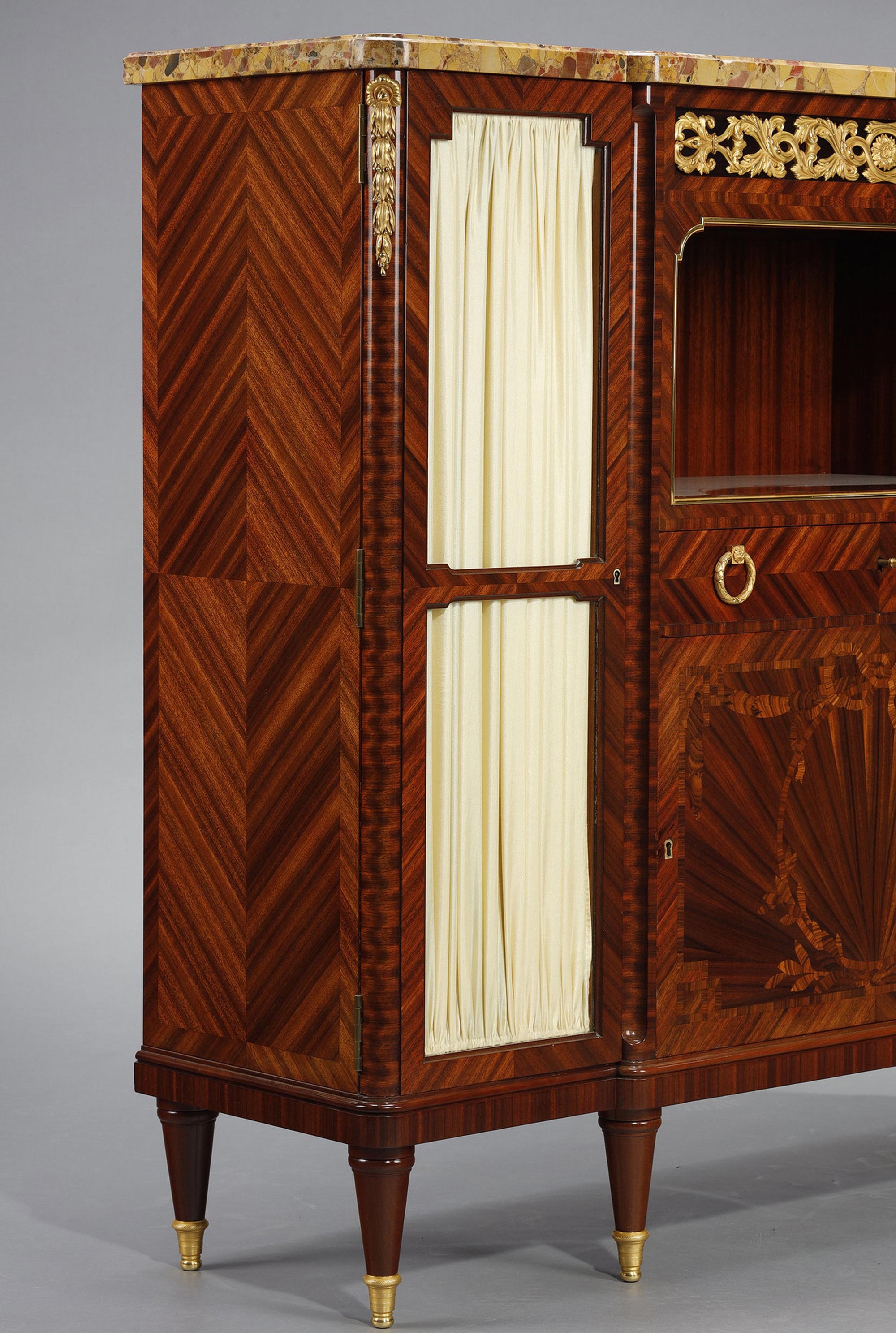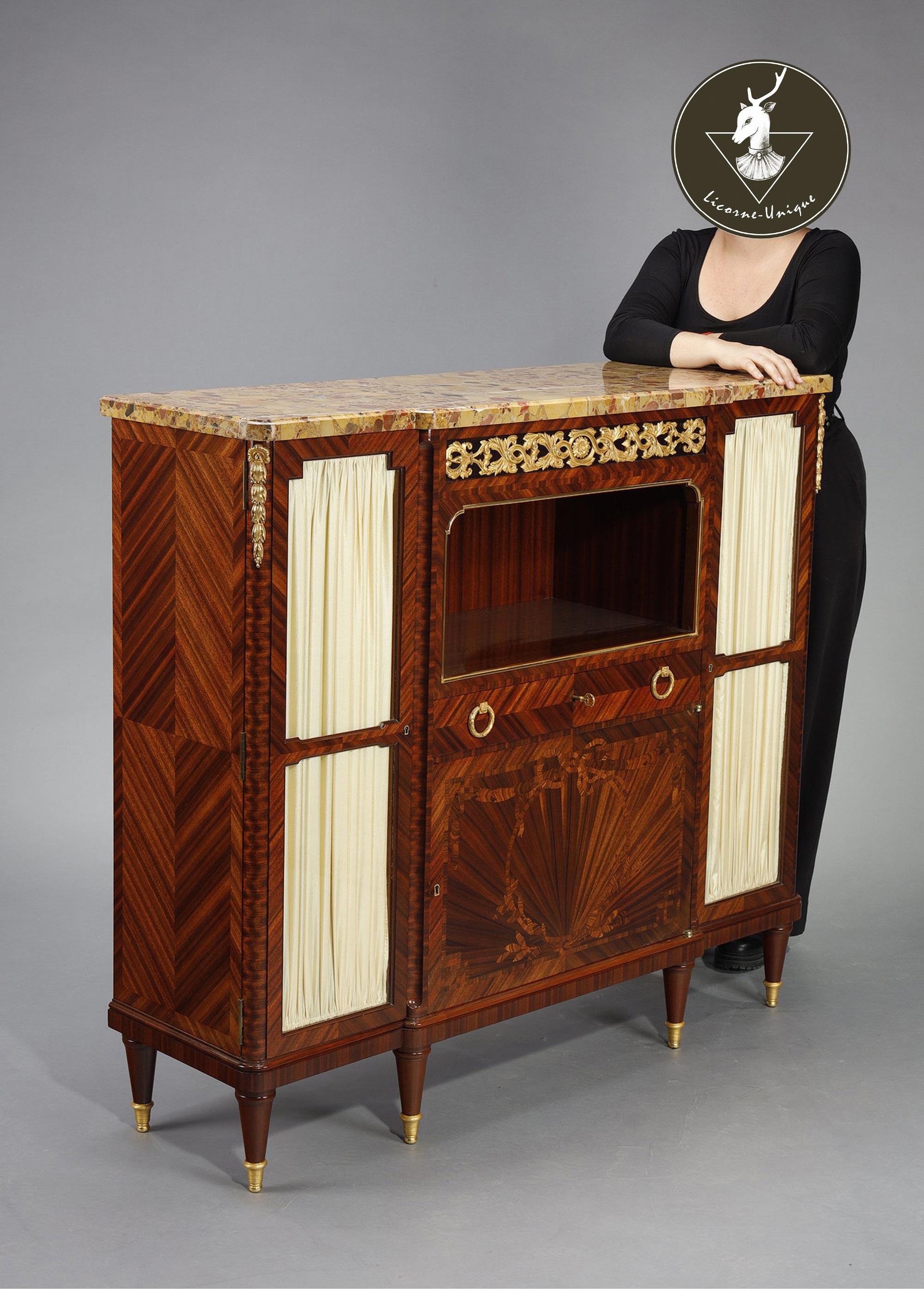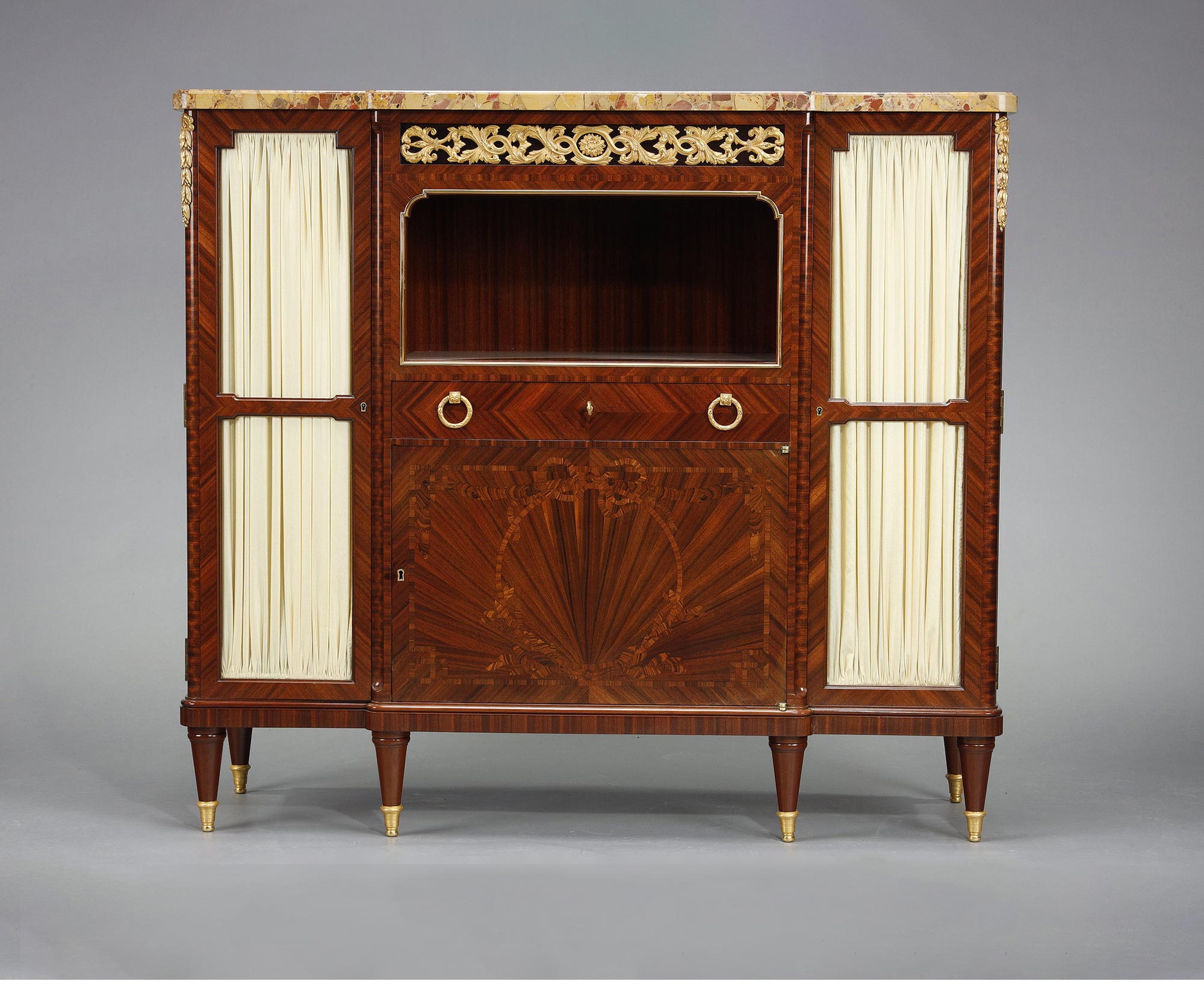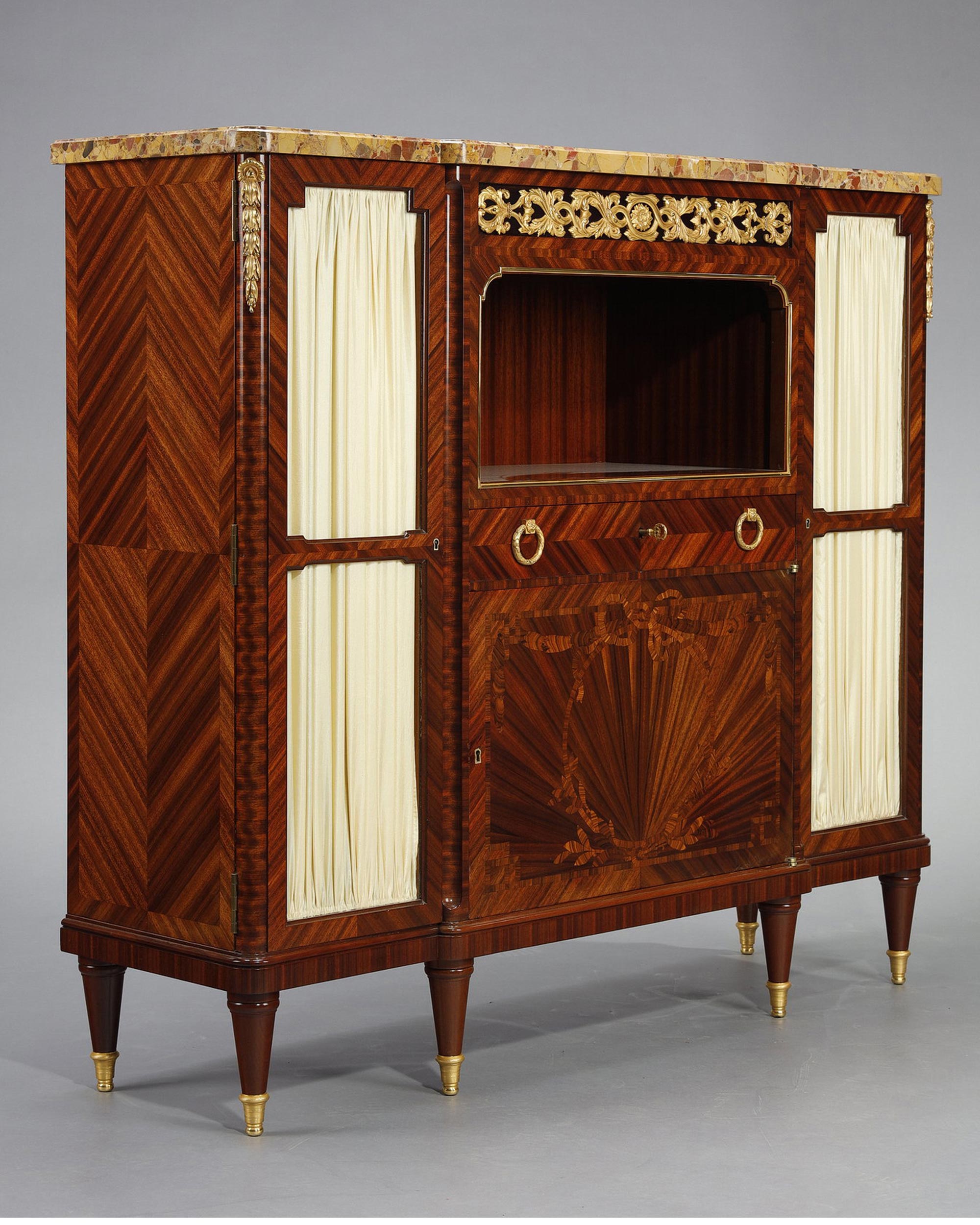 1890年代法国家具名坊SORMANI签名出品路易十六风格铜鎏金雕饰嵌大理石台面硬木玻璃柜