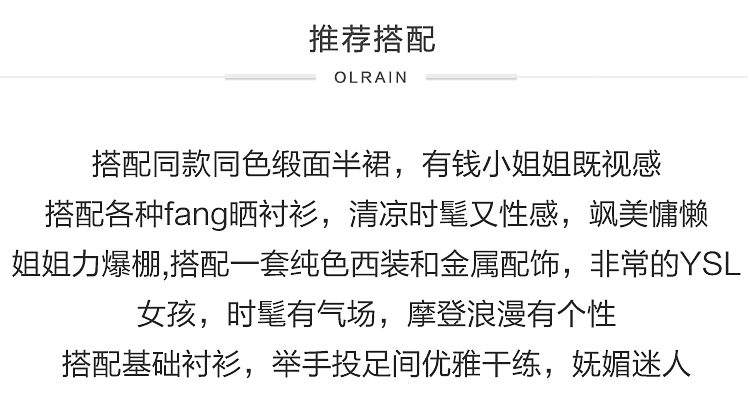 “精致”是欧芮儿olrain品牌文化的核心,欧芮儿认为,精致的女人,不但要外在动人,更要内在迷人,内外兼修,有魅力、有气质、有内涵,自信而不自傲,优雅而不矫揉,自有万种风情而不轻浮,更不故作矜持。