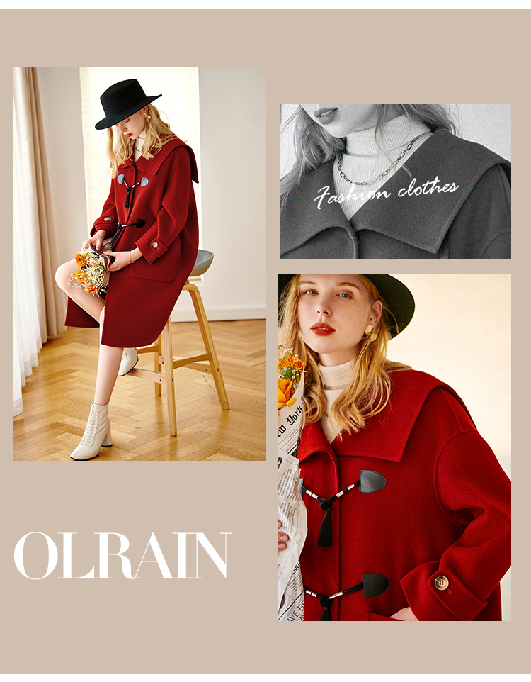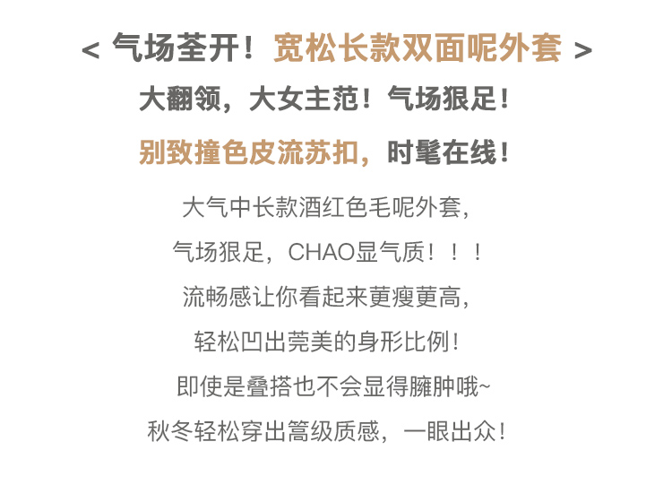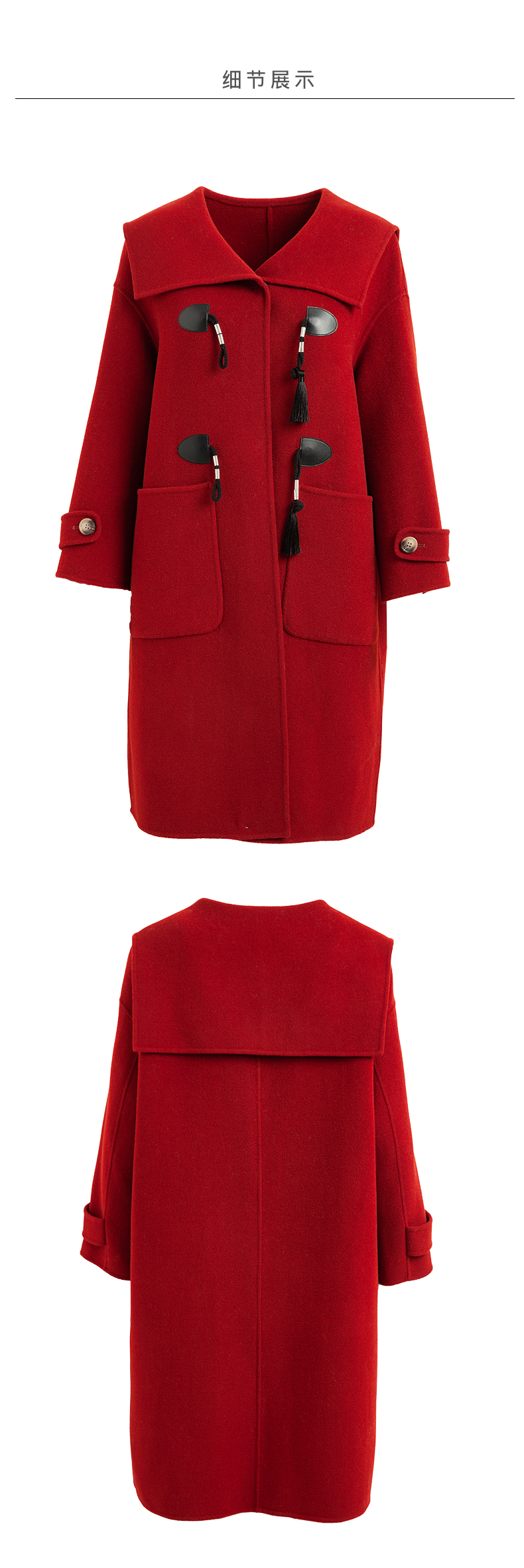 欧芮儿双面呢中长款外套女冬季新款大翻领酒红色呢大衣