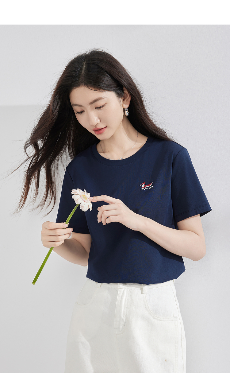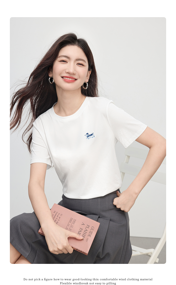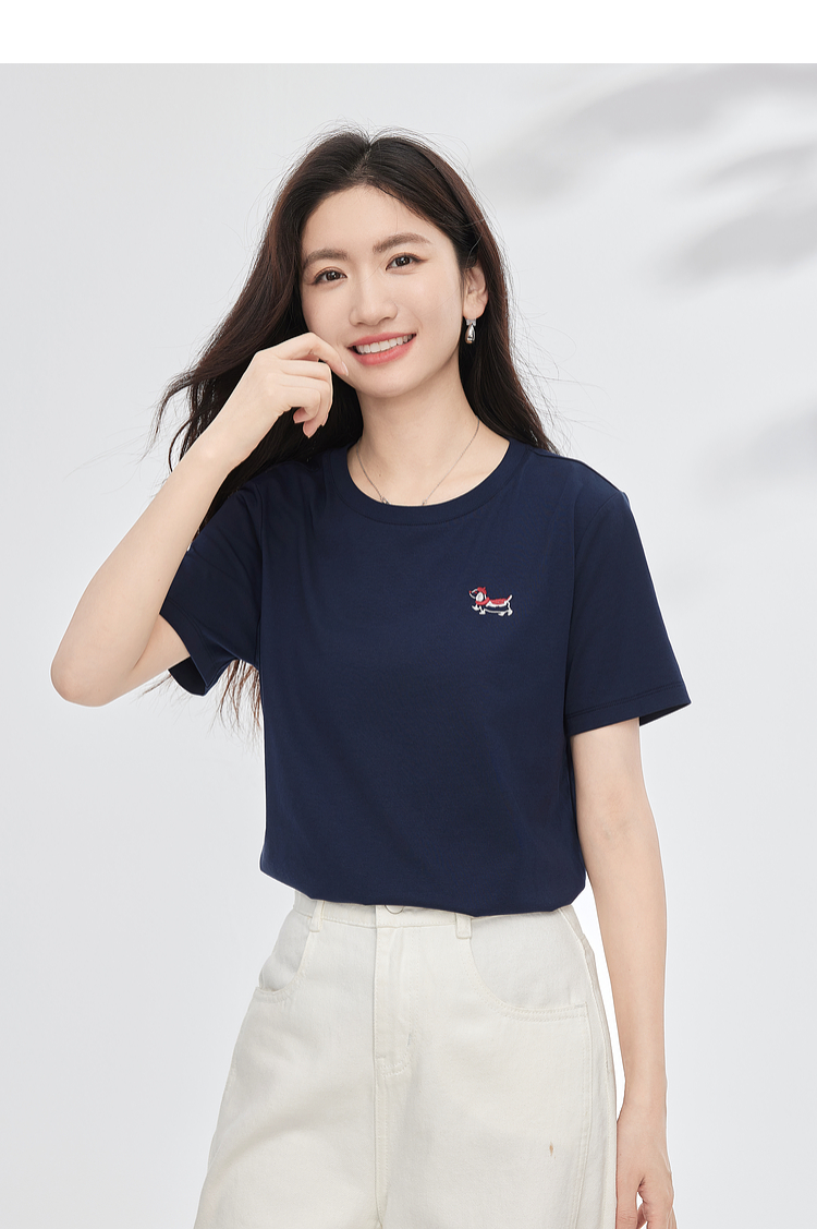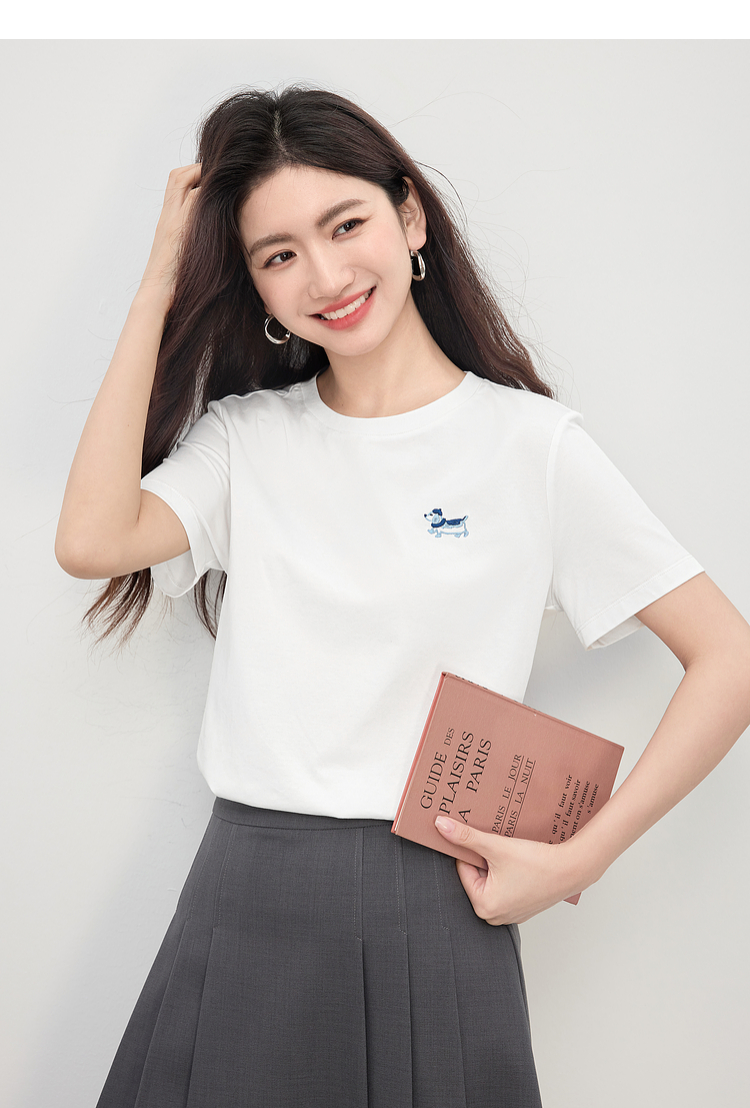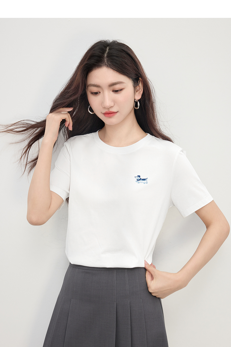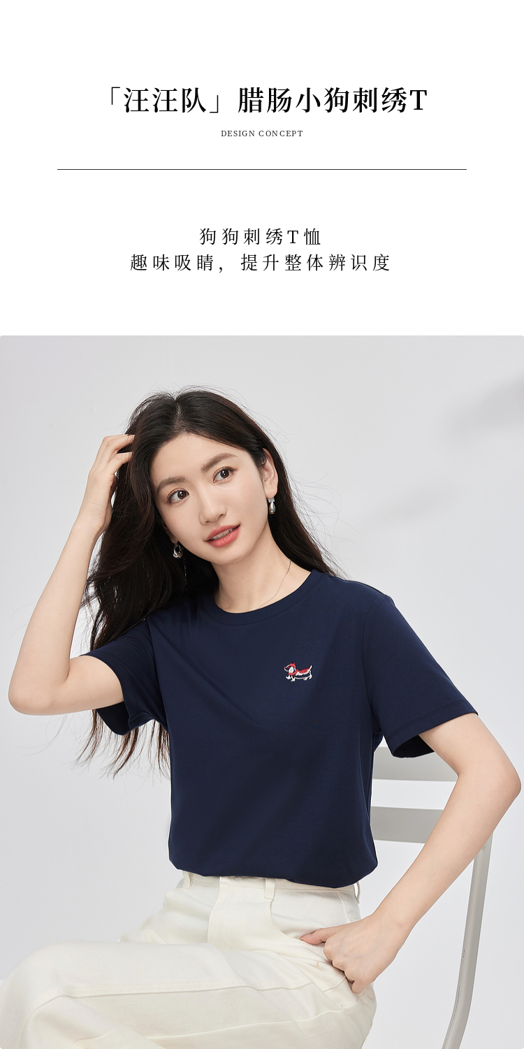 【周末秒杀】熙世界腊肠小狗刺绣T恤女短袖2025夏季新款清爽百搭气质圆领上衣
