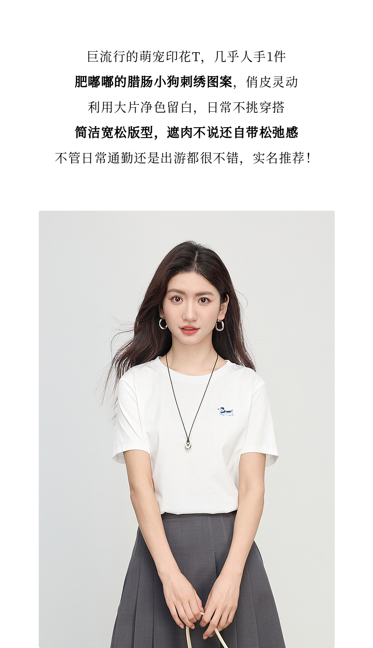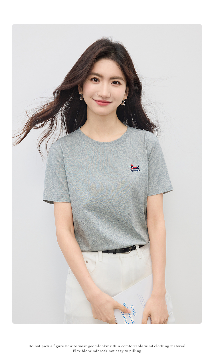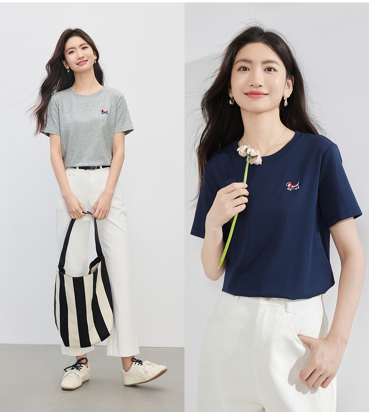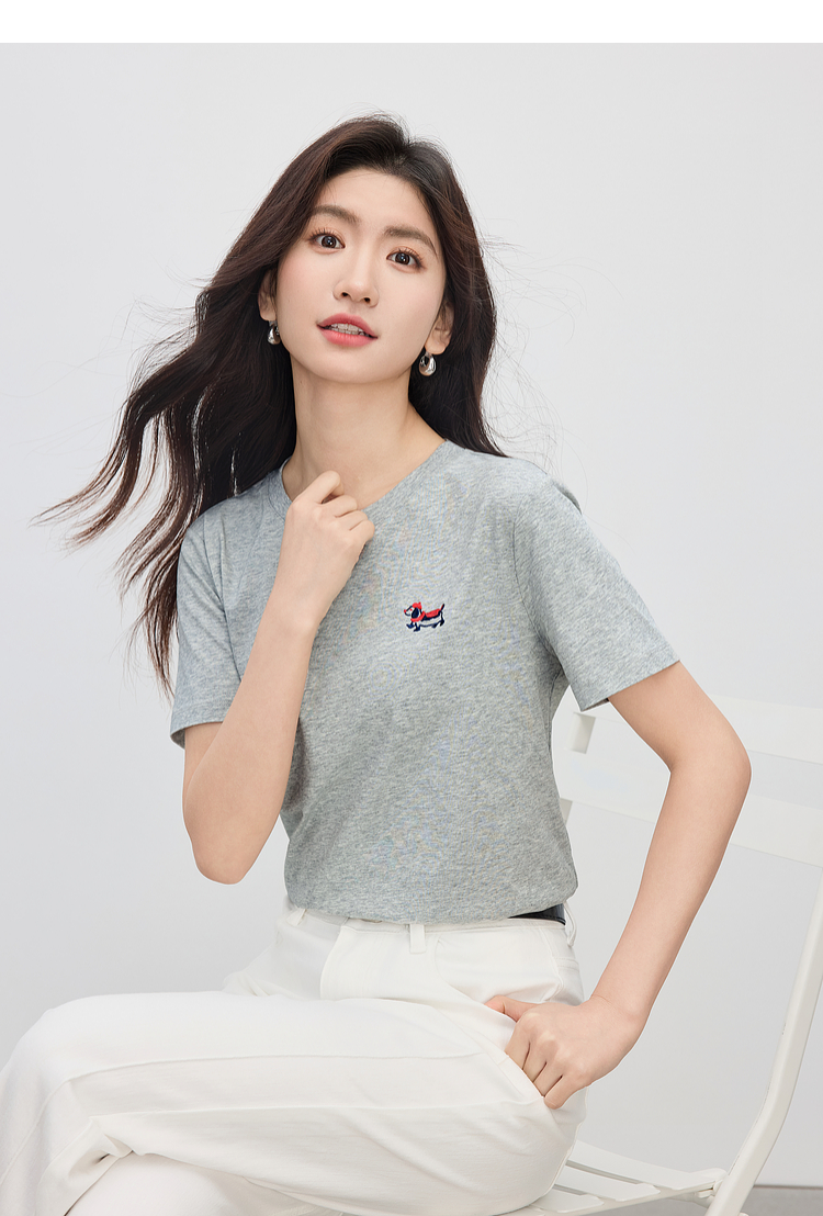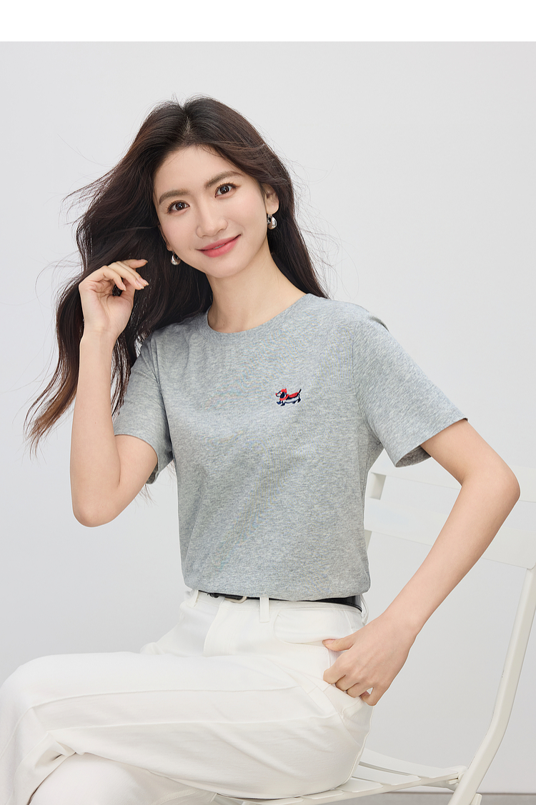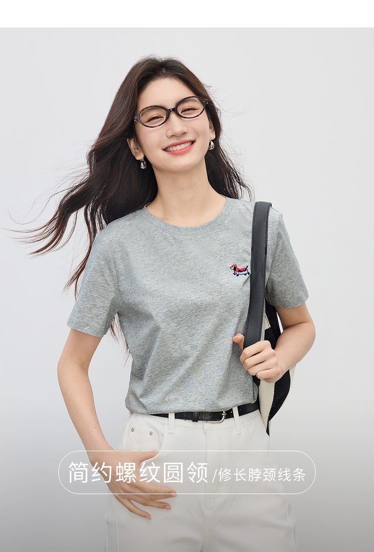 【周末秒杀】熙世界腊肠小狗刺绣T恤女短袖2025夏季新款清爽百搭气质圆领上衣