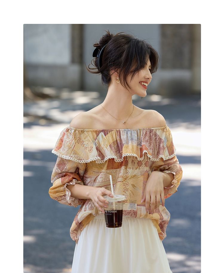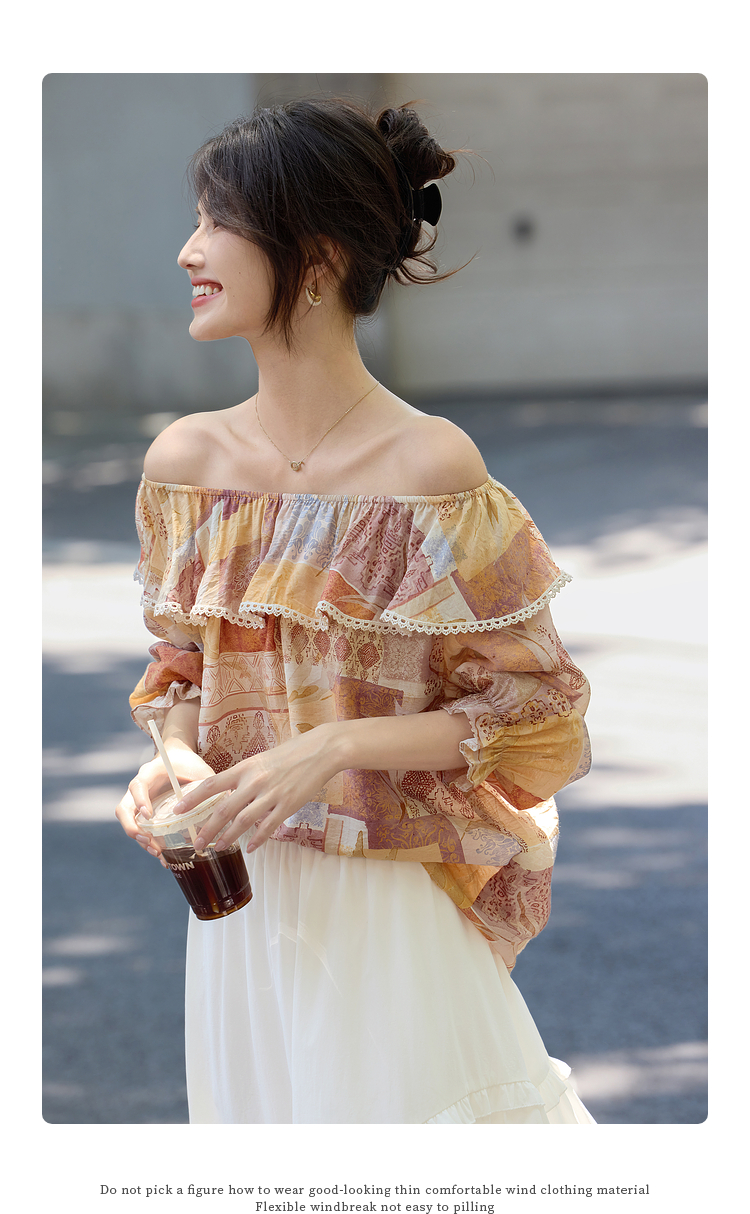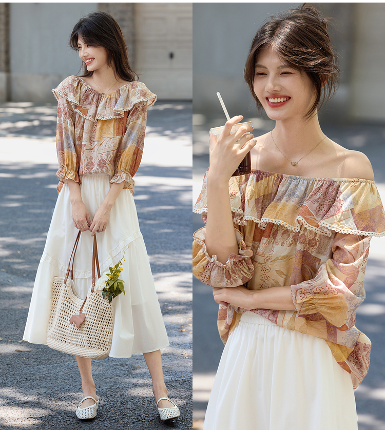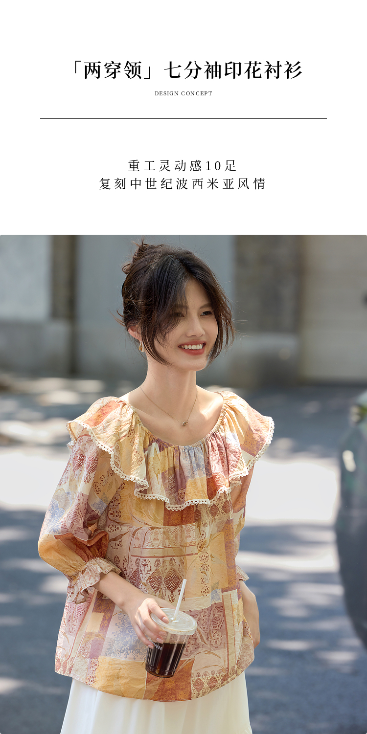 【08/06新品】熙世界荷叶边一字肩两穿印花衬衫女2025夏秋波西米亚风七分袖上衣